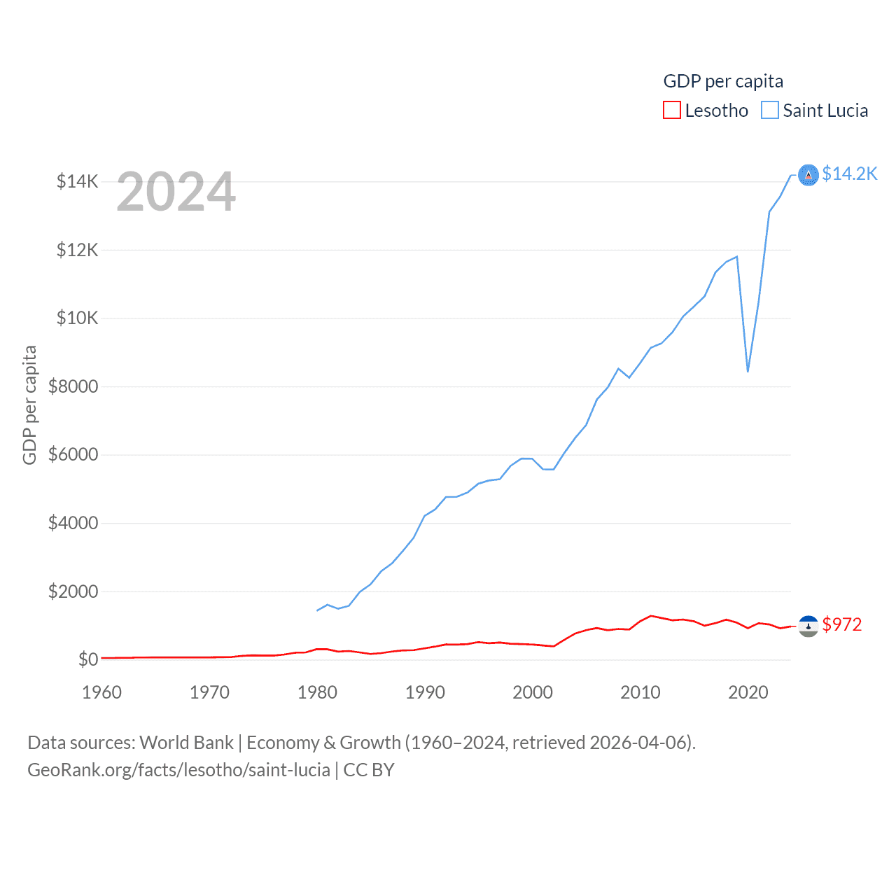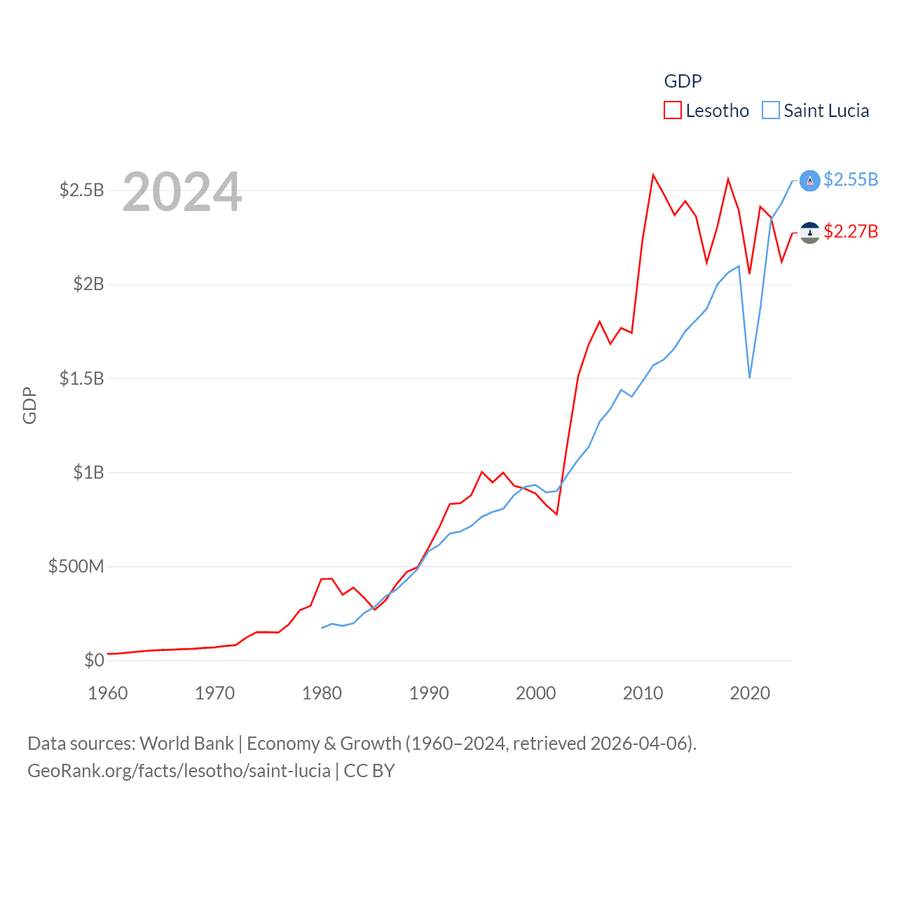 By GDP, Lesotho ranks 175/197 ($2.27B) and Saint Lucia ranks 173/197 ($2.55B). By GDP per capita, Lesotho ranks 181/197 ($972), while Saint Lucia ranks 70/197 ($14,182).