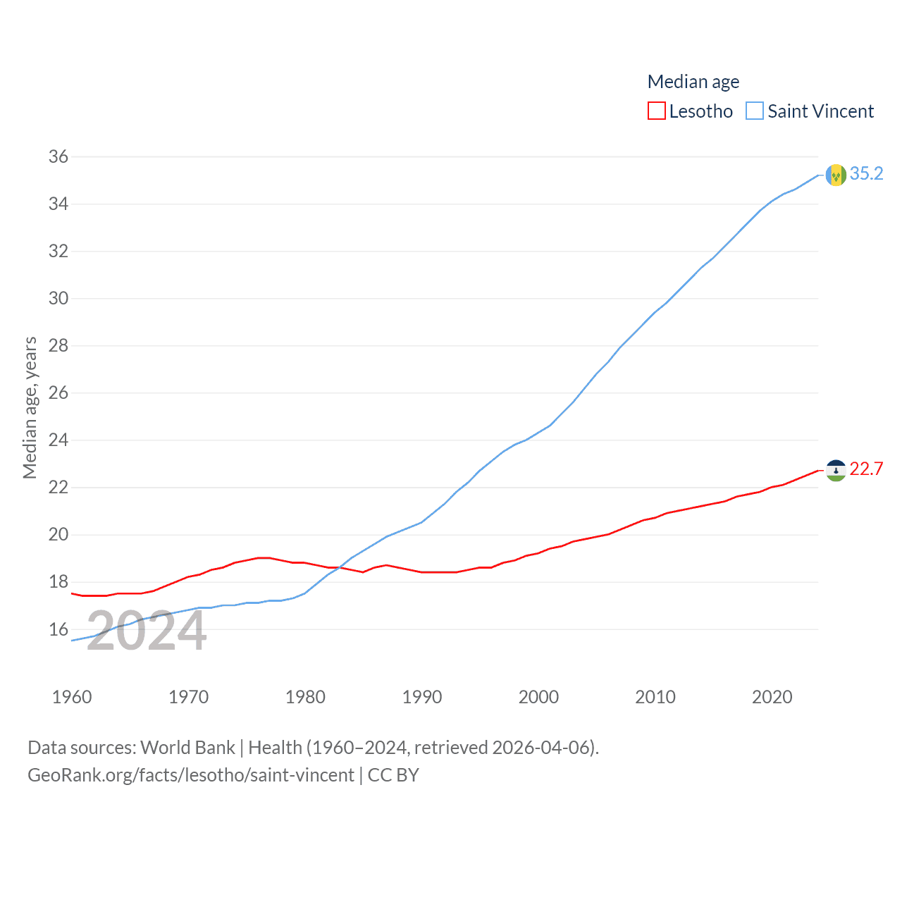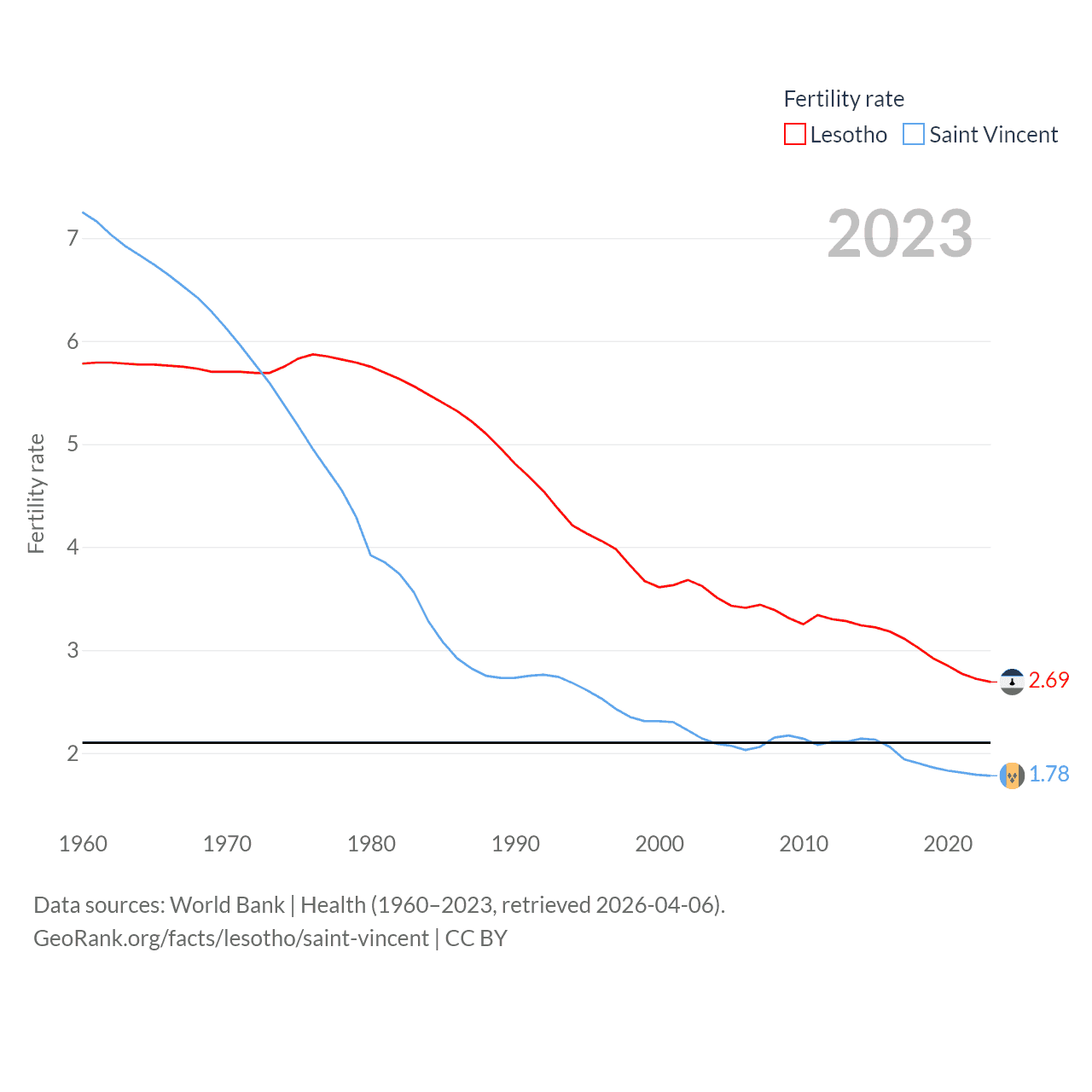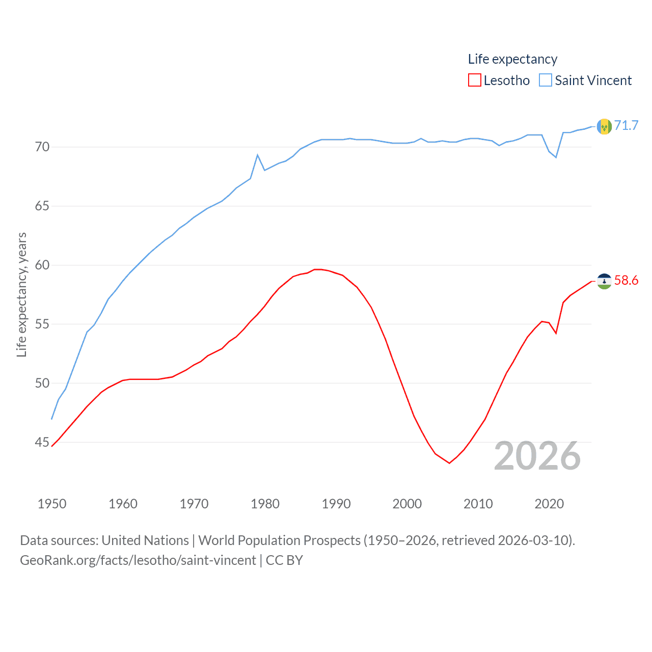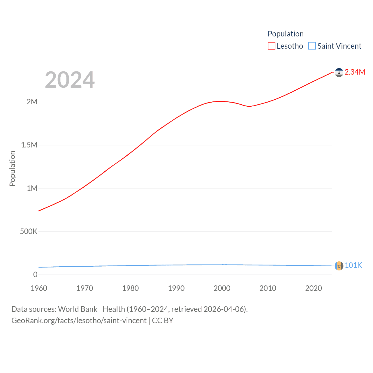 Lesotho has a population of 2.34M (ranked 145/197), compared with 101K in Saint Vincent (ranked 184/197). Lesotho's land area is 11,722 sq mi versus 150.6 sq mi for Saint Vincent (ranked 137th vs. 185th).