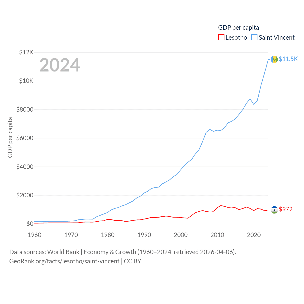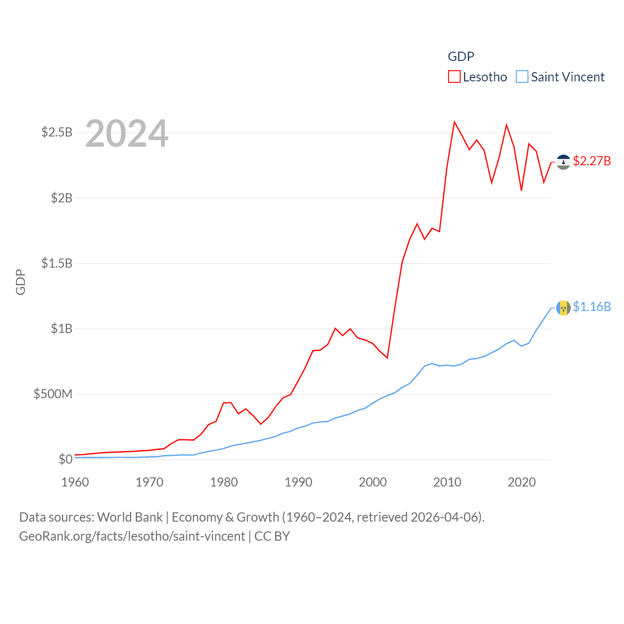 By GDP, Lesotho ranks 175/197 ($2.27B) and Saint Vincent ranks 186/197 ($1.16B). By GDP per capita, Lesotho ranks 181/197 ($972), while Saint Vincent ranks 81/197 ($11,501).