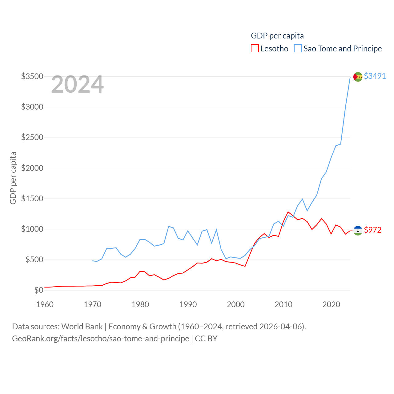 By GDP, Lesotho ranks 175/197 ($2.27B) and Sao Tome and Principe ranks 189/197 ($822M). By GDP per capita, Lesotho ranks 181/197 ($972), while Sao Tome and Principe ranks 134/197 ($3,491).