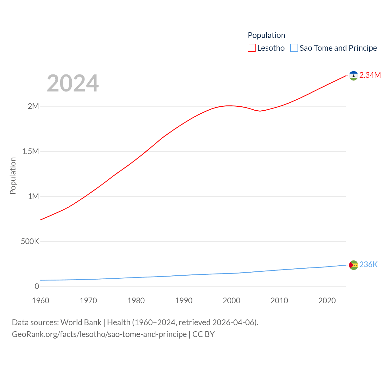 Lesotho has a population of 2.34M (ranked 145/197), compared with 236K in Sao Tome and Principe (ranked 176/197). Lesotho's land area is 11,722 sq mi versus 371 sq mi for Sao Tome and Principe (ranked 137th vs. 172nd).