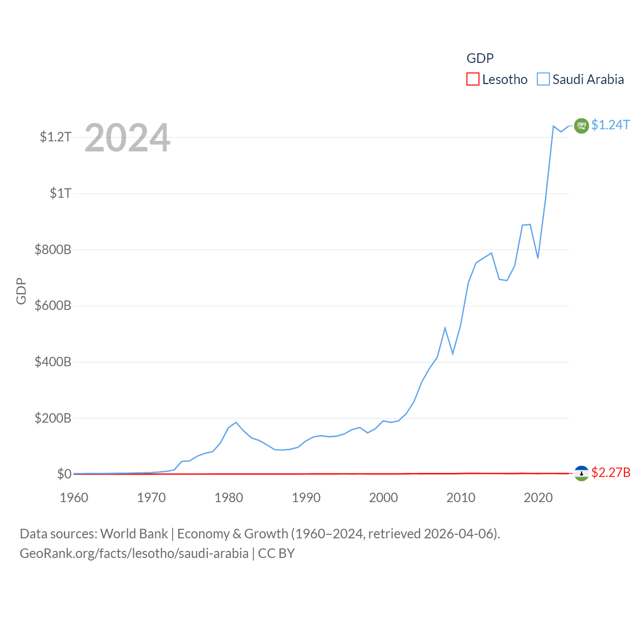 By GDP, Lesotho ranks 175/197 ($2.27B) and Saudi Arabia ranks 18/197 ($1.24T). By GDP per capita, Lesotho ranks 181/197 ($972), while Saudi Arabia ranks 33/197 ($35,122).
