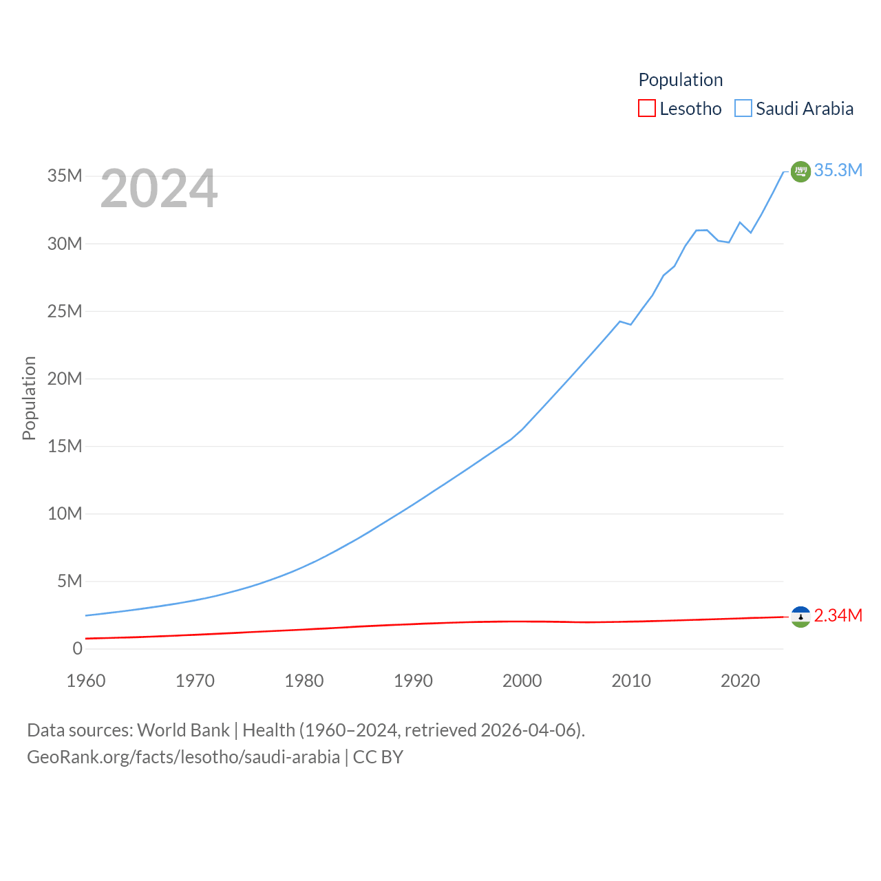 Lesotho has a population of 2.34M (ranked 145/197), compared with 35.3M in Saudi Arabia (ranked 45/197). Lesotho's land area is 11,722 sq mi versus 830,000 sq mi for Saudi Arabia (ranked 137th vs. 12th).
