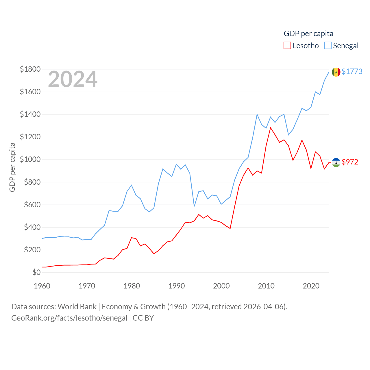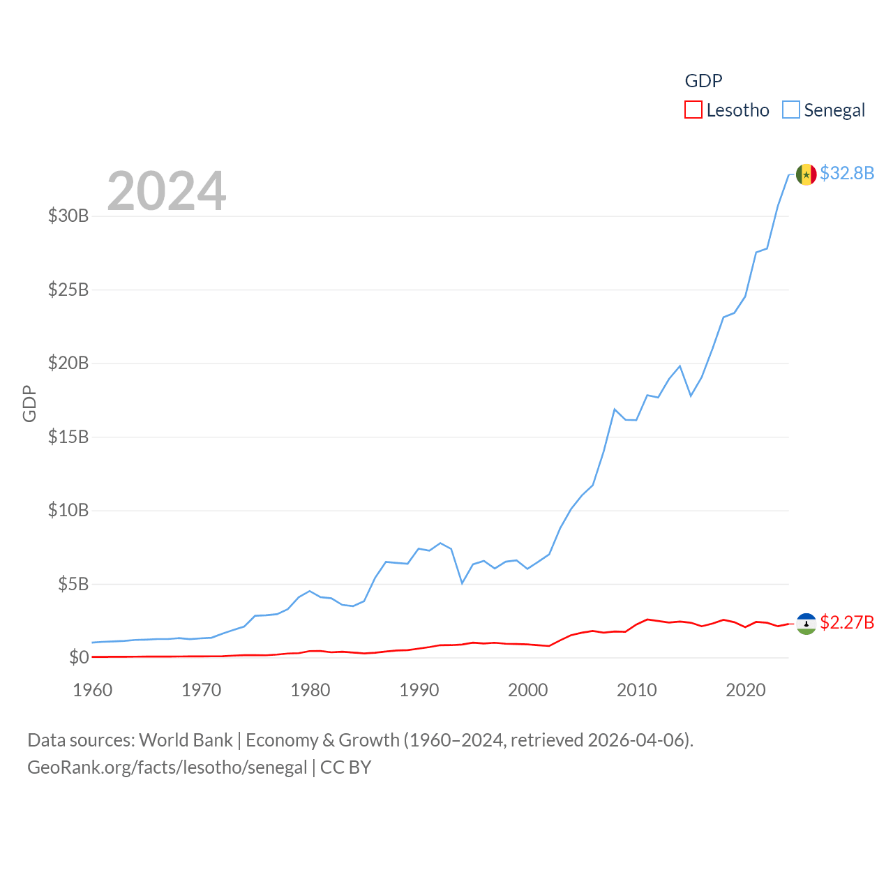 By GDP, Lesotho ranks 175/197 ($2.27B) and Senegal ranks 109/197 ($32.8B). By GDP per capita, Lesotho ranks 181/197 ($972), while Senegal ranks 159/197 ($1,773).