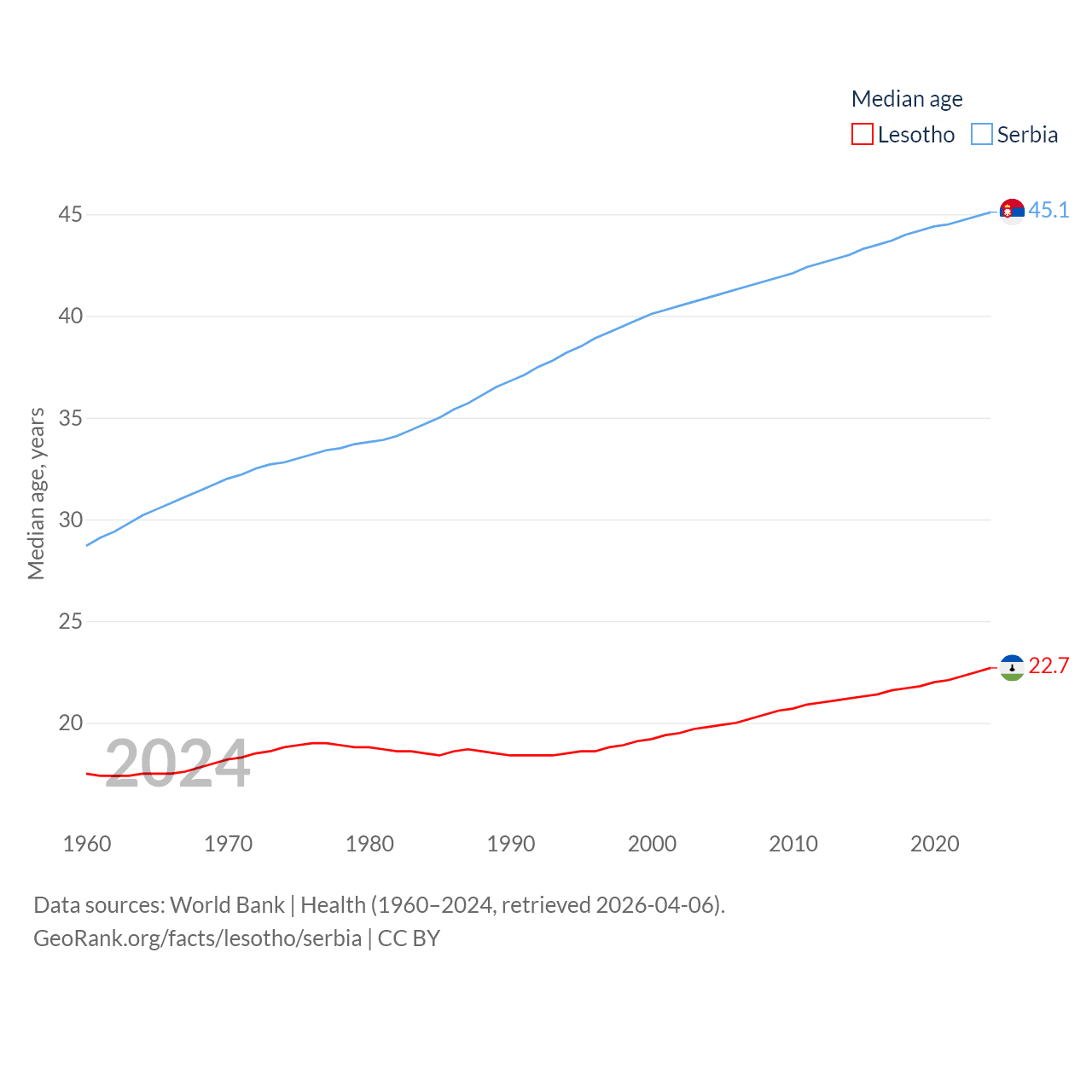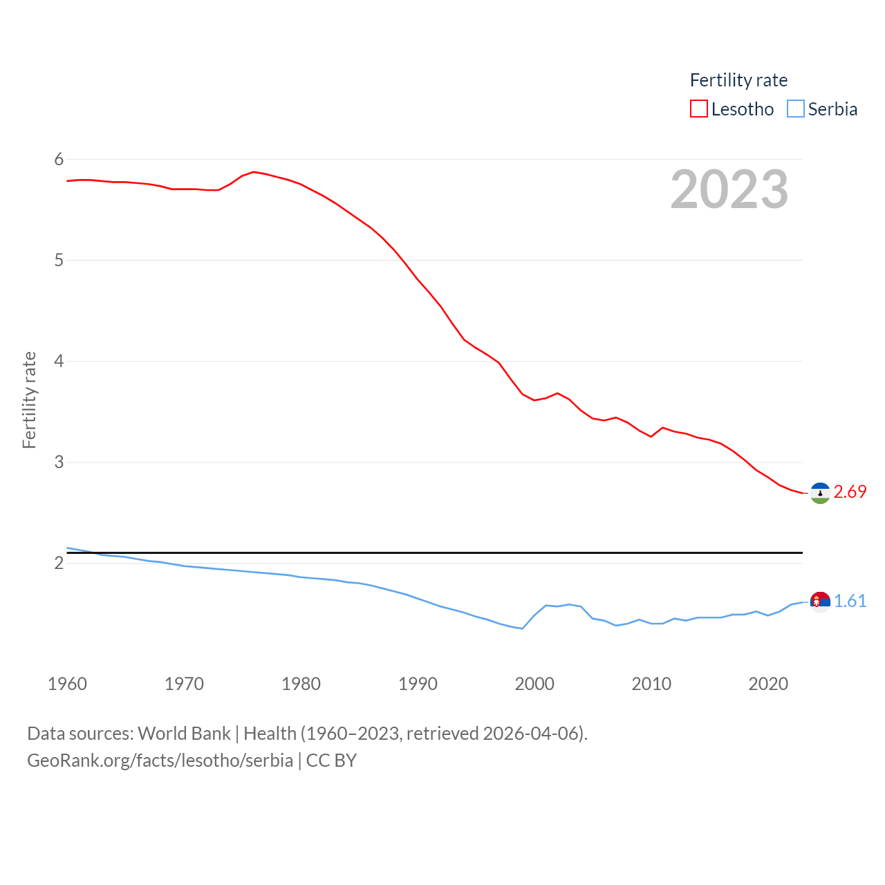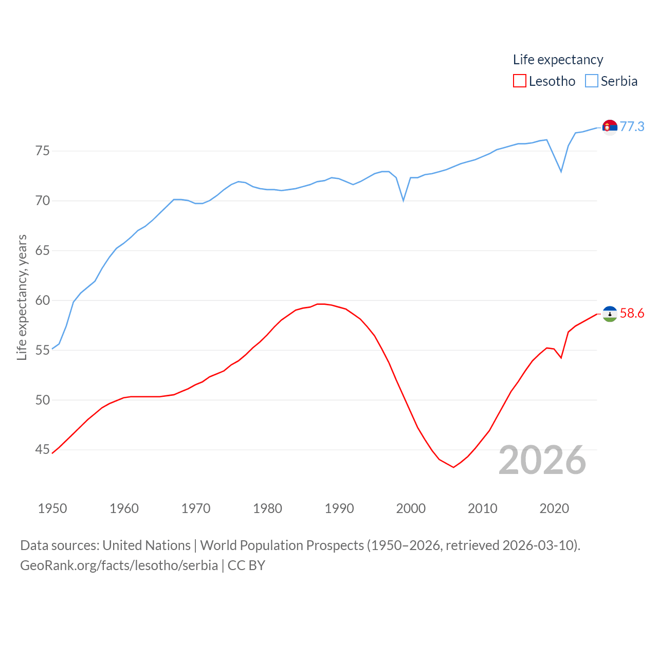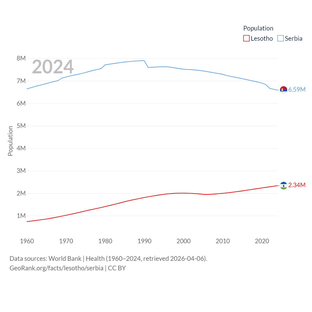 Lesotho has a population of 2.34M (ranked 145/197), compared with 6.59M in Serbia (ranked 109/197). Lesotho's land area is 11,722 sq mi versus 32,467 sq mi for Serbia (ranked 137th vs. 111th).