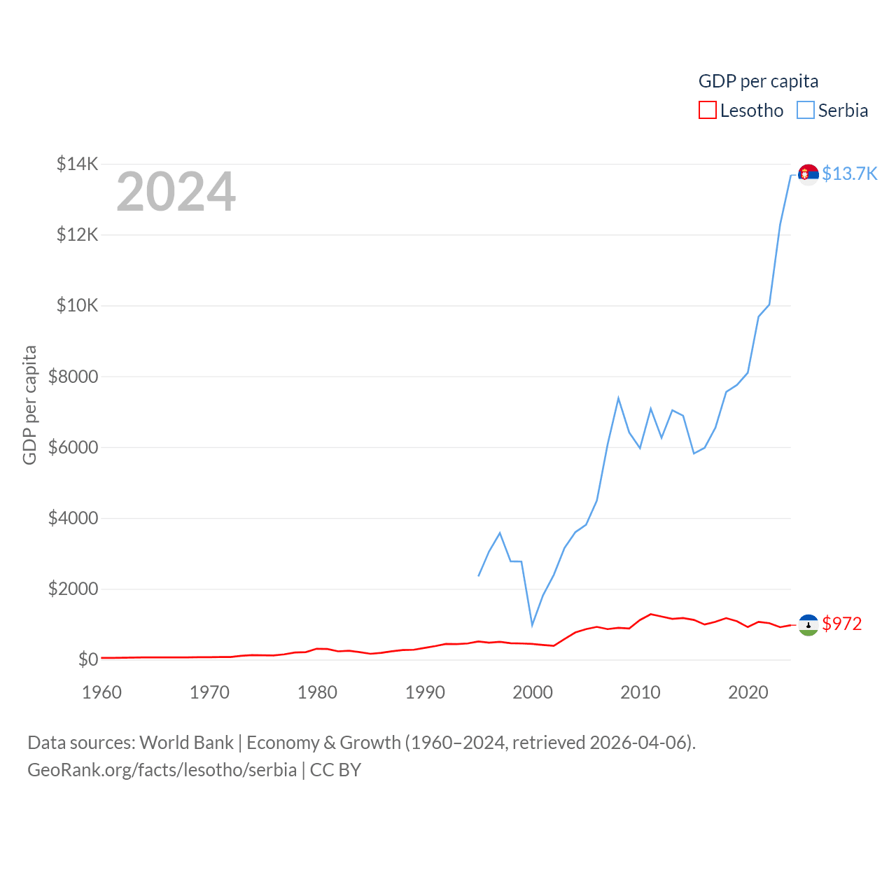 By GDP, Lesotho ranks 175/197 ($2.27B) and Serbia ranks 76/197 ($90.1B). By GDP per capita, Lesotho ranks 181/197 ($972), while Serbia ranks 73/197 ($13,679).
