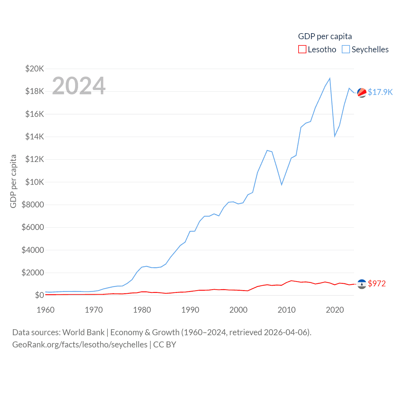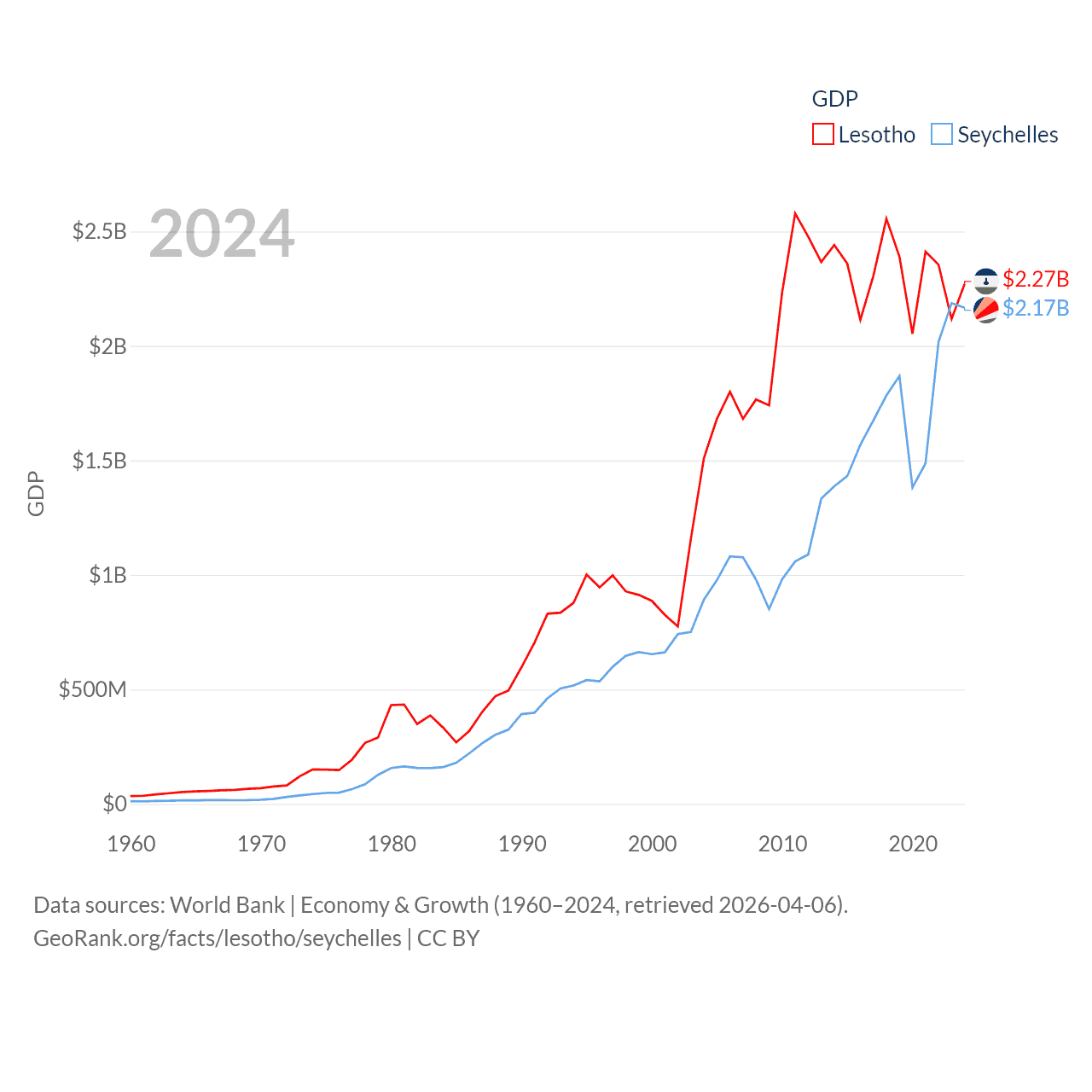 By GDP, Lesotho ranks 175/197 ($2.27B) and The Seychelles ranks 178/197 ($2.17B). By GDP per capita, Lesotho ranks 181/197 ($972), while The Seychelles ranks 63/197 ($17,859).