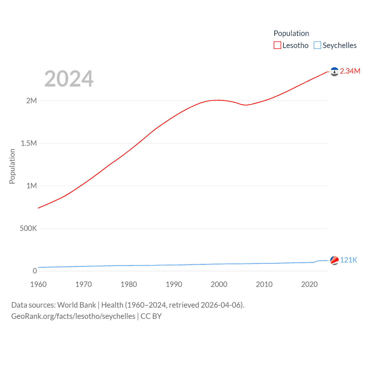 Lesotho has a population of 2.34M (ranked 145/197), compared with 121K in The Seychelles (ranked 181/197). Lesotho's land area is 11,722 sq mi versus 177.6 sq mi for The Seychelles (ranked 137th vs. 181st).