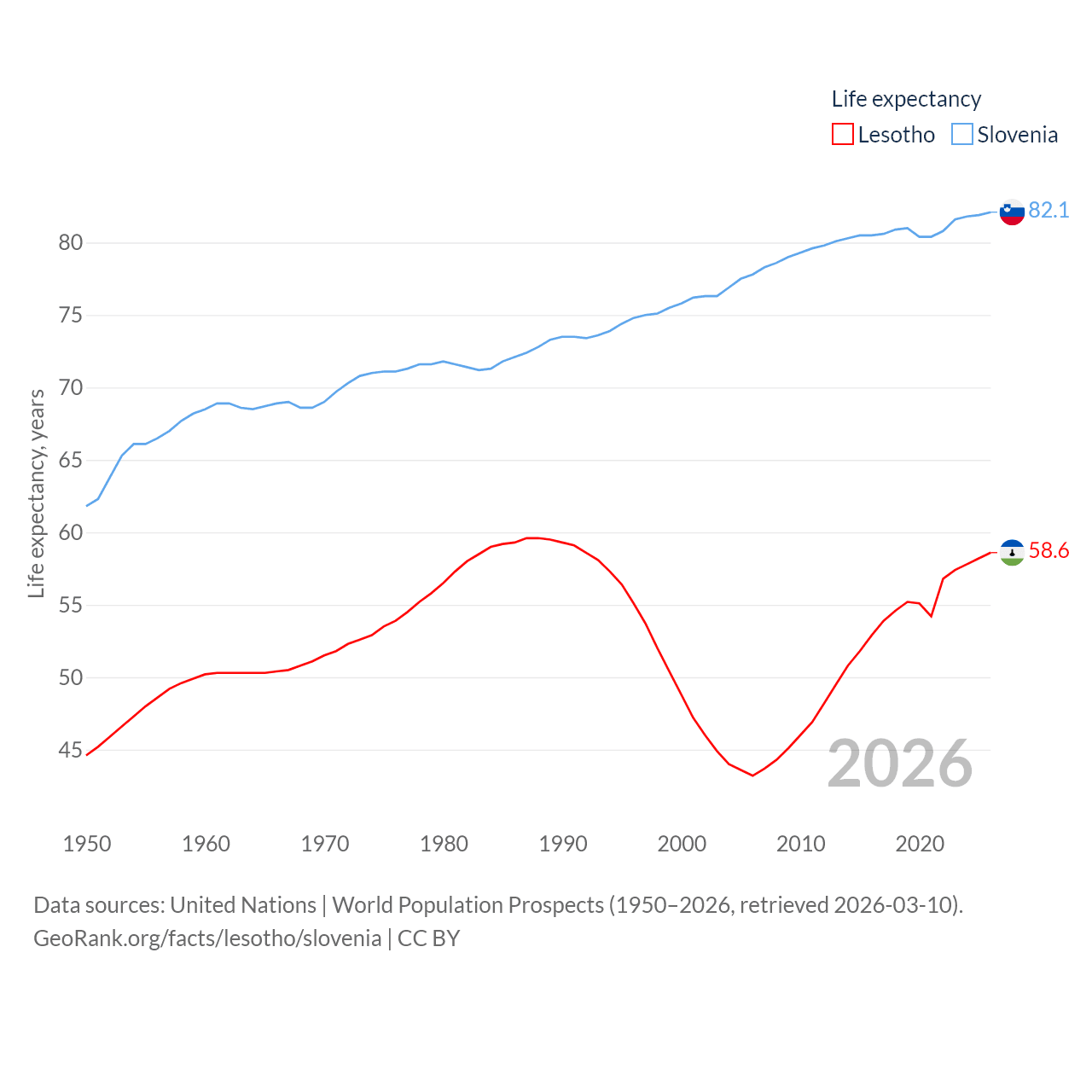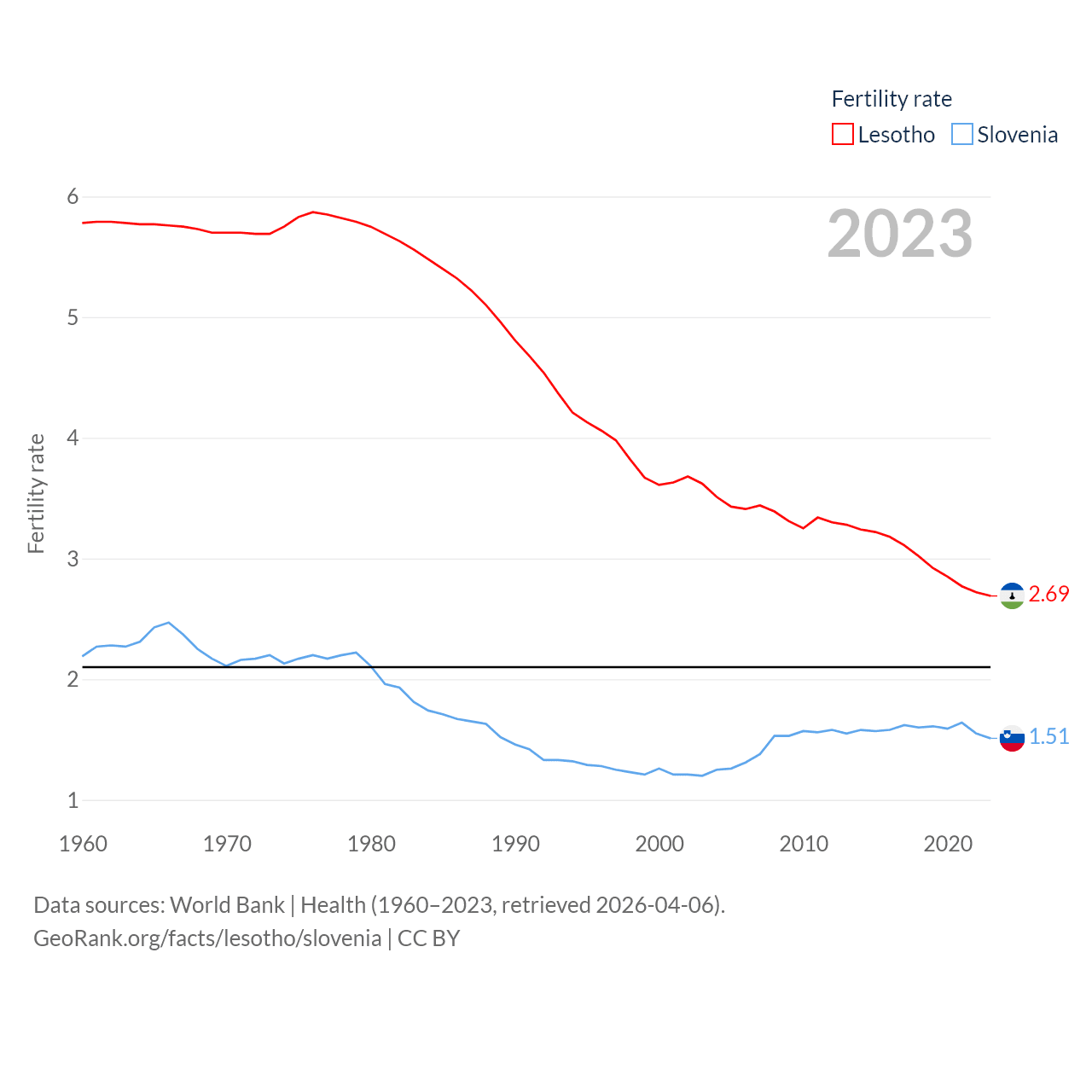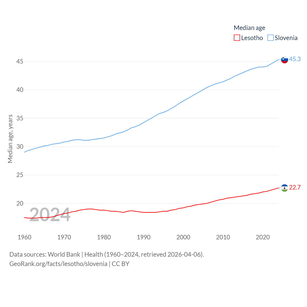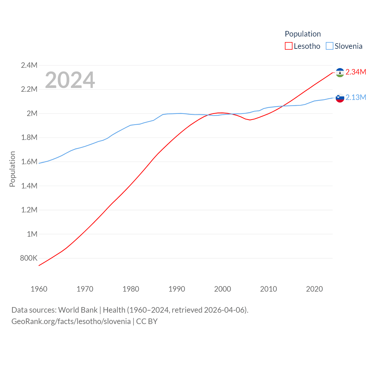 Lesotho has a population of 2.34M (ranked 145/197), compared with 2.13M in Slovenia (ranked 147/197). Lesotho's land area is 11,722 sq mi versus 7,774 sq mi for Slovenia (ranked 137th vs. 151st).