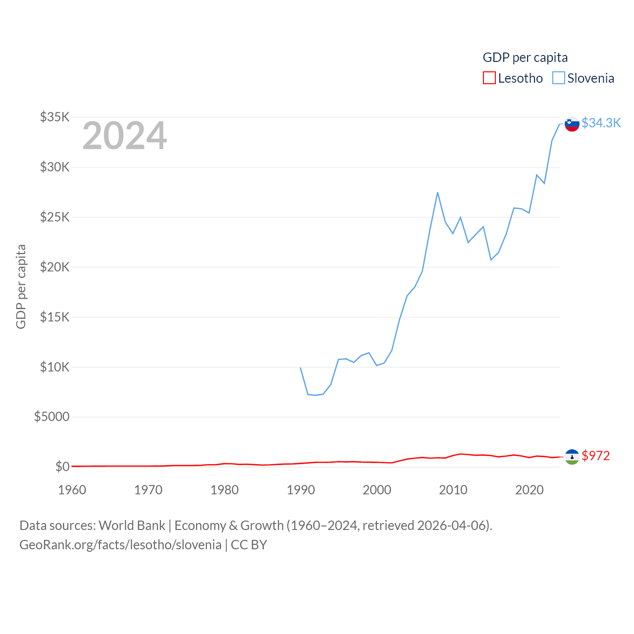 By GDP, Lesotho ranks 175/197 ($2.27B) and Slovenia ranks 86/197 ($73B). By GDP per capita, Lesotho ranks 181/197 ($972), while Slovenia ranks 34/197 ($34,301).