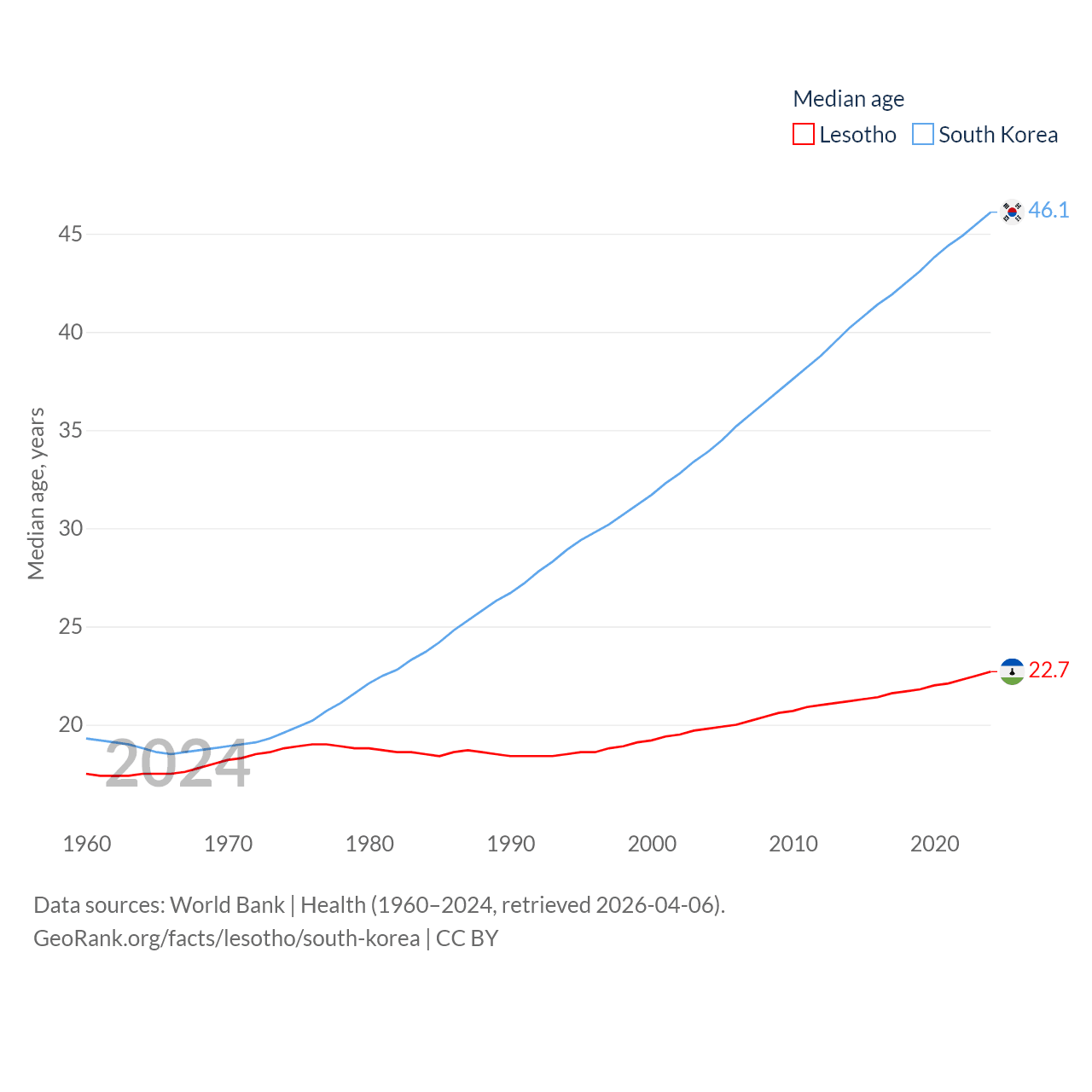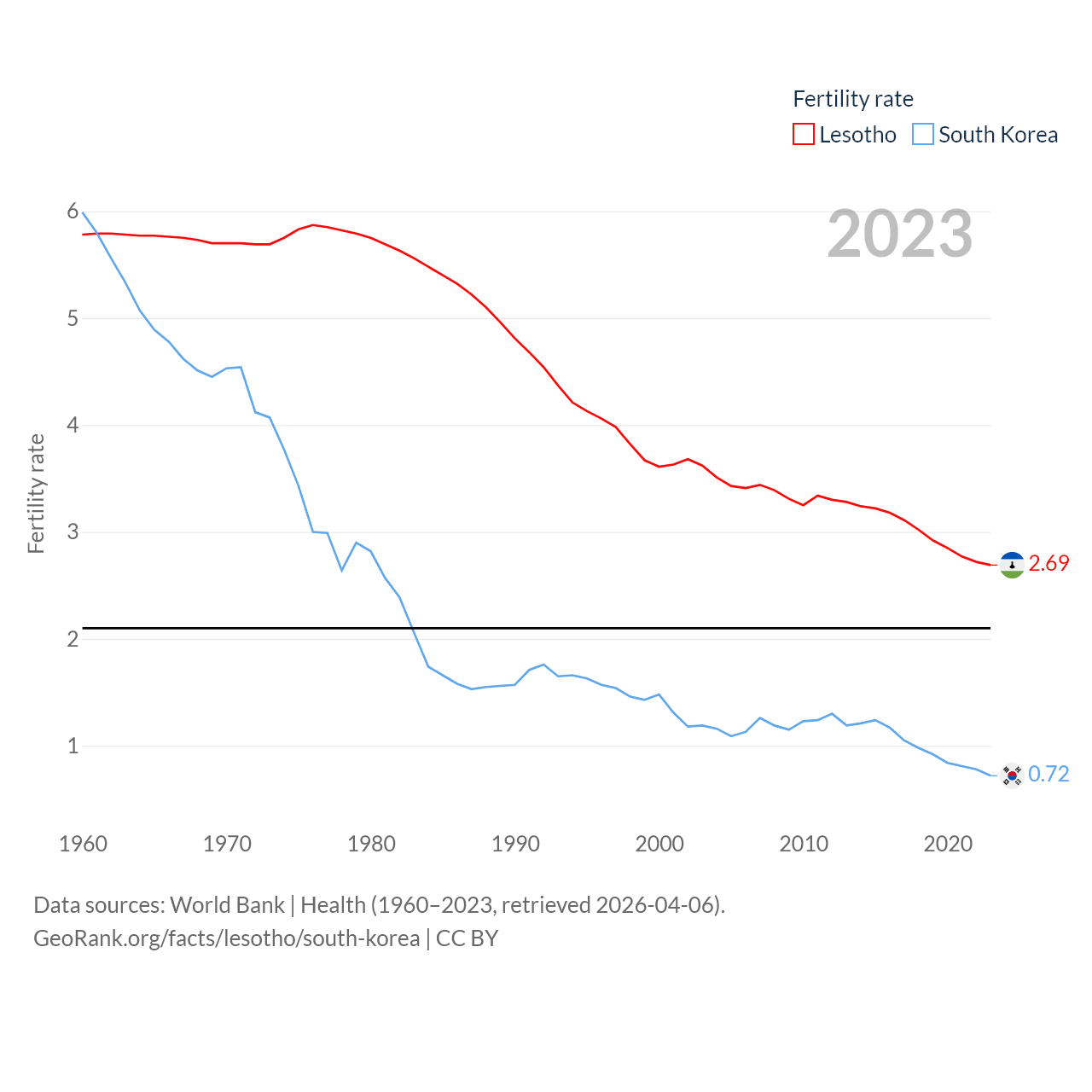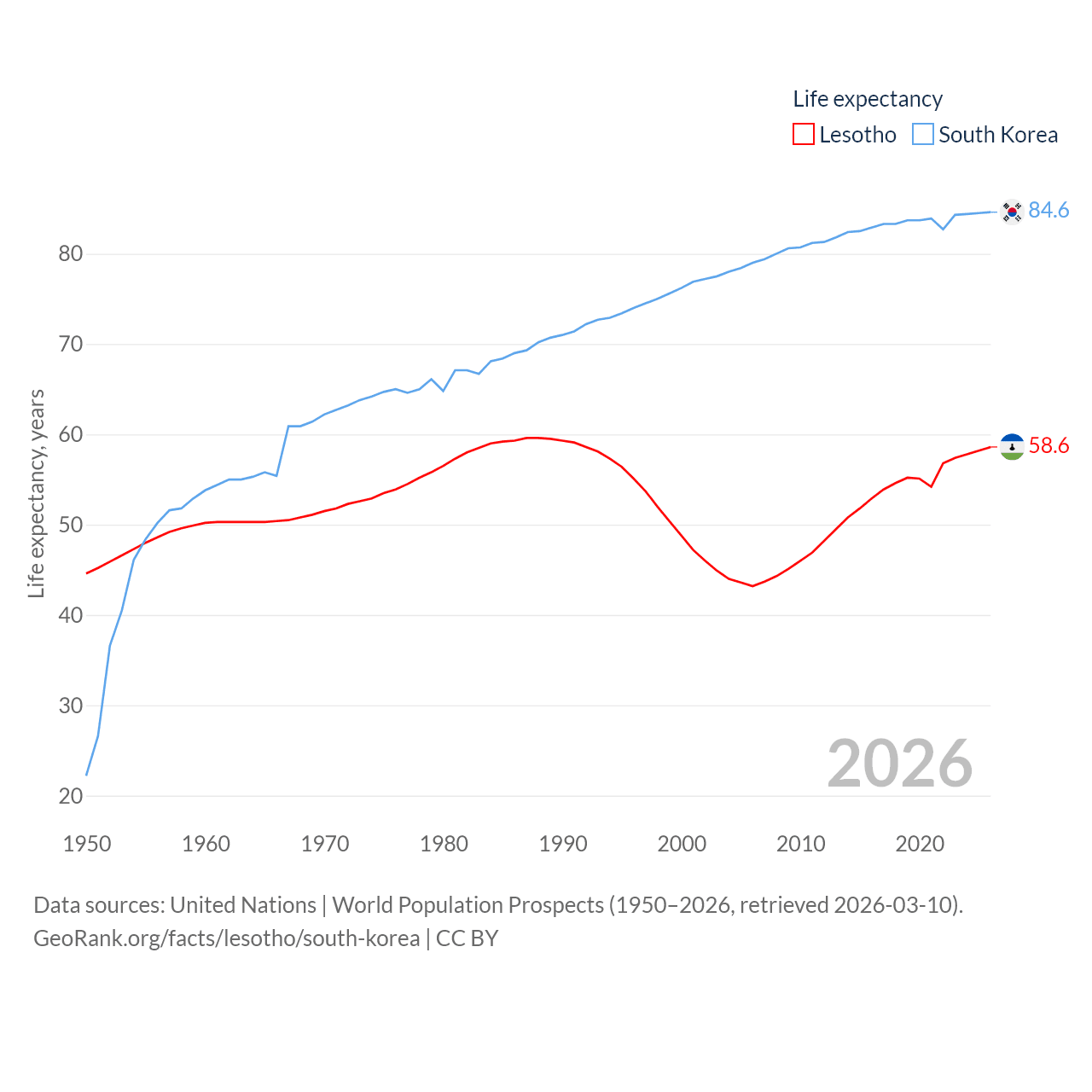 Lesotho has a population of 2.34M (ranked 145/197), compared with 51.8M in South Korea (ranked 29/197). Lesotho's land area is 11,722 sq mi versus 37,684 sq mi for South Korea (ranked 137th vs. 105th).