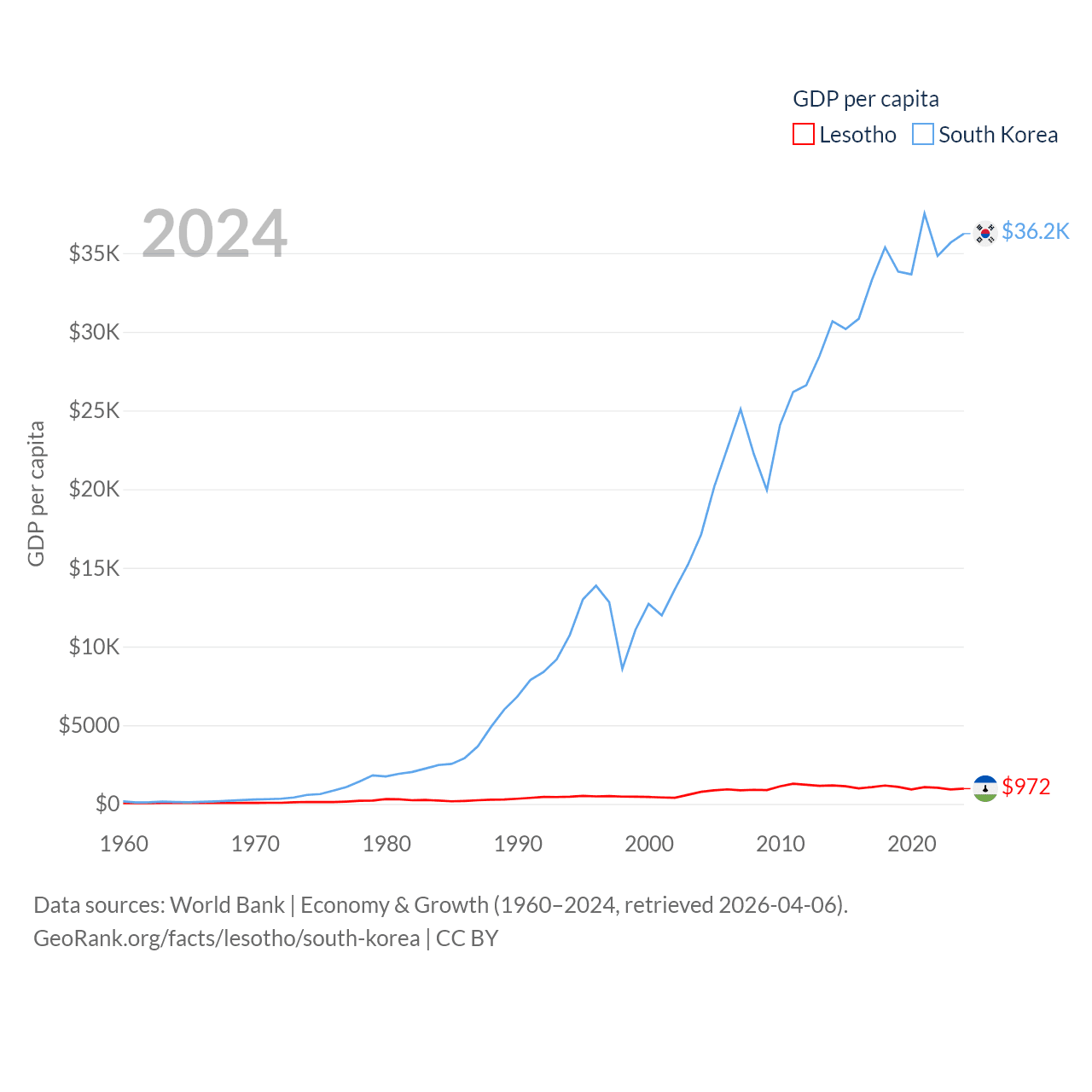 By GDP, Lesotho ranks 175/197 ($2.27B) and South Korea ranks 12/197 ($1.88T). By GDP per capita, Lesotho ranks 181/197 ($972), while South Korea ranks 31/197 ($36,239).