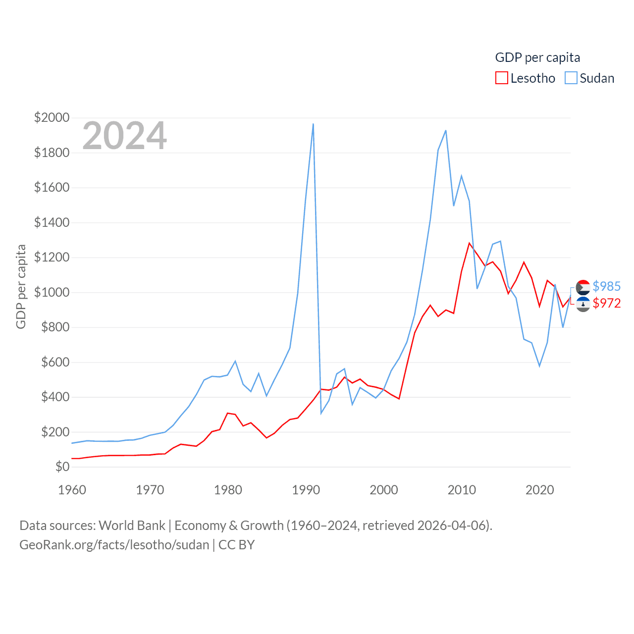 By GDP, Lesotho ranks 175/197 ($2.27B) and Sudan ranks 94/197 ($49.7B). By GDP per capita, Lesotho ranks 181/197 ($972), while Sudan ranks 179/197 ($985).