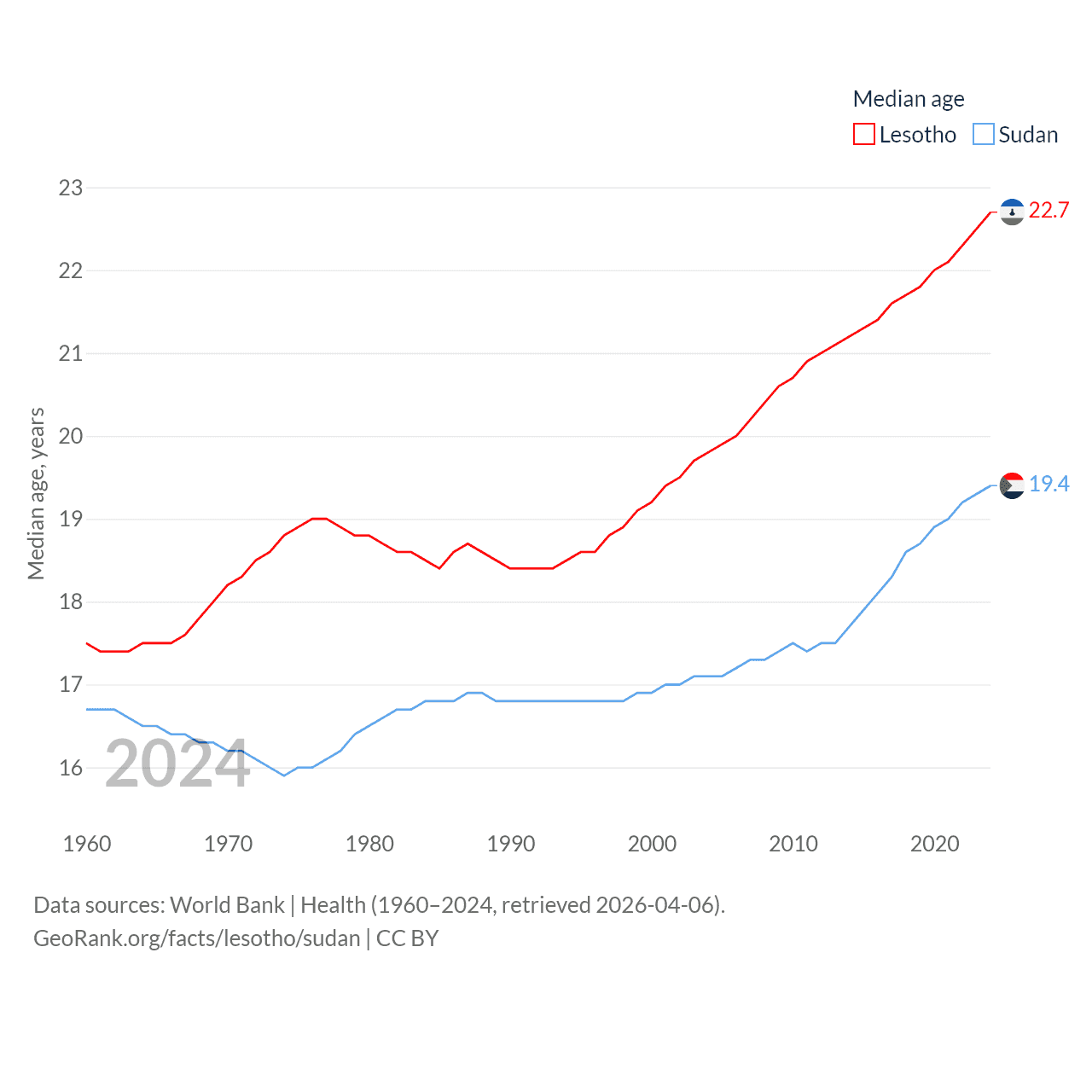 Lesotho has a population of 2.34M (ranked 145/197), compared with 50.4M in Sudan (ranked 30/197). Lesotho's land area is 11,722 sq mi versus 721,239 sq mi for Sudan (ranked 137th vs. 15th).