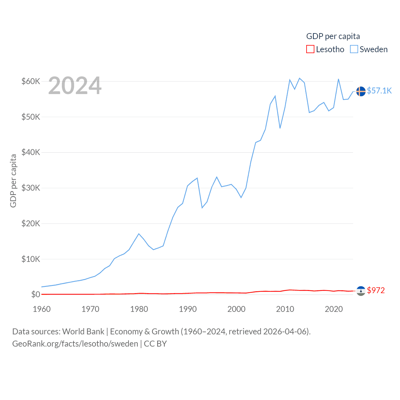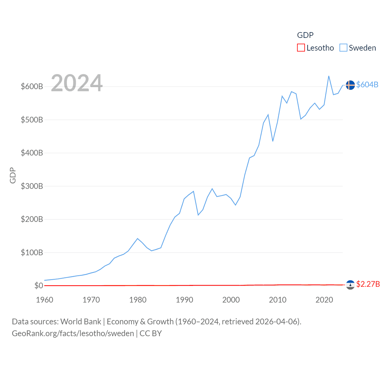 By GDP, Lesotho ranks 175/197 ($2.27B) and Sweden ranks 26/197 ($604B). By GDP per capita, Lesotho ranks 181/197 ($972), while Sweden ranks 17/197 ($57,117).