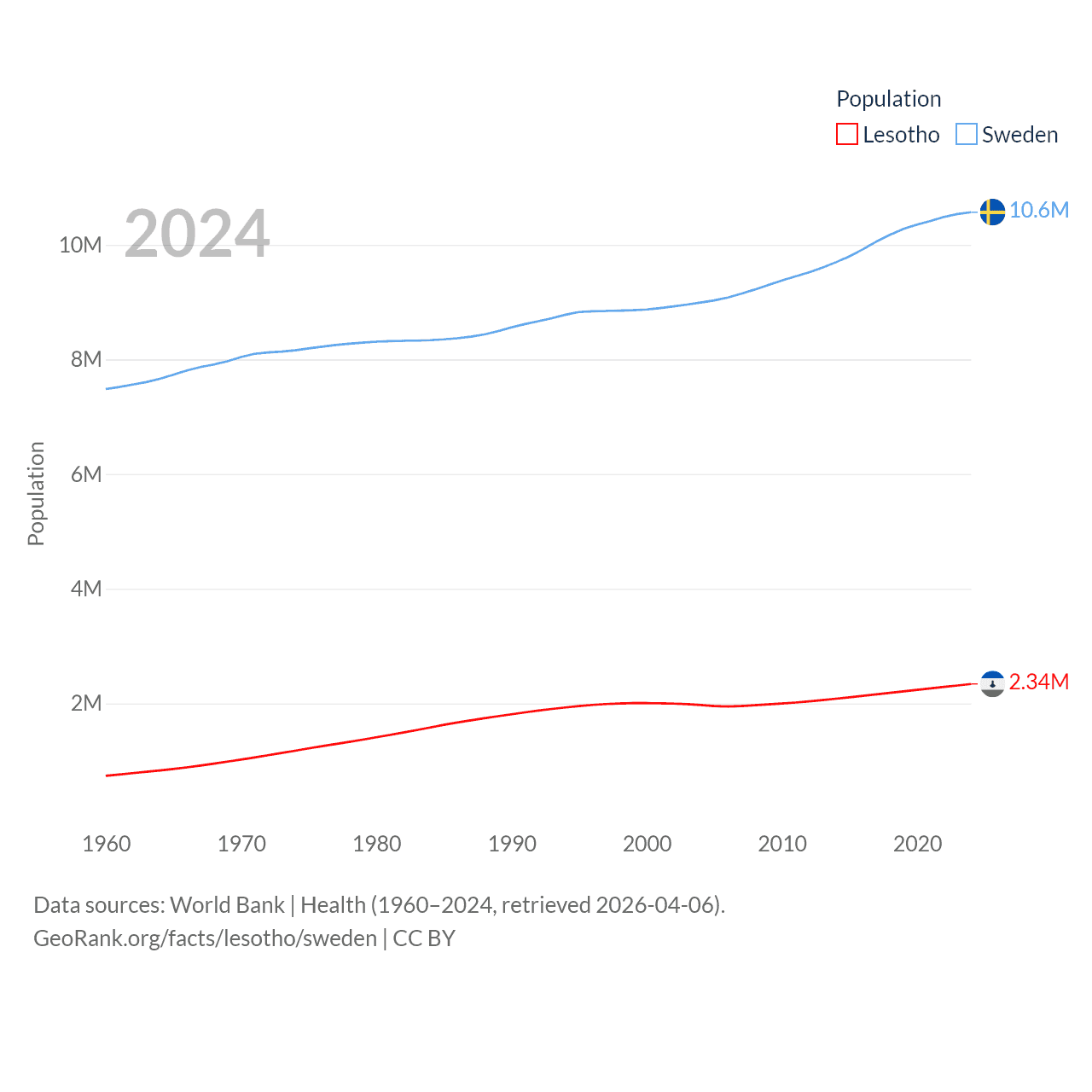 Lesotho has a population of 2.34M (ranked 145/197), compared with 10.6M in Sweden (ranked 93/197). Lesotho's land area is 11,722 sq mi versus 157,248 sq mi for Sweden (ranked 137th vs. 58th).