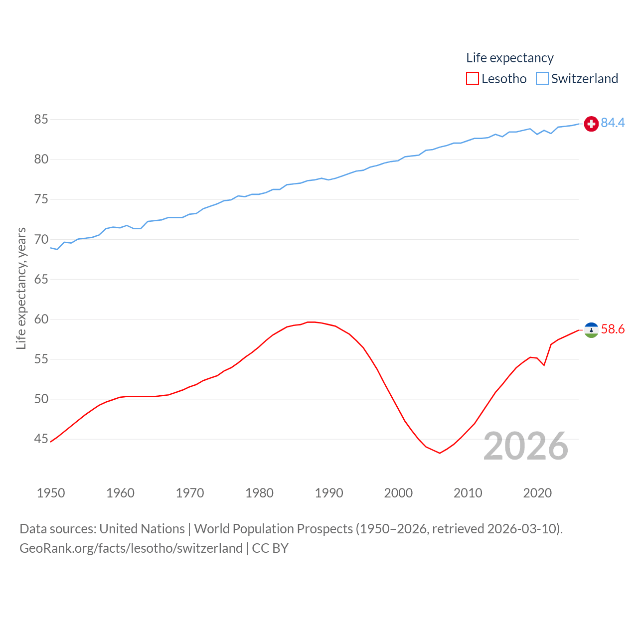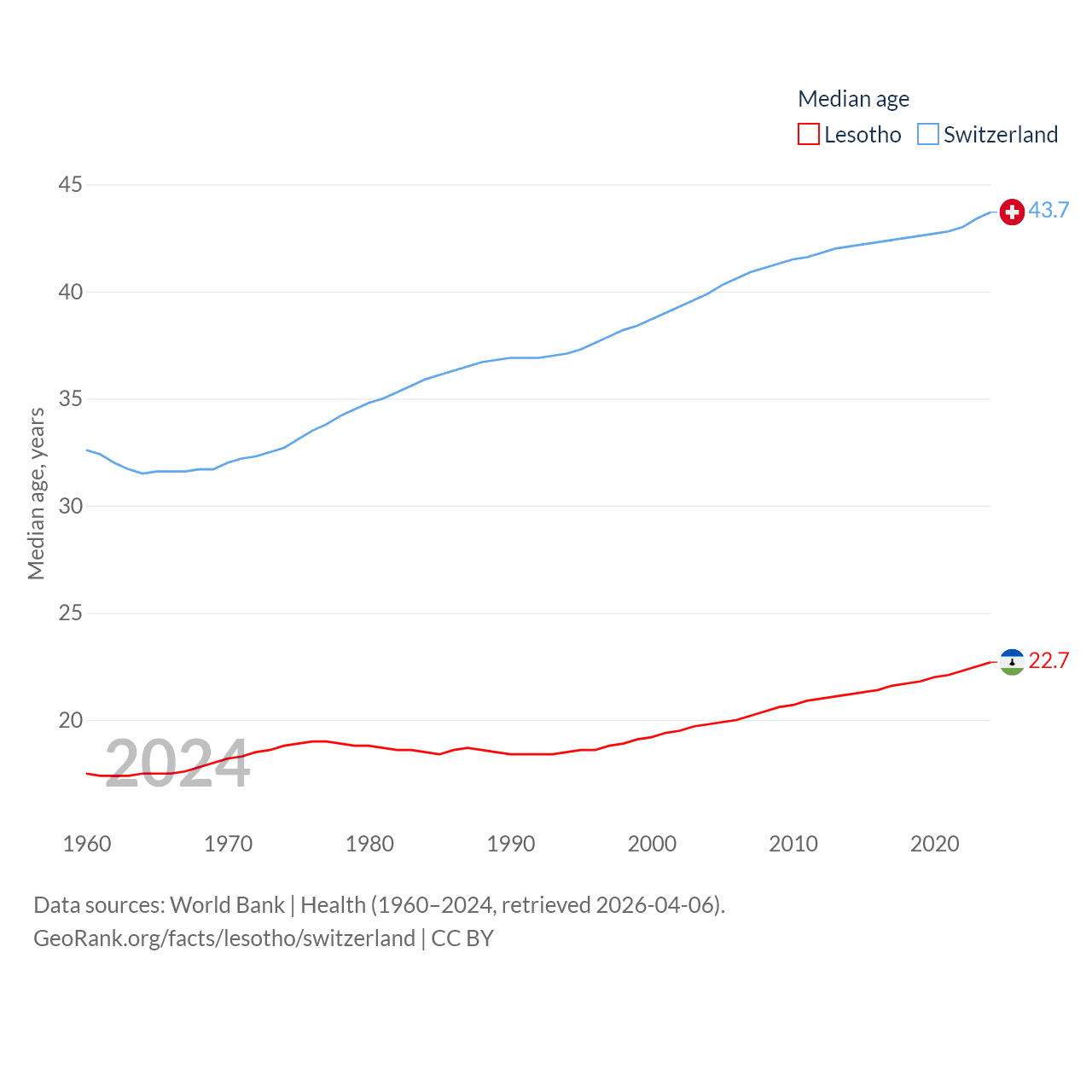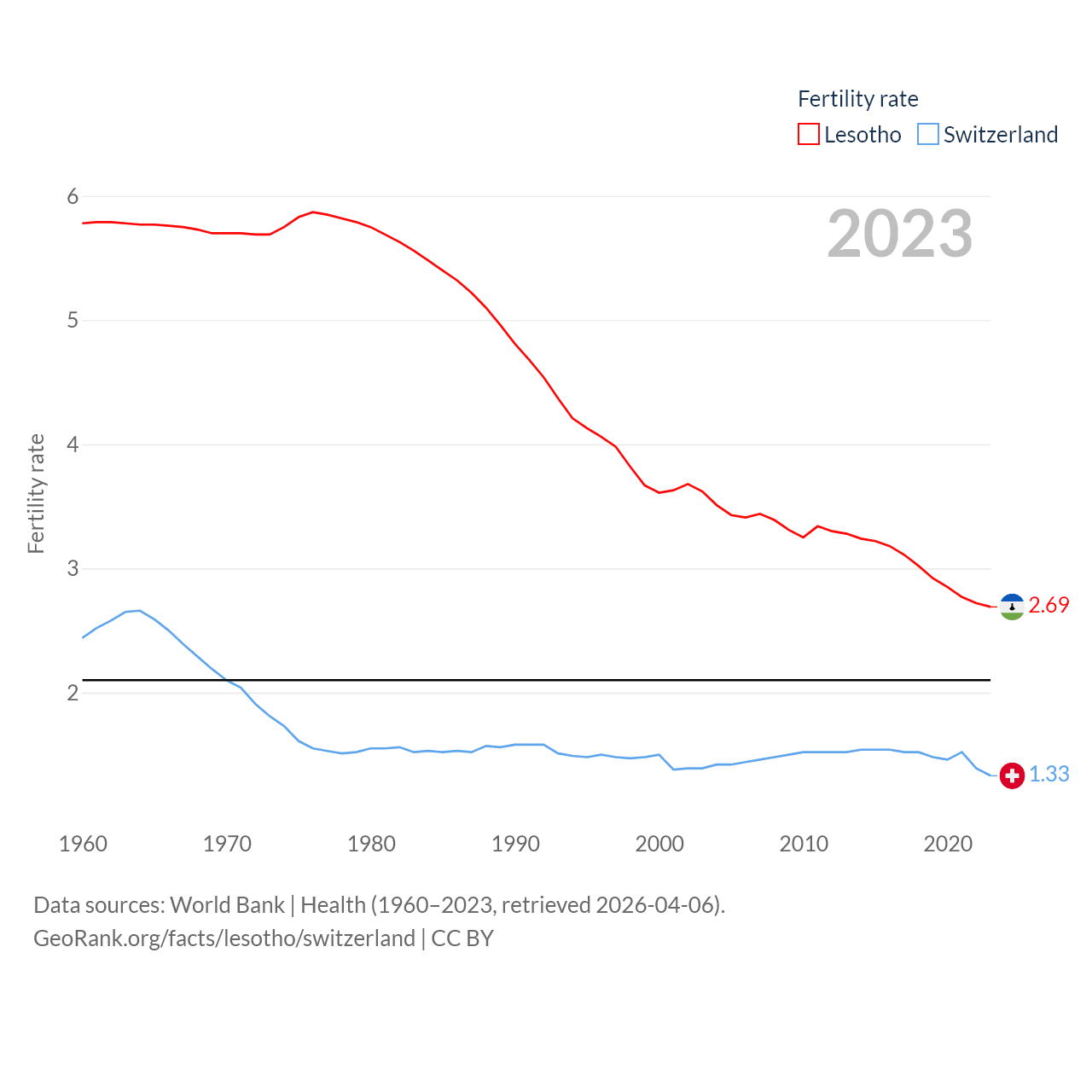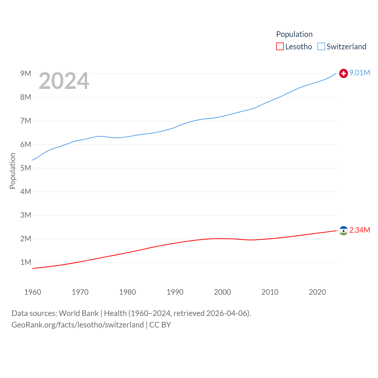 Lesotho has a population of 2.34M (ranked 145/197), compared with 9.01M in Switzerland (ranked 101/197). Lesotho's land area is 11,722 sq mi versus 15,255 sq mi for Switzerland (ranked 137th vs. 131st).