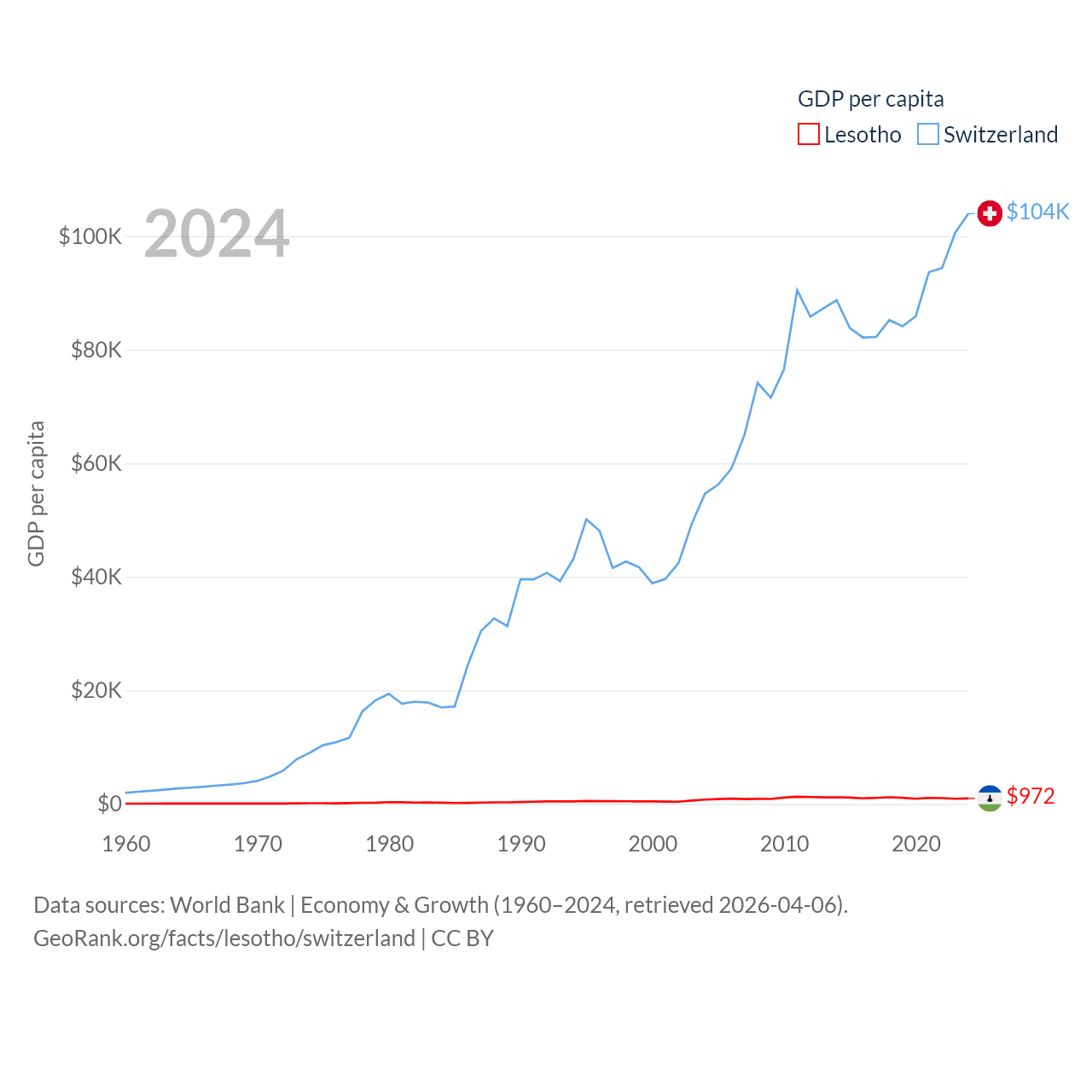 By GDP, Lesotho ranks 175/197 ($2.27B) and Switzerland ranks 20/197 ($937B). By GDP per capita, Lesotho ranks 181/197 ($972), while Switzerland ranks 5/197 ($103,998).