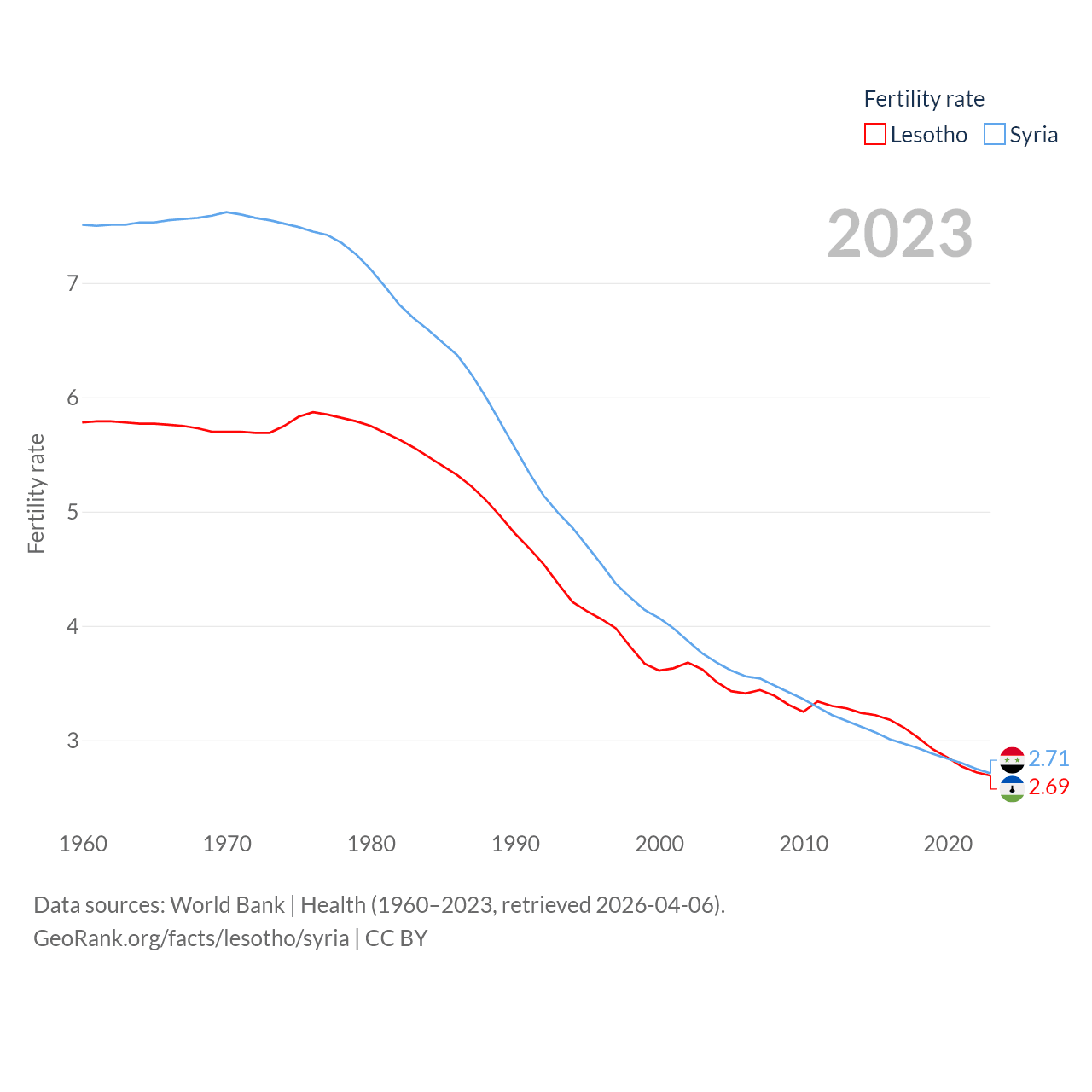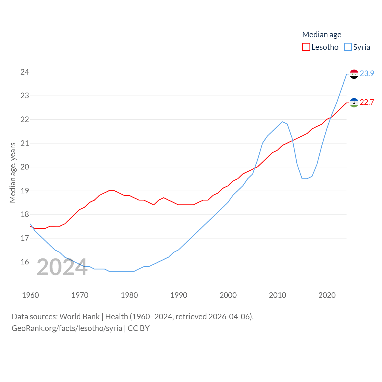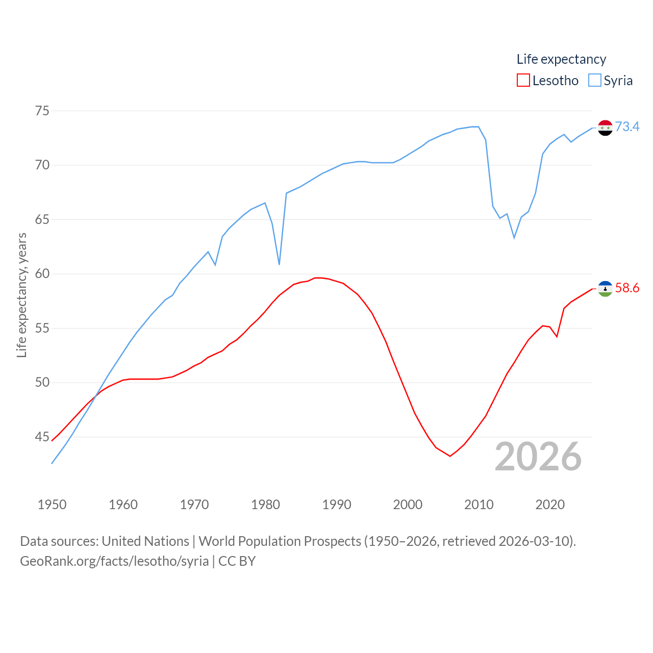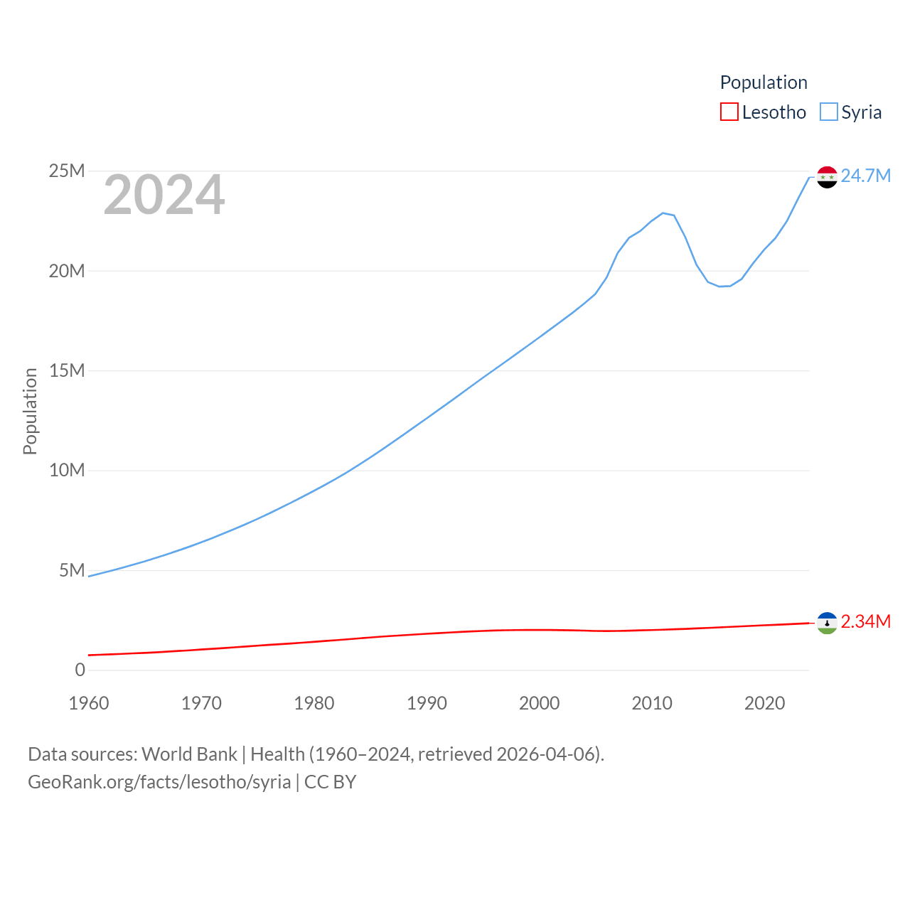 Lesotho has a population of 2.34M (ranked 145/197), compared with 24.7M in Syria (ranked 57/197). Lesotho's land area is 11,722 sq mi versus 70,900 sq mi for Syria (ranked 137th vs. 87th).