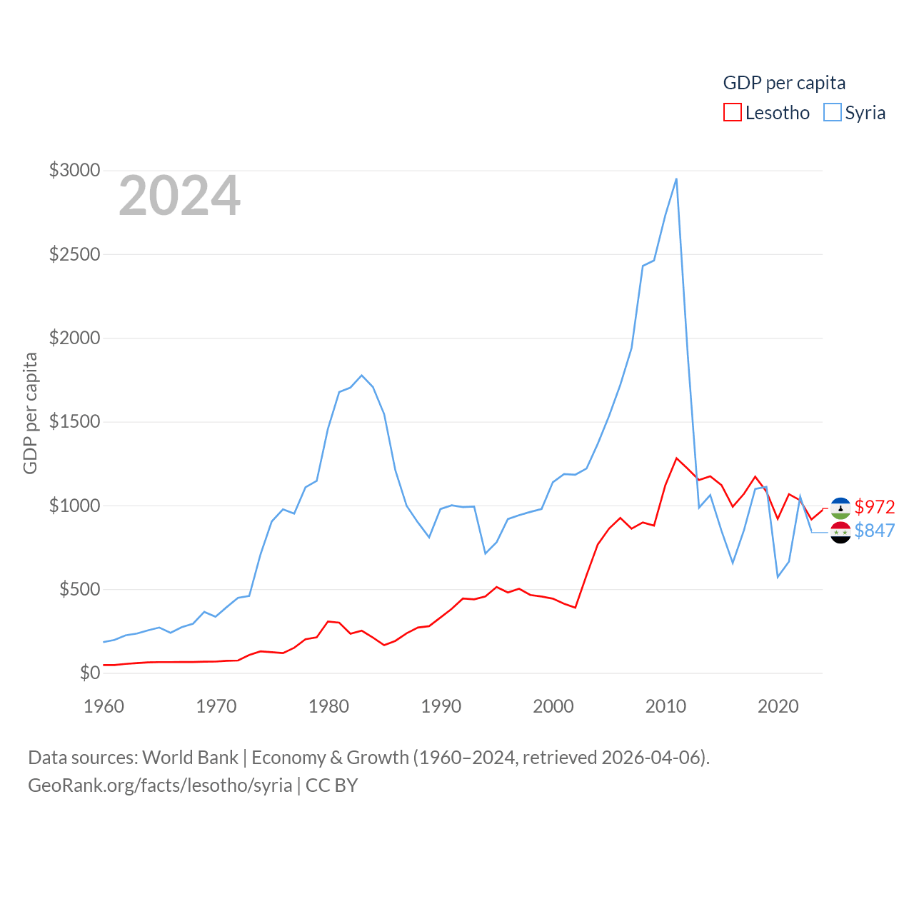 By GDP, Lesotho ranks 175/197 ($2.27B) and Syria ranks 129/197 ($20B). By GDP per capita, Lesotho ranks 181/197 ($972), while Syria ranks 185/197 ($847).