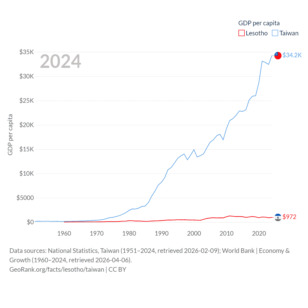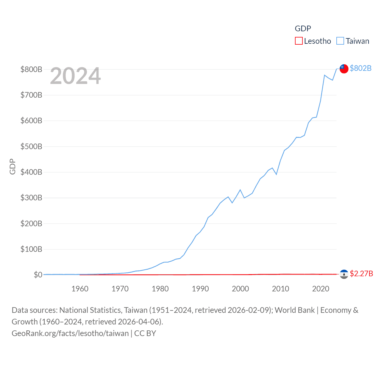By GDP, Lesotho ranks 175/197 ($2.27B) and Taiwan ranks 22/197 ($802B). By GDP per capita, Lesotho ranks 181/197 ($972), while Taiwan ranks 35/197 ($34,238).