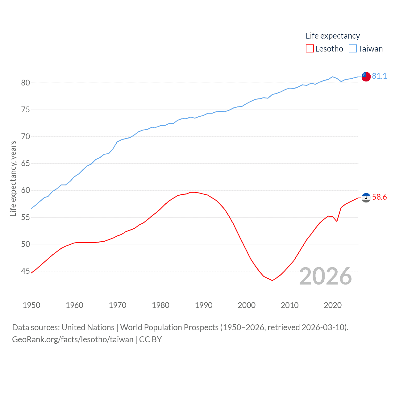 Lesotho has a population of 2.34M (ranked 145/197), compared with 23.3M in Taiwan (ranked 60/197). Lesotho's land area is 11,722 sq mi versus 13,976 sq mi for Taiwan (ranked 137th vs. 133rd).