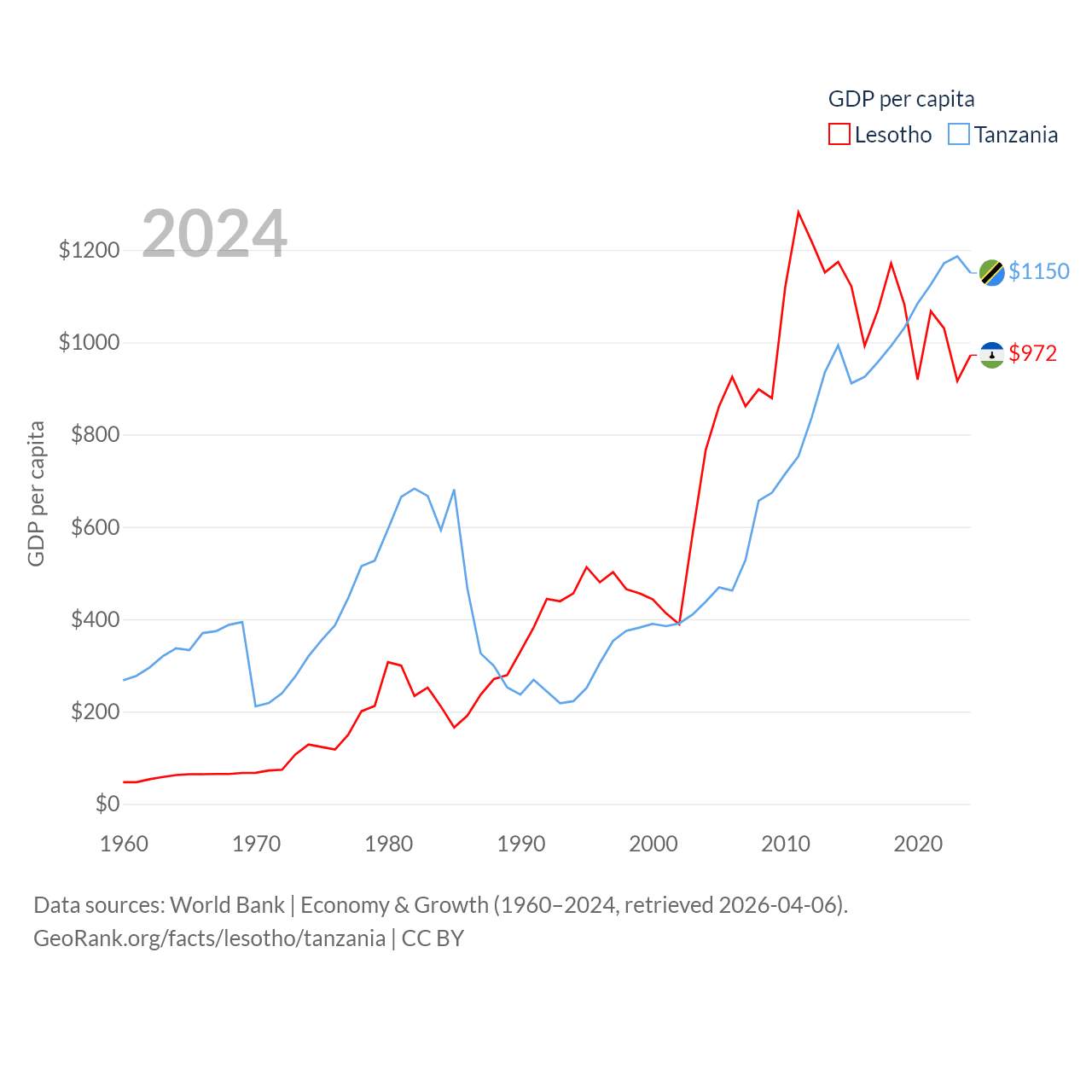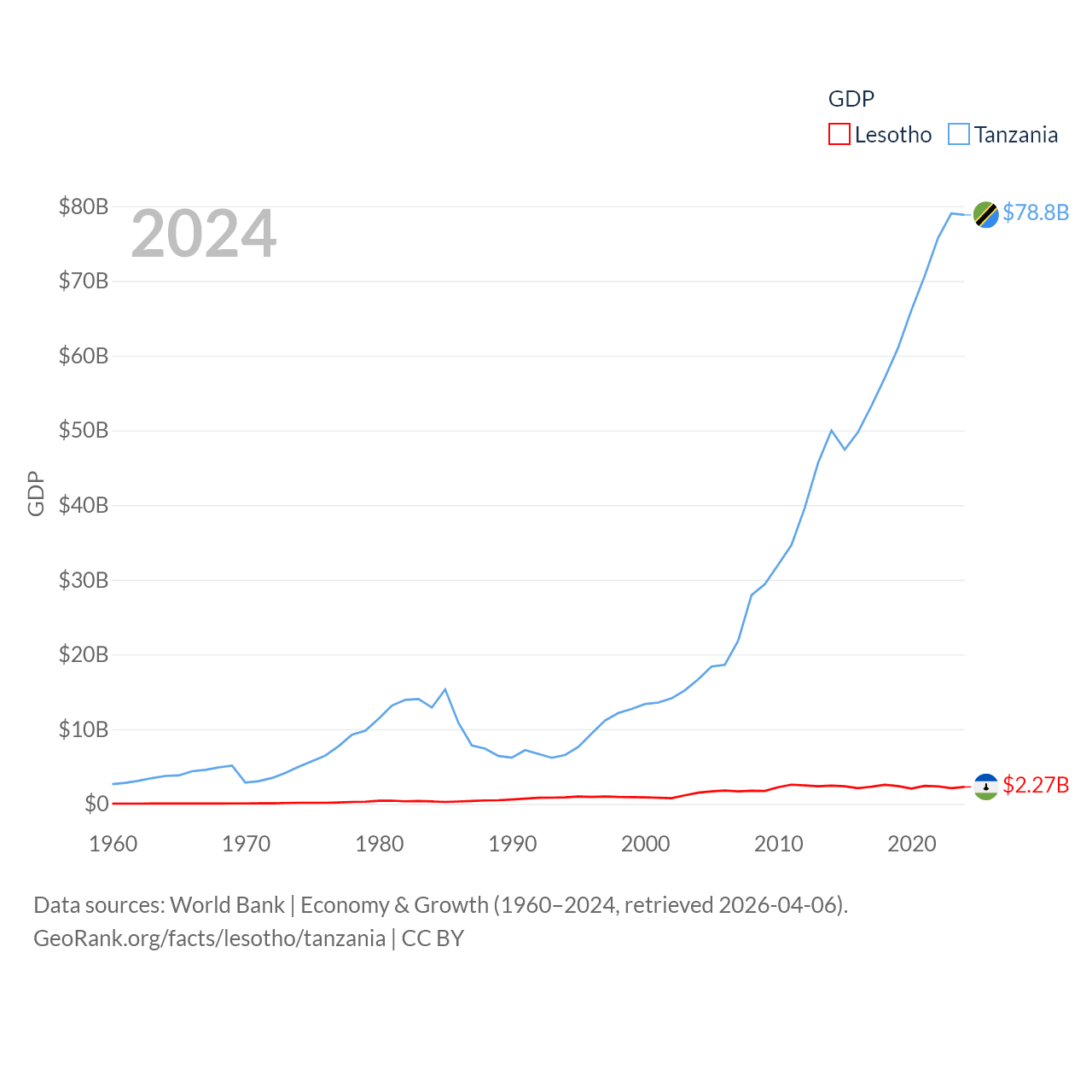By GDP, Lesotho ranks 175/197 ($2.27B) and Tanzania ranks 82/197 ($78.8B). By GDP per capita, Lesotho ranks 181/197 ($972), while Tanzania ranks 170/197 ($1,150).