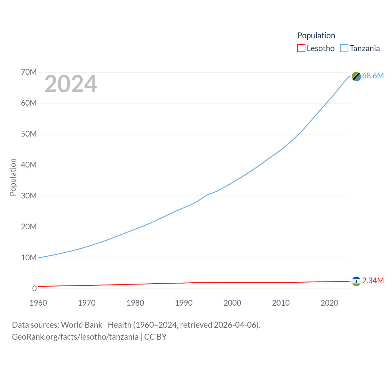 Lesotho has a population of 2.34M (ranked 145/197), compared with 68.6M in Tanzania (ranked 22/197). Lesotho's land area is 11,722 sq mi versus 342,009 sq mi for Tanzania (ranked 137th vs. 31st).