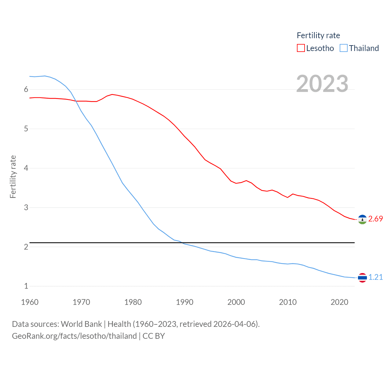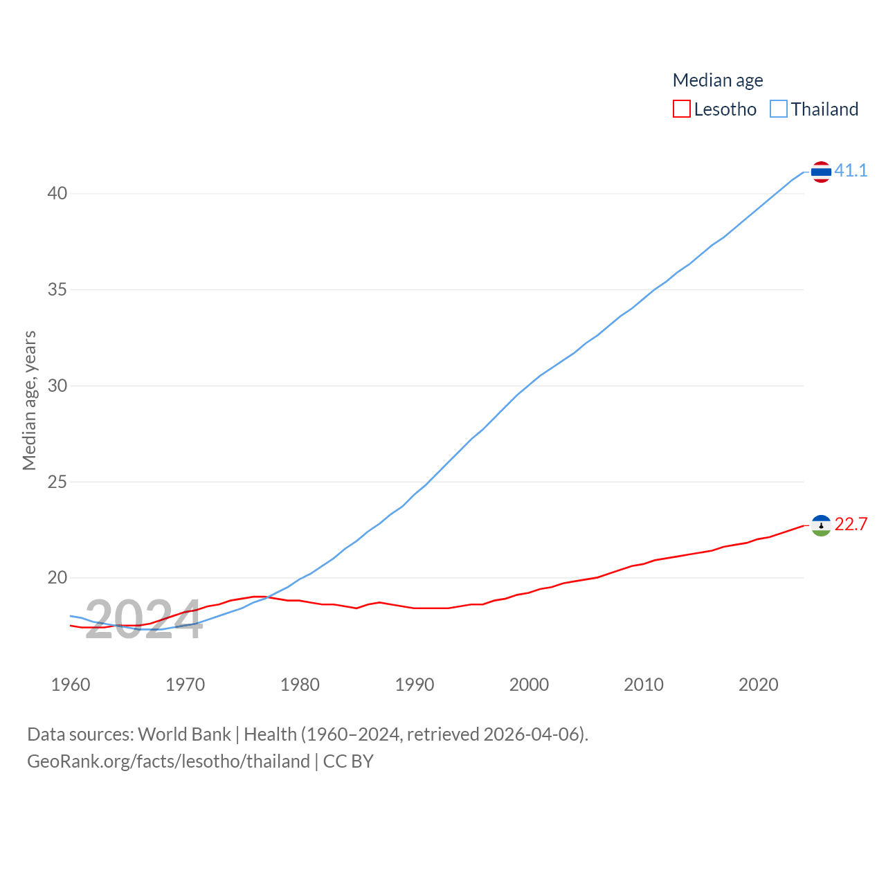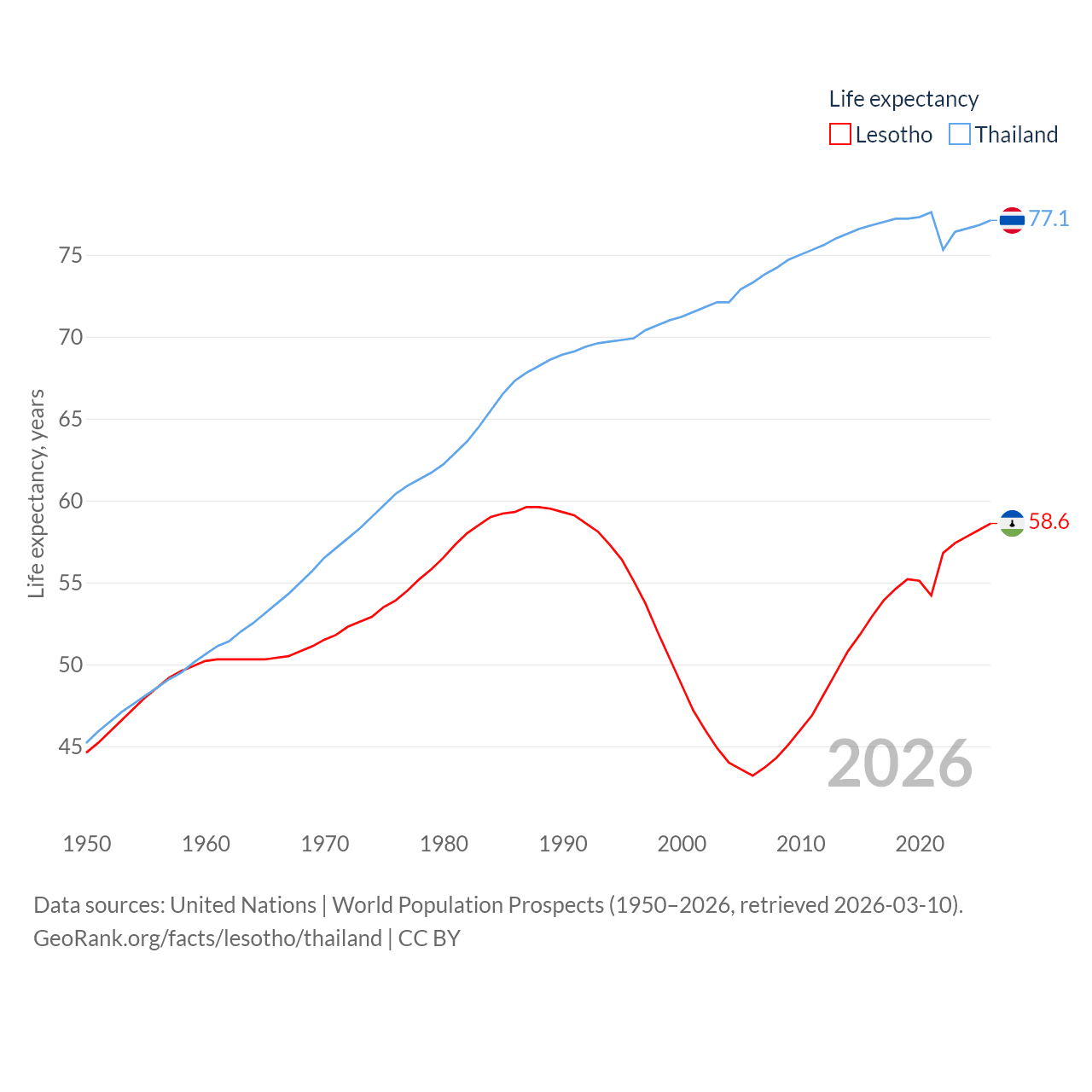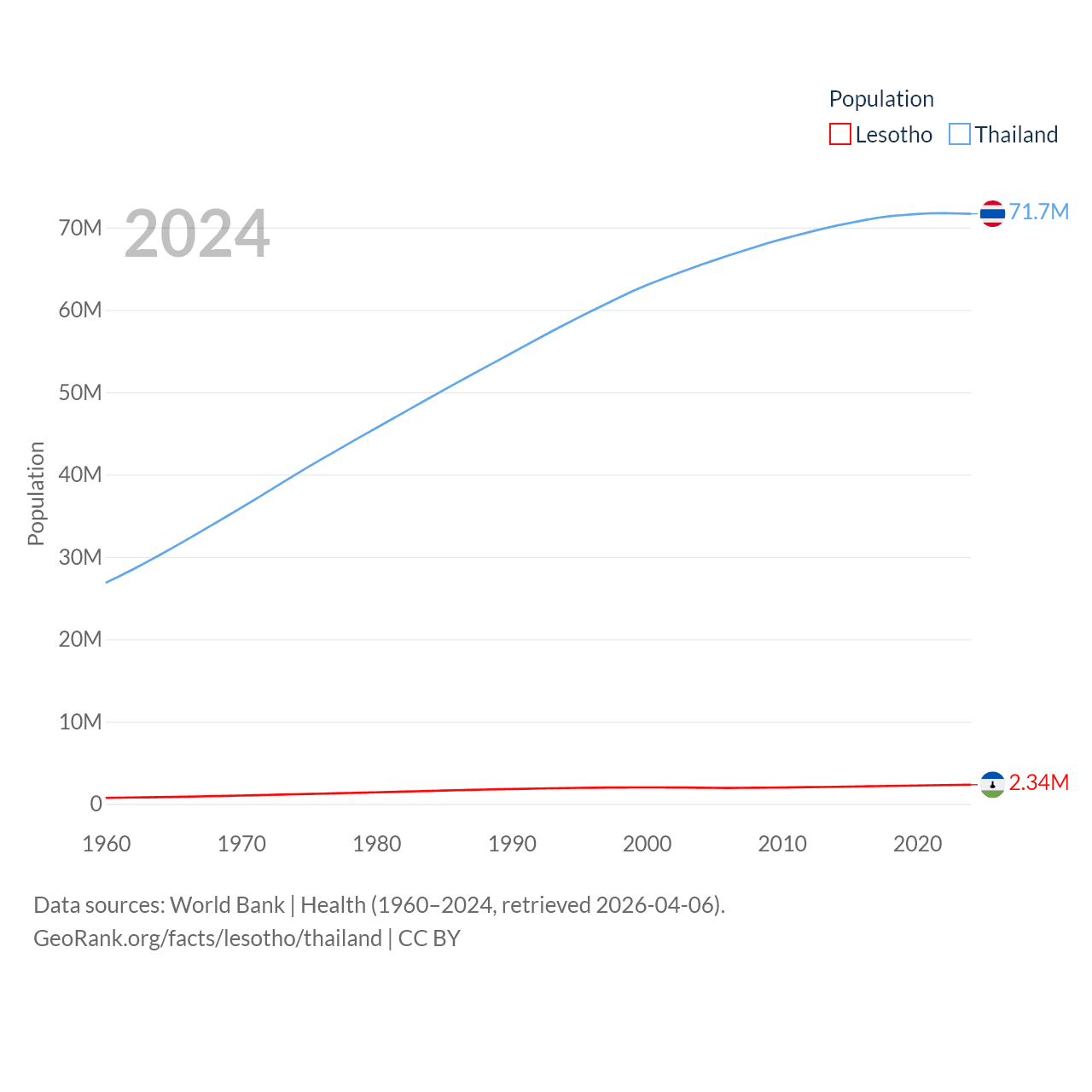 Lesotho has a population of 2.34M (ranked 145/197), compared with 71.7M in Thailand (ranked 20/197). Lesotho's land area is 11,722 sq mi versus 197,256 sq mi for Thailand (ranked 137th vs. 50th).