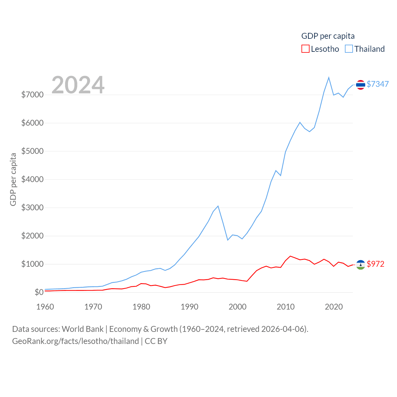 By GDP, Lesotho ranks 175/197 ($2.27B) and Thailand ranks 31/197 ($527B). By GDP per capita, Lesotho ranks 181/197 ($972), while Thailand ranks 100/197 ($7,347).