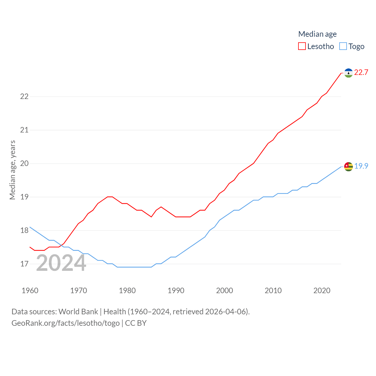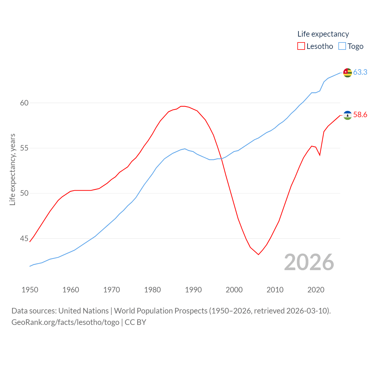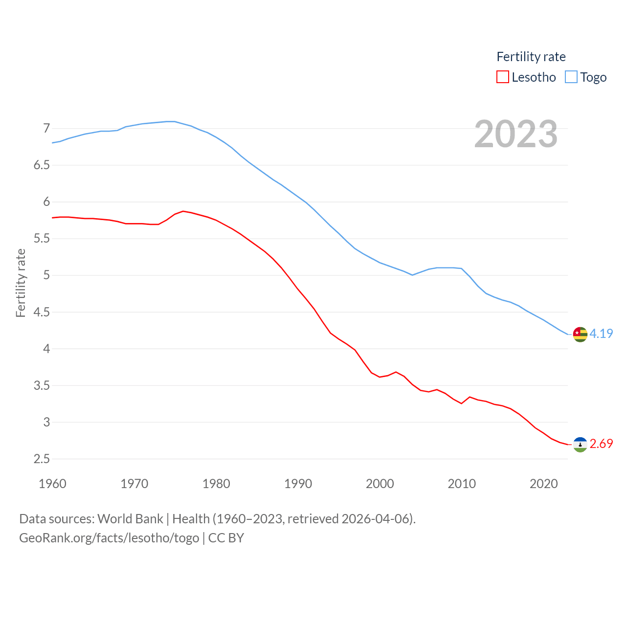 Lesotho has a population of 2.34M (ranked 145/197), compared with 9.52M in Togo (ranked 98/197). Lesotho's land area is 11,722 sq mi versus 21,000 sq mi for Togo (ranked 137th vs. 124th).