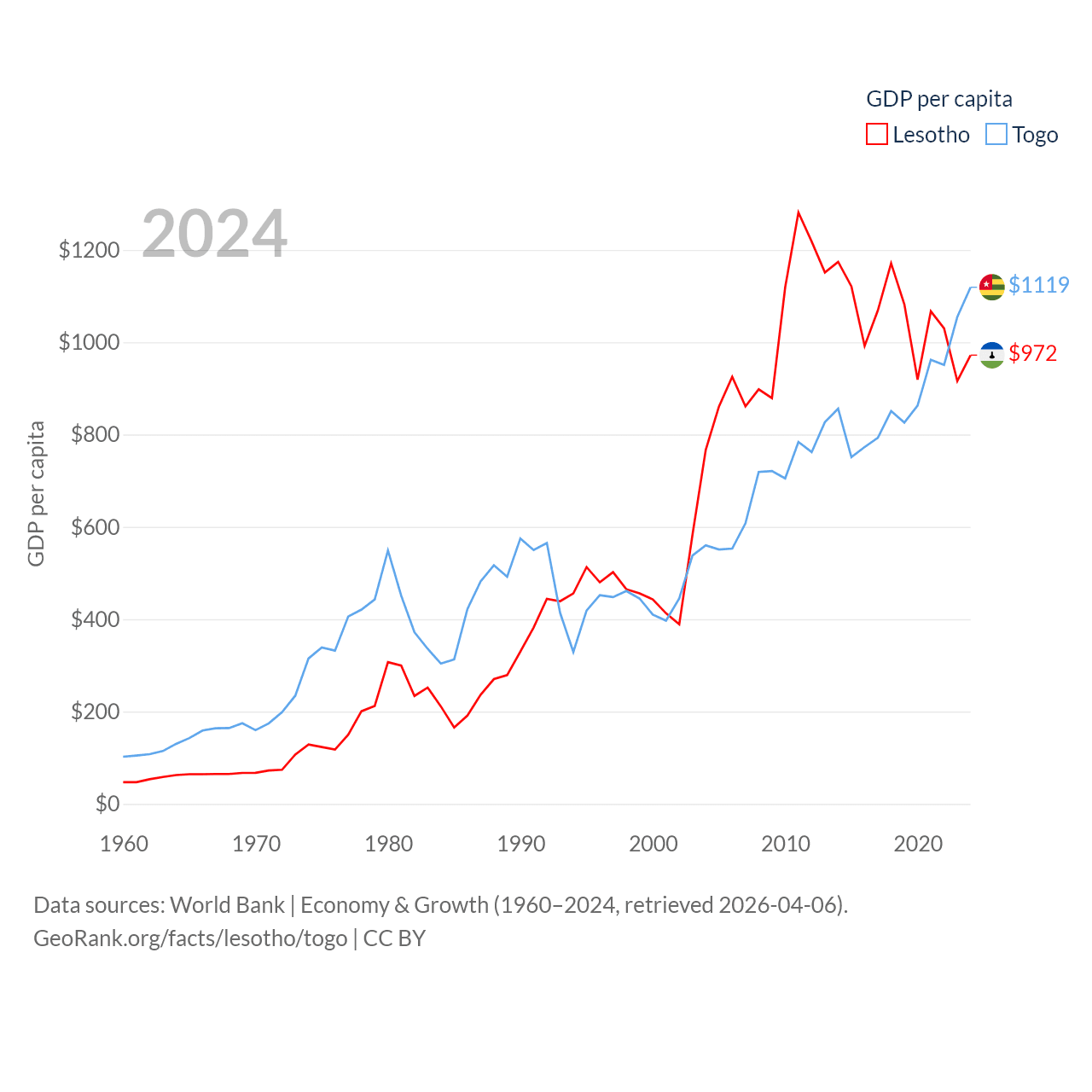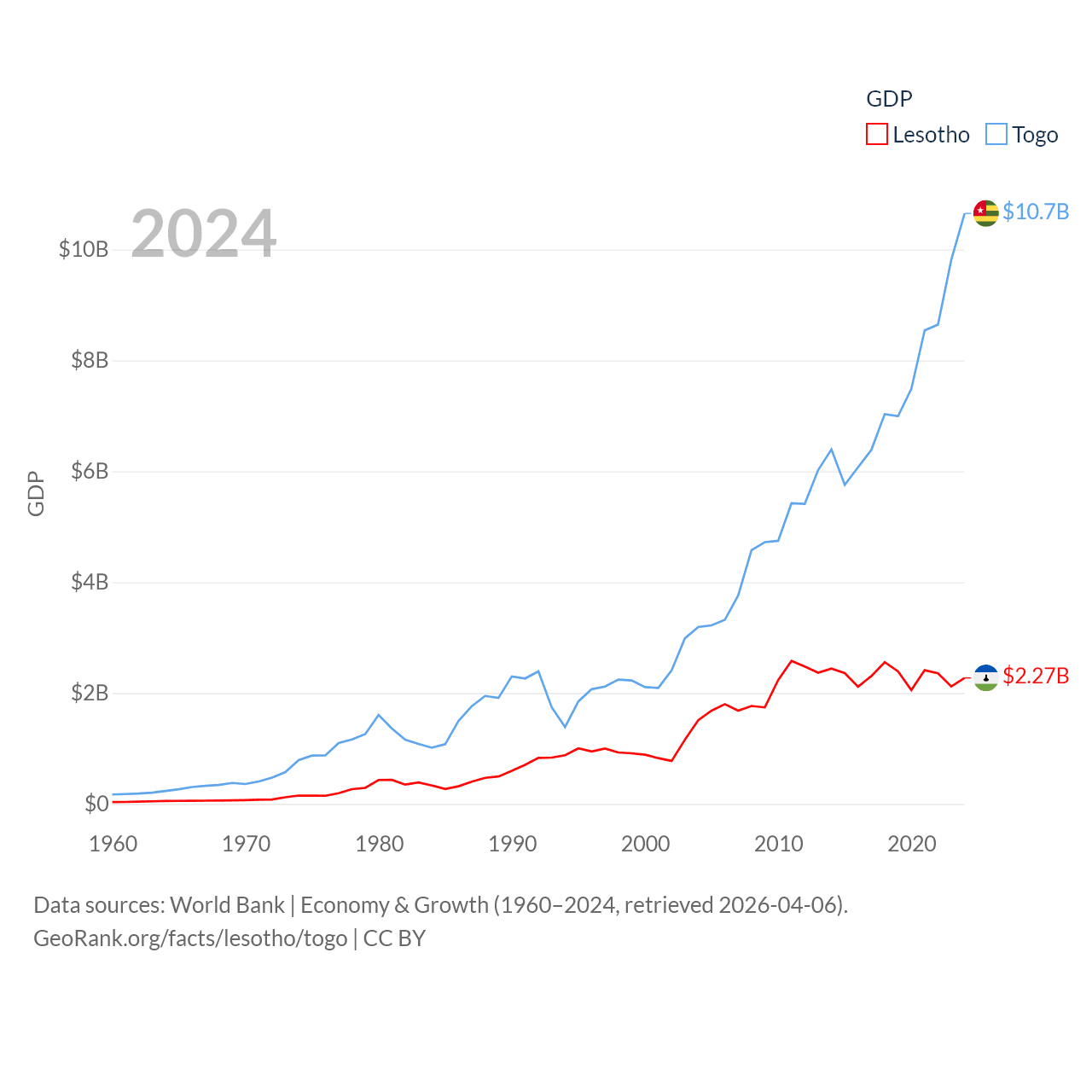 By GDP, Lesotho ranks 175/197 ($2.27B) and Togo ranks 154/197 ($10.7B). By GDP per capita, Lesotho ranks 181/197 ($972), while Togo ranks 172/197 ($1,119).