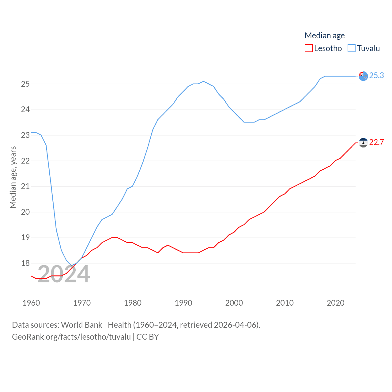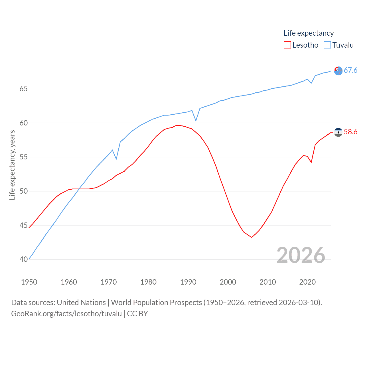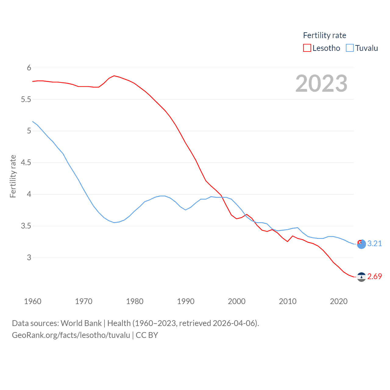 Lesotho has a population of 2.34M (ranked 145/197), compared with 9.65K in Tuvalu (ranked 196/197). Lesotho's land area is 11,722 sq mi versus 11.6 sq mi for Tuvalu (ranked 137th vs. 194th).