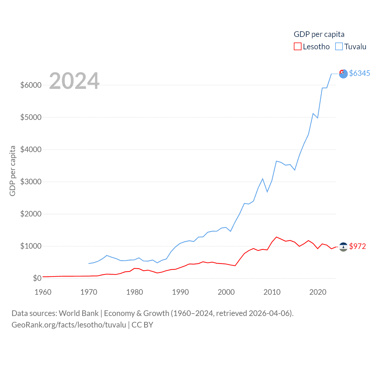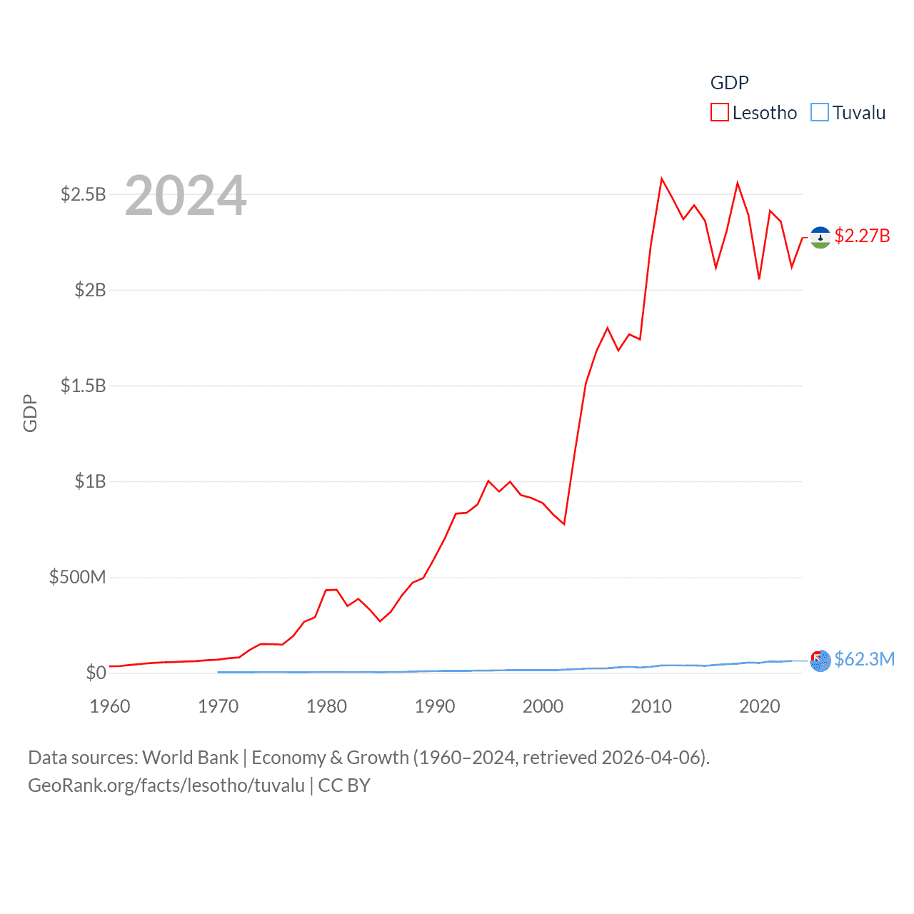 By GDP, Lesotho ranks 175/197 ($2.27B) and Tuvalu ranks 196/197 ($62.3M). By GDP per capita, Lesotho ranks 181/197 ($972), while Tuvalu ranks 110/197 ($6,345).