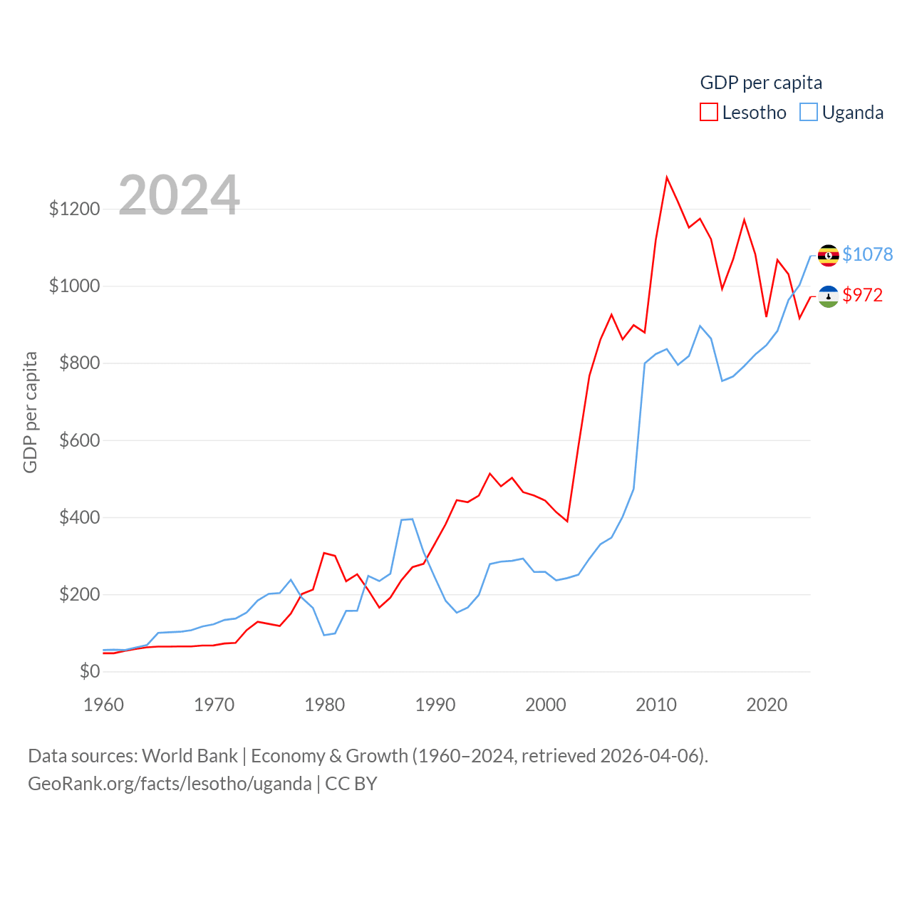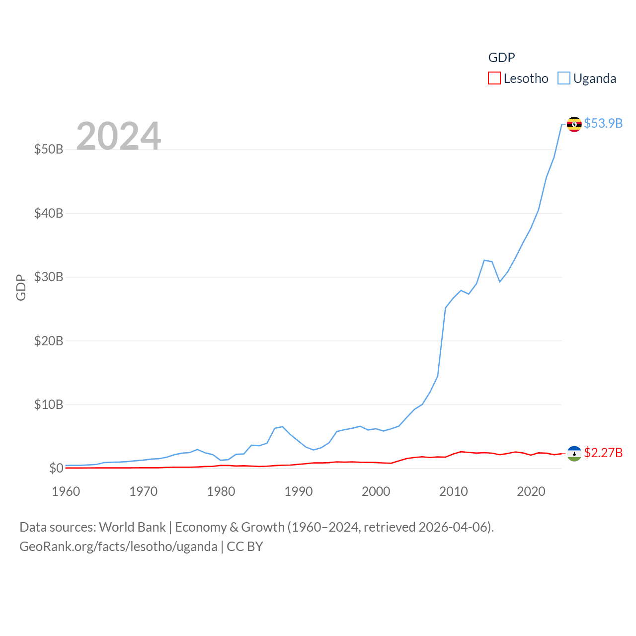 By GDP, Lesotho ranks 175/197 ($2.27B) and Uganda ranks 89/197 ($53.9B). By GDP per capita, Lesotho ranks 181/197 ($972), while Uganda ranks 176/197 ($1,078).