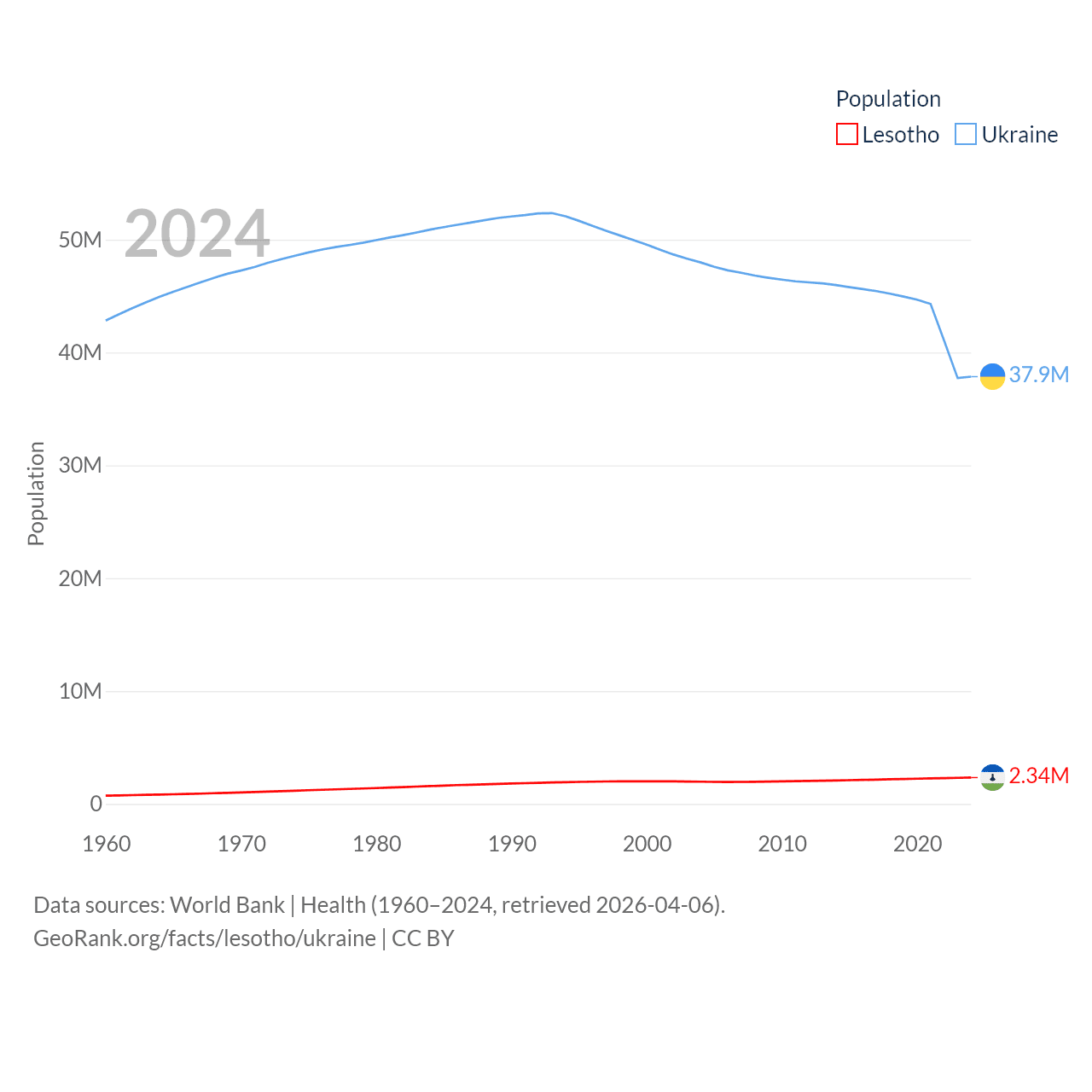 Lesotho has a population of 2.34M (ranked 145/197), compared with 37.9M in Ukraine (ranked 41/197). Lesotho's land area is 11,722 sq mi versus 223,708 sq mi for Ukraine (ranked 137th vs. 46th).