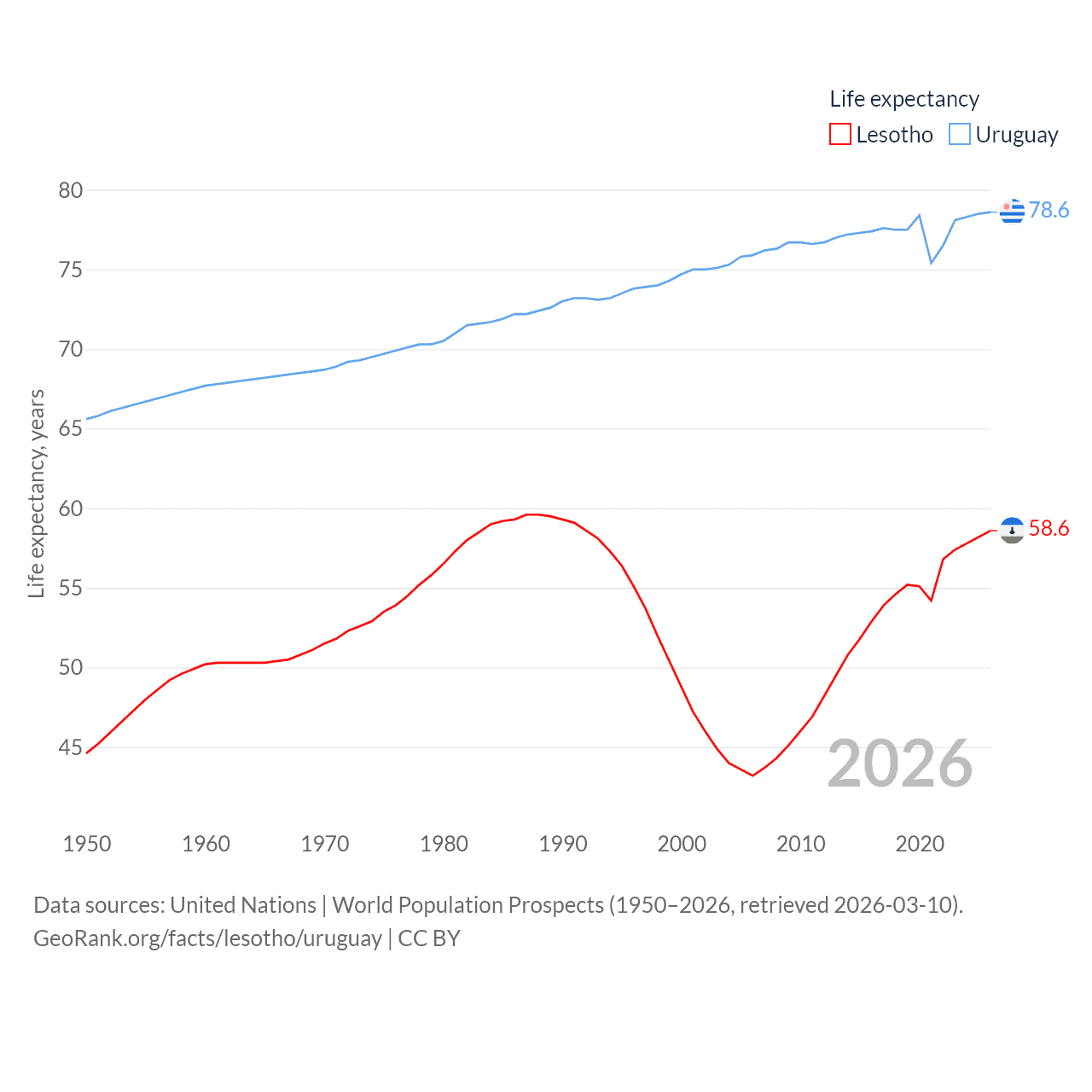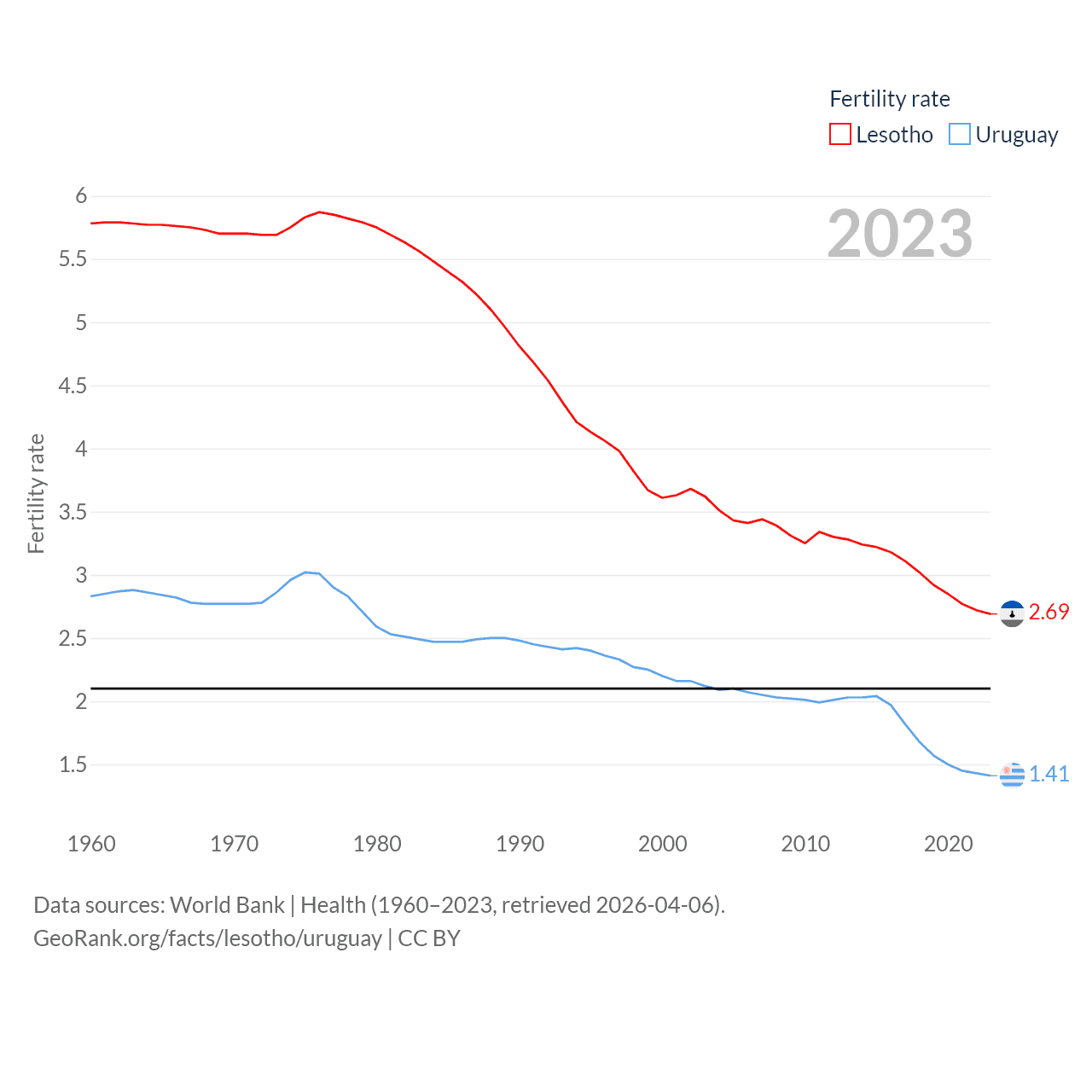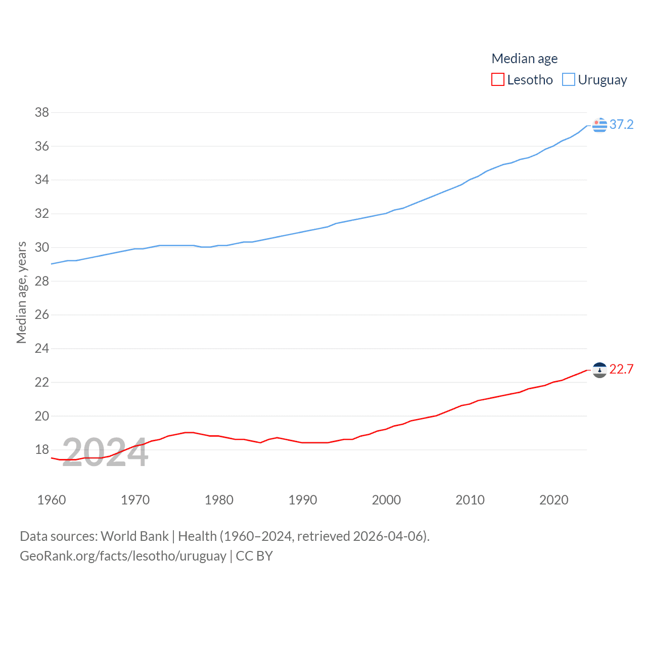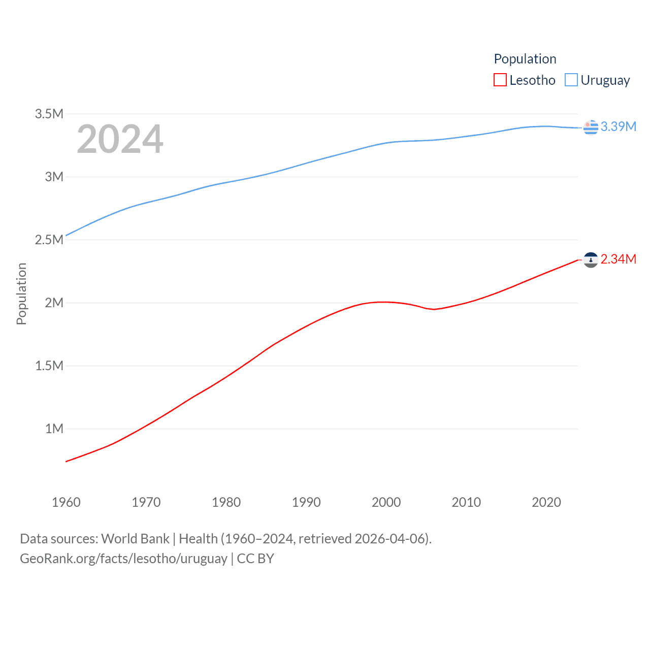 Lesotho has a population of 2.34M (ranked 145/197), compared with 3.39M in Uruguay (ranked 133/197). Lesotho's land area is 11,722 sq mi versus 67,576 sq mi for Uruguay (ranked 137th vs. 89th).