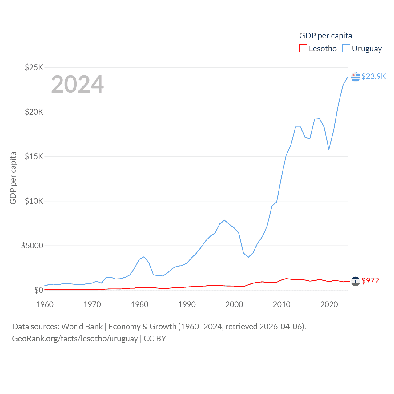 By GDP, Lesotho ranks 175/197 ($2.27B) and Uruguay ranks 81/197 ($81B). By GDP per capita, Lesotho ranks 181/197 ($972), while Uruguay ranks 52/197 ($23,907).