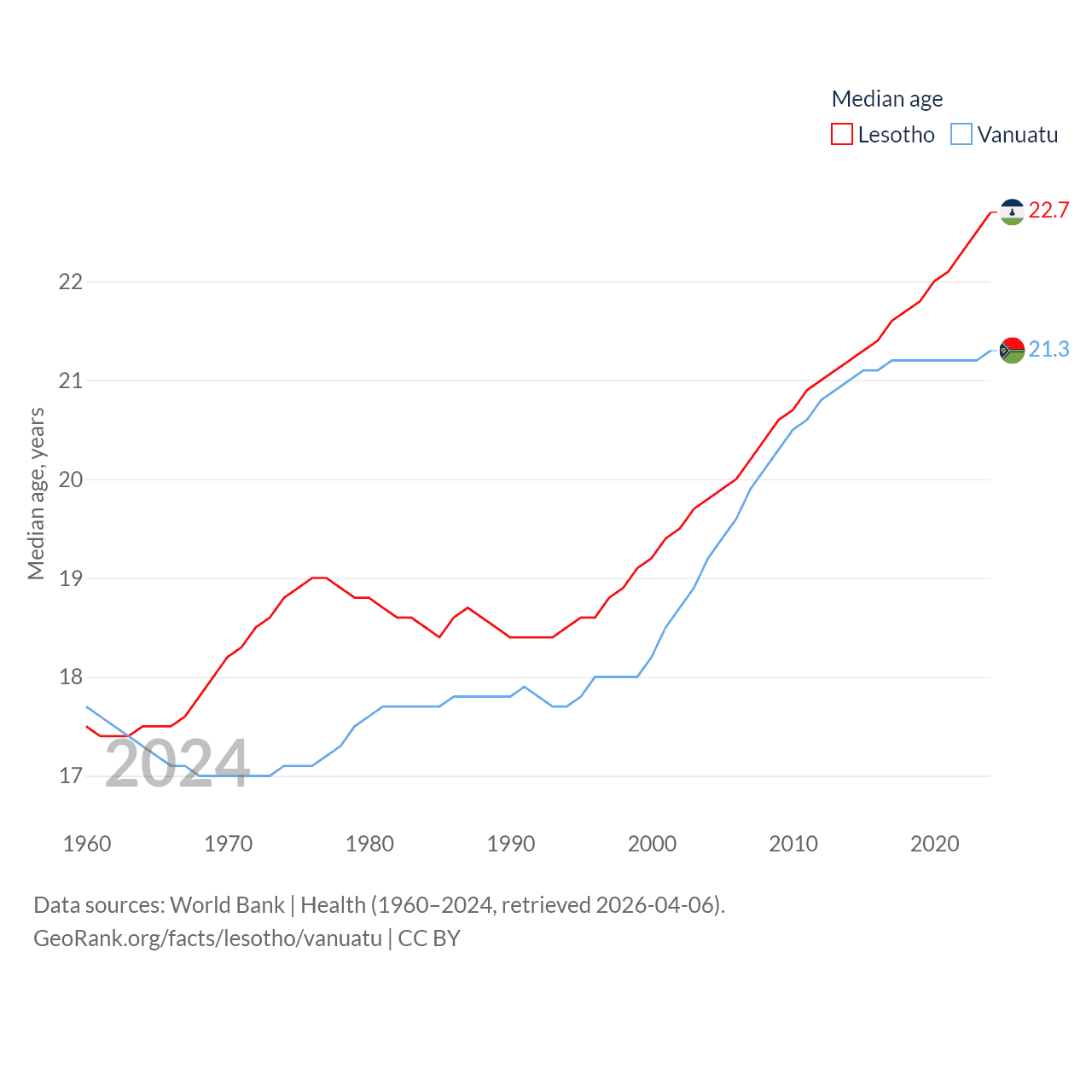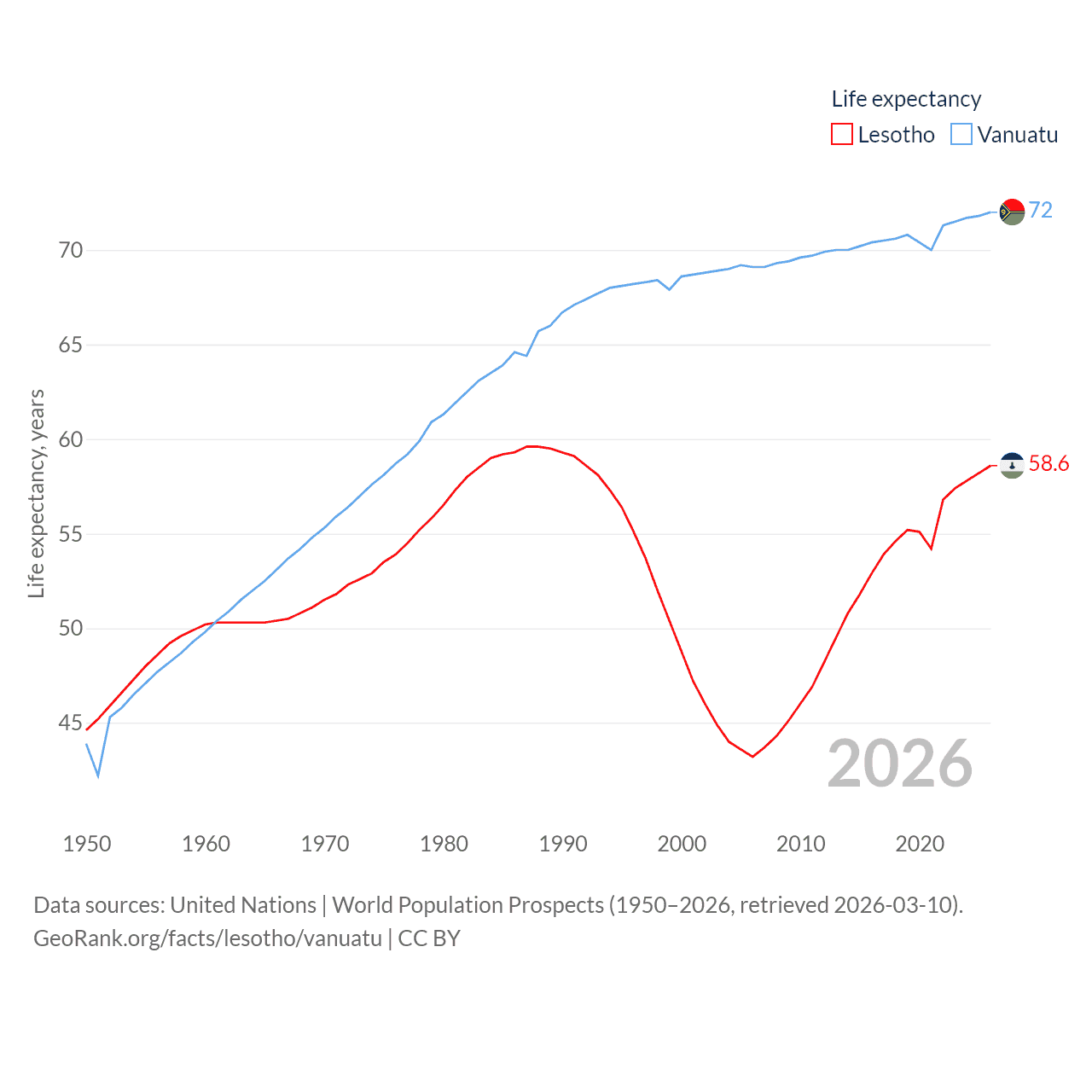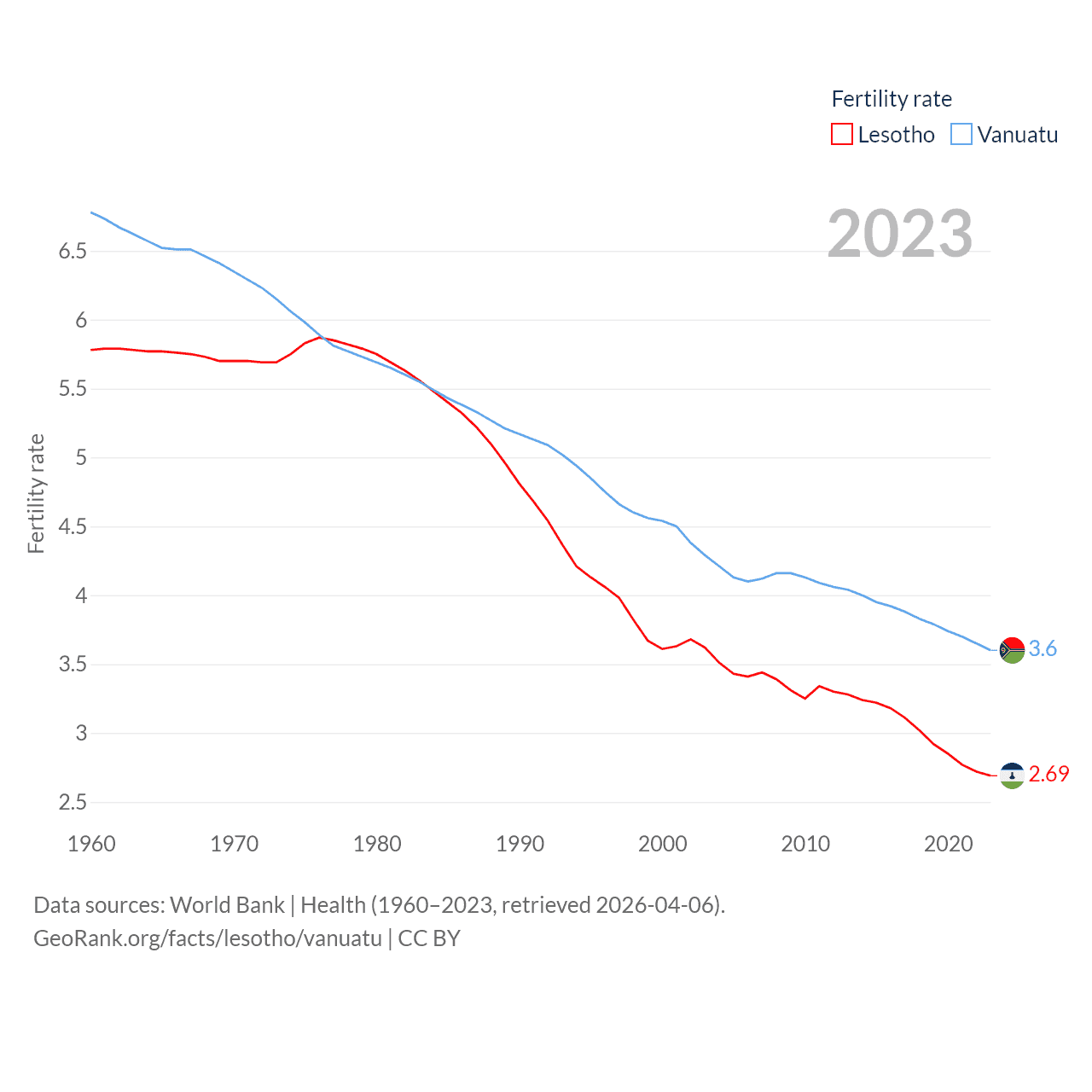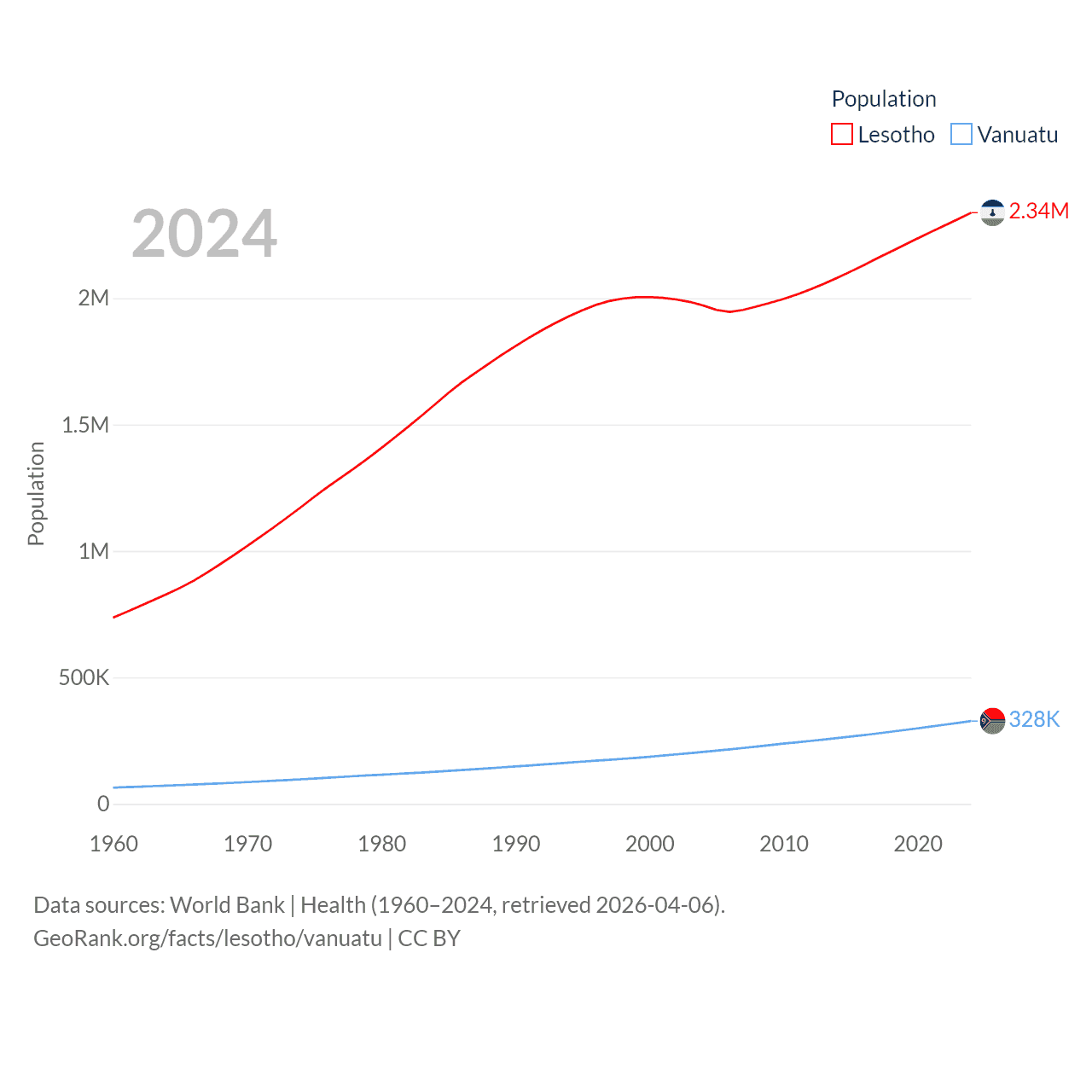 Lesotho has a population of 2.34M (ranked 145/197), compared with 328K in Vanuatu (ranked 174/197). Lesotho's land area is 11,722 sq mi versus 4,707 sq mi for Vanuatu (ranked 137th vs. 157th).
