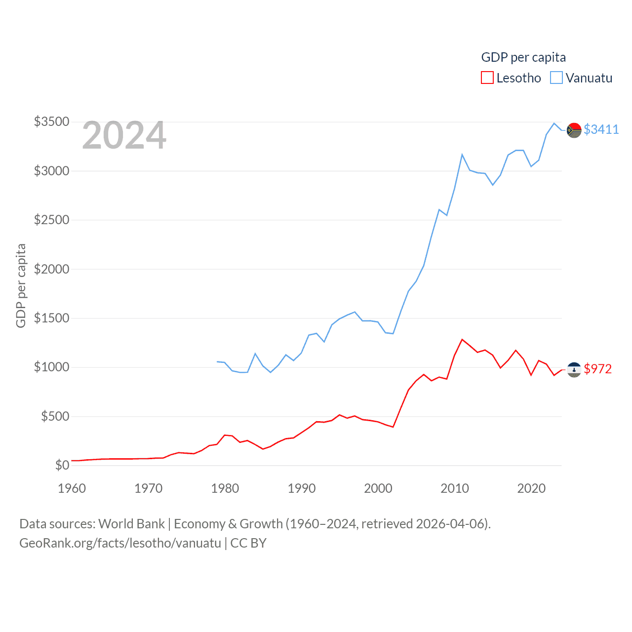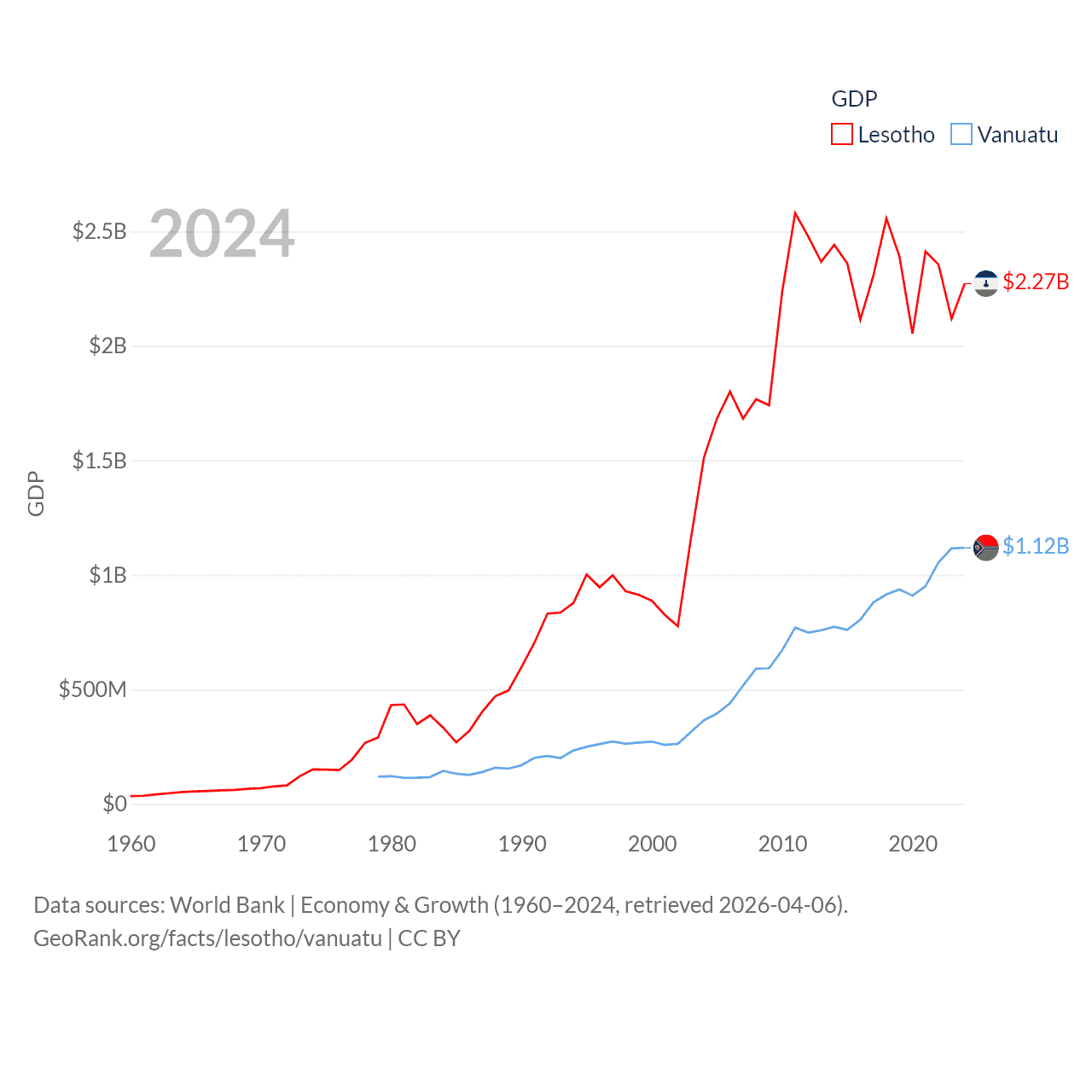 By GDP, Lesotho ranks 175/197 ($2.27B) and Vanuatu ranks 188/197 ($1.12B). By GDP per capita, Lesotho ranks 181/197 ($972), while Vanuatu ranks 137/197 ($3,411).