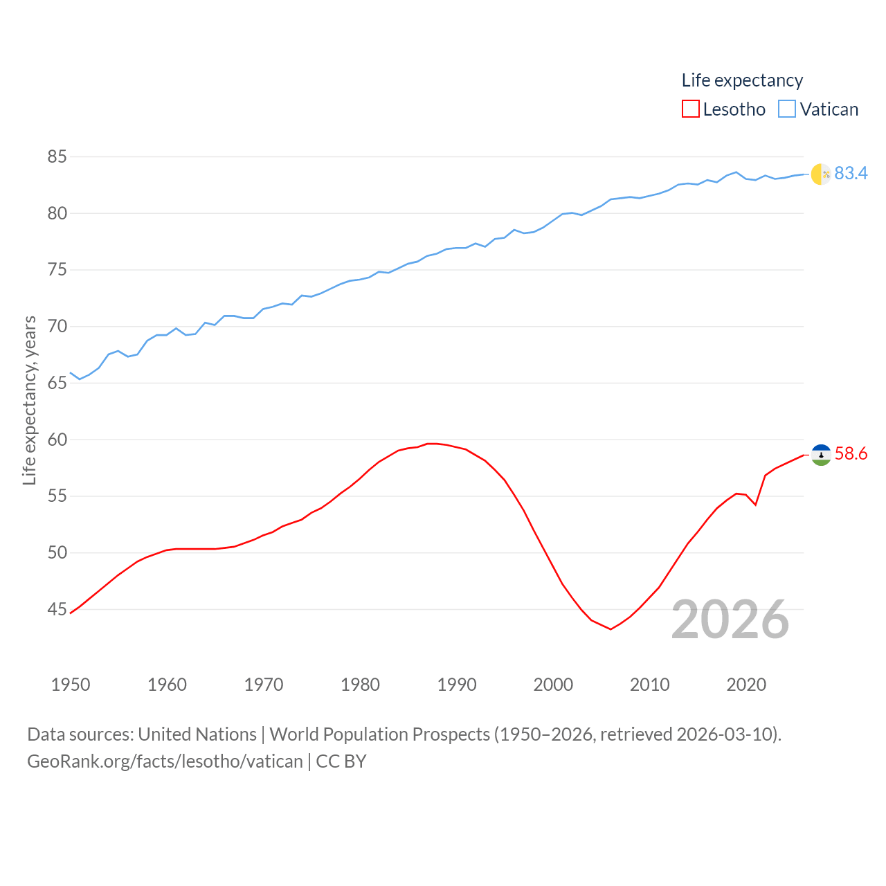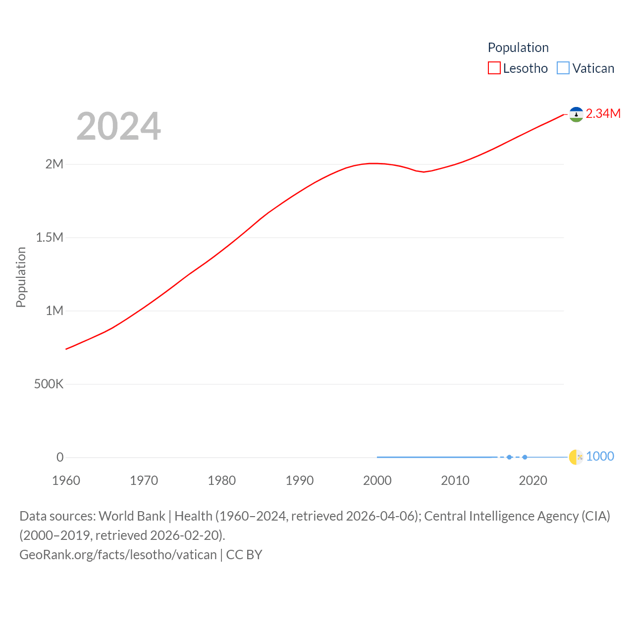 Lesotho has a population of 2.34M (ranked 145/197), compared with 1K in The Vatican (ranked 197/197). Lesotho's land area is 11,722 sq mi versus 0.17 sq mi for The Vatican (ranked 137th vs. 197th).