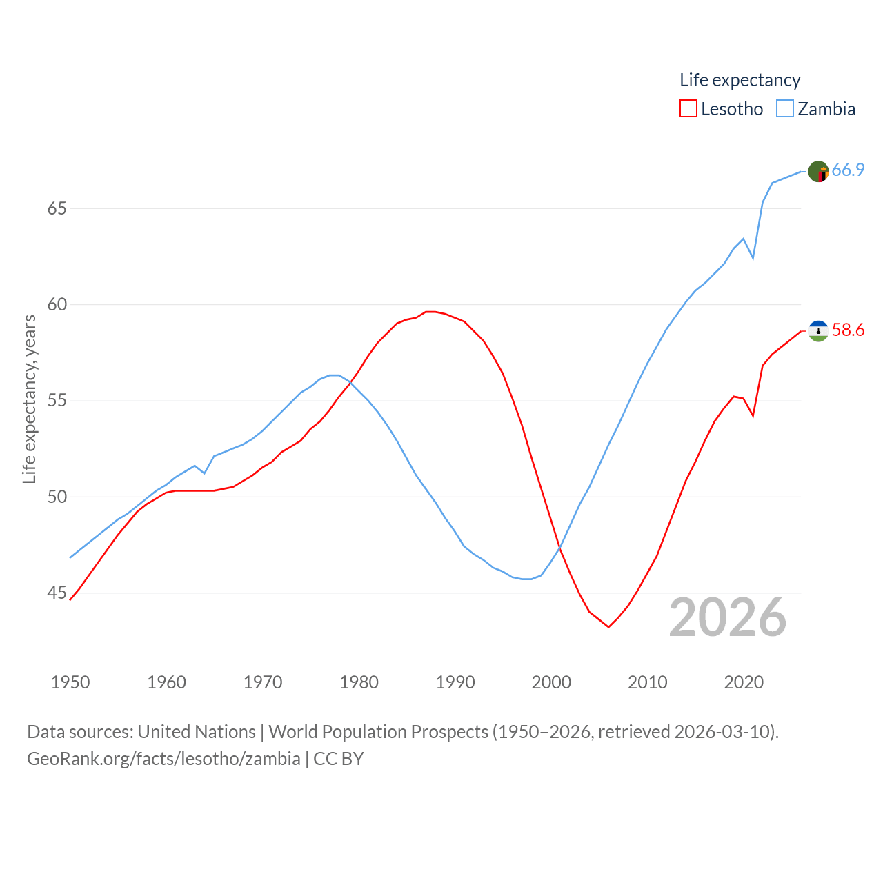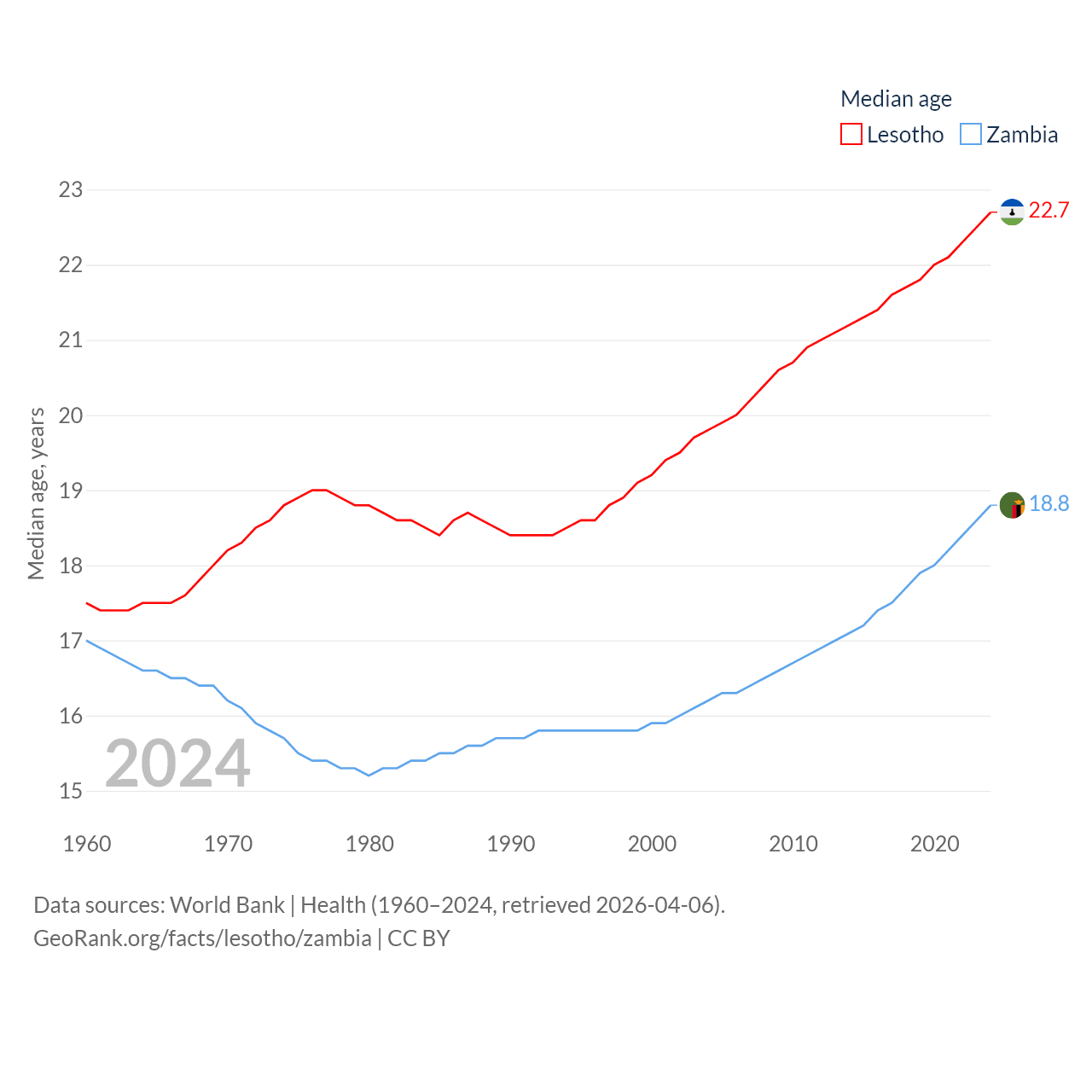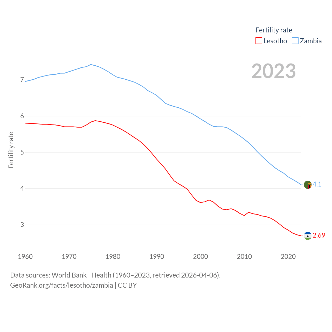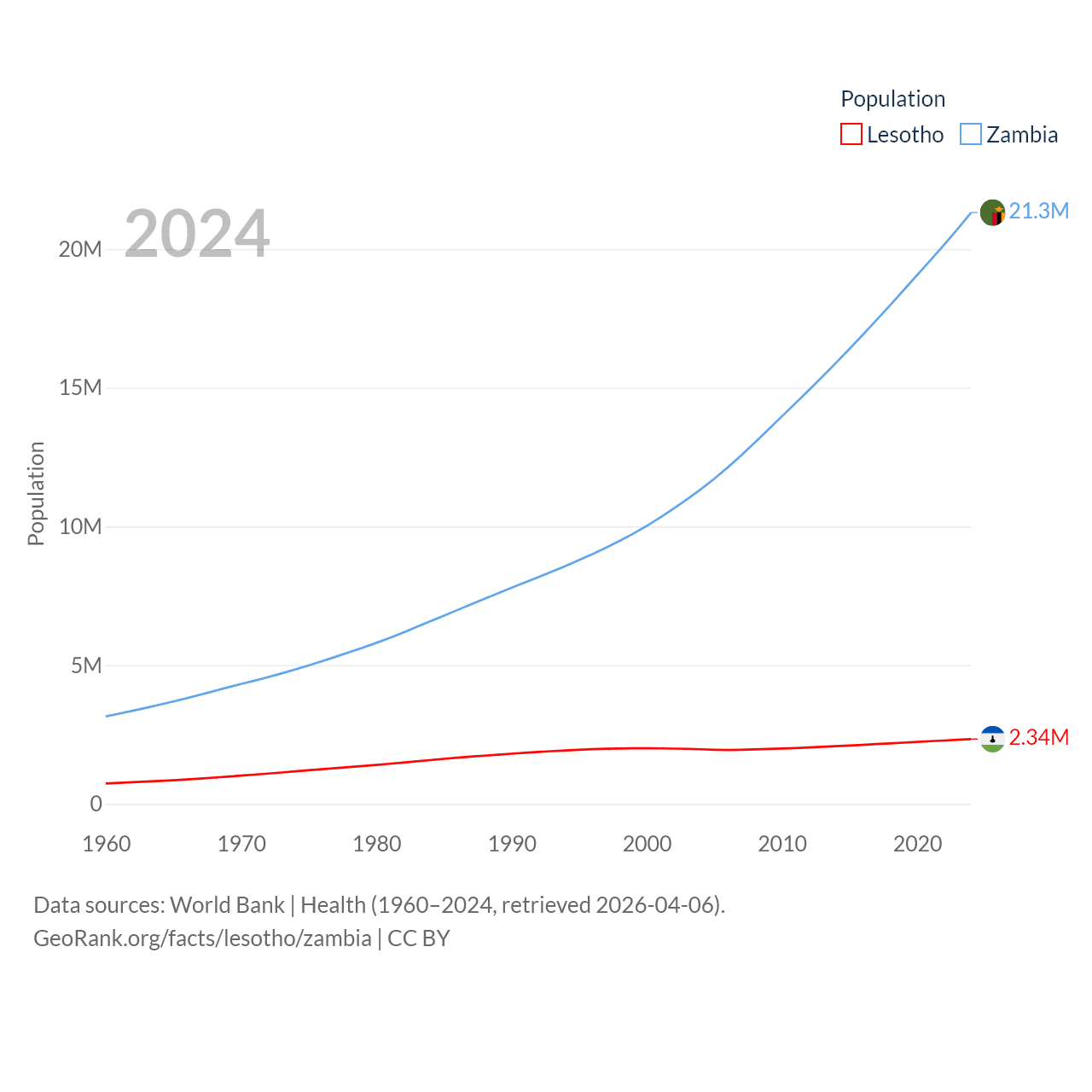 Lesotho has a population of 2.34M (ranked 145/197), compared with 21.3M in Zambia (ranked 63/197). Lesotho's land area is 11,722 sq mi versus 287,024 sq mi for Zambia (ranked 137th vs. 37th).