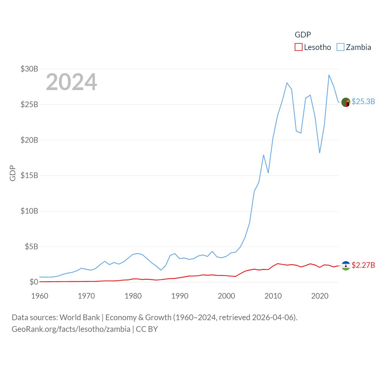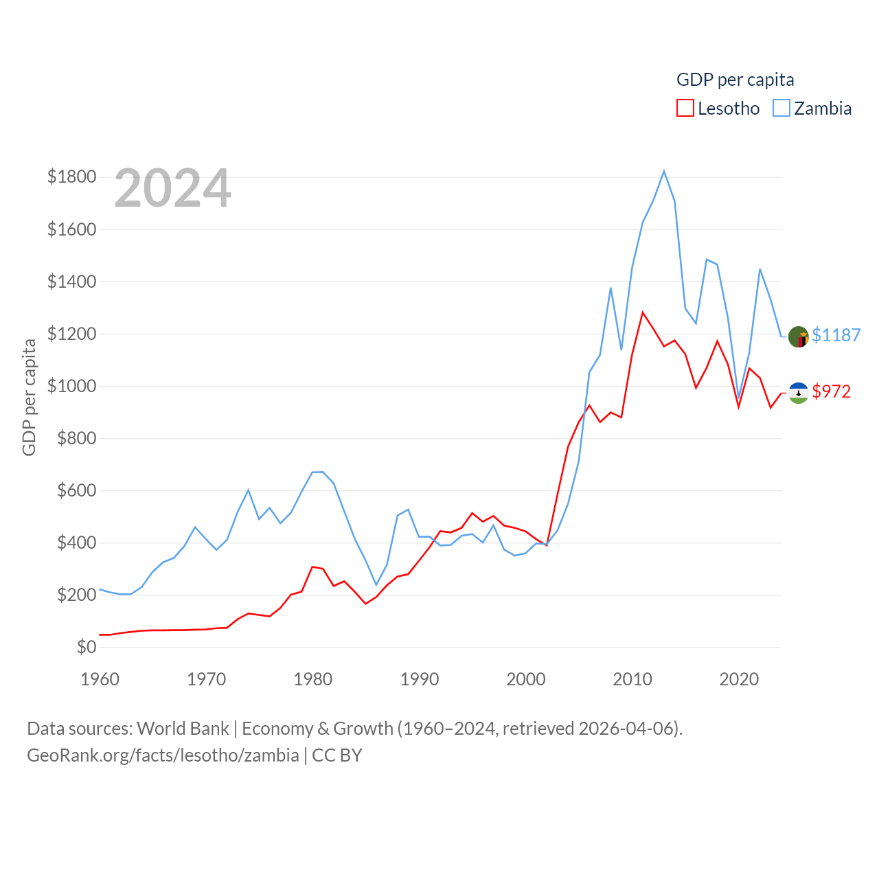 By GDP, Lesotho ranks 175/197 ($2.27B) and Zambia ranks 116/197 ($25.3B). By GDP per capita, Lesotho ranks 181/197 ($972), while Zambia ranks 169/197 ($1,187).