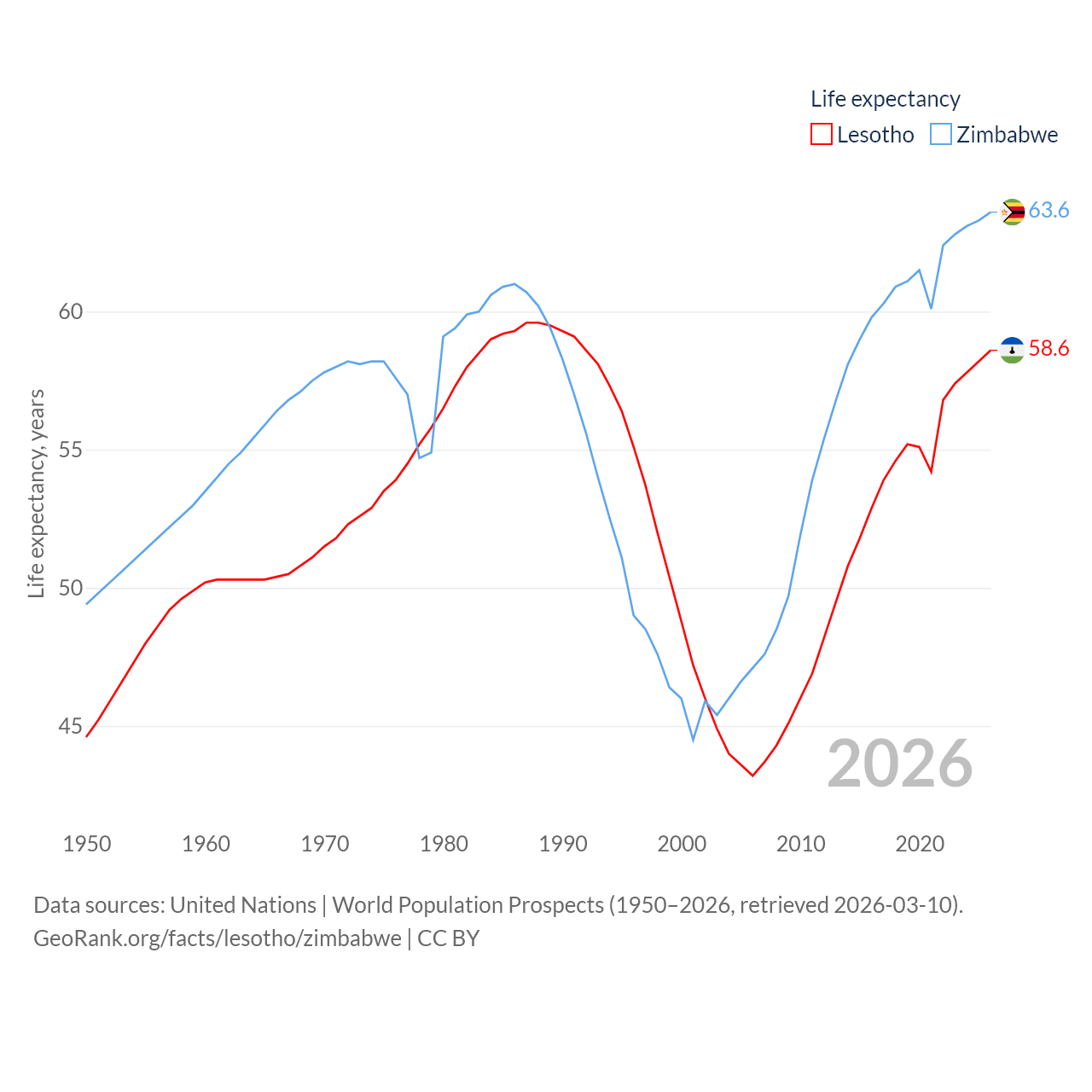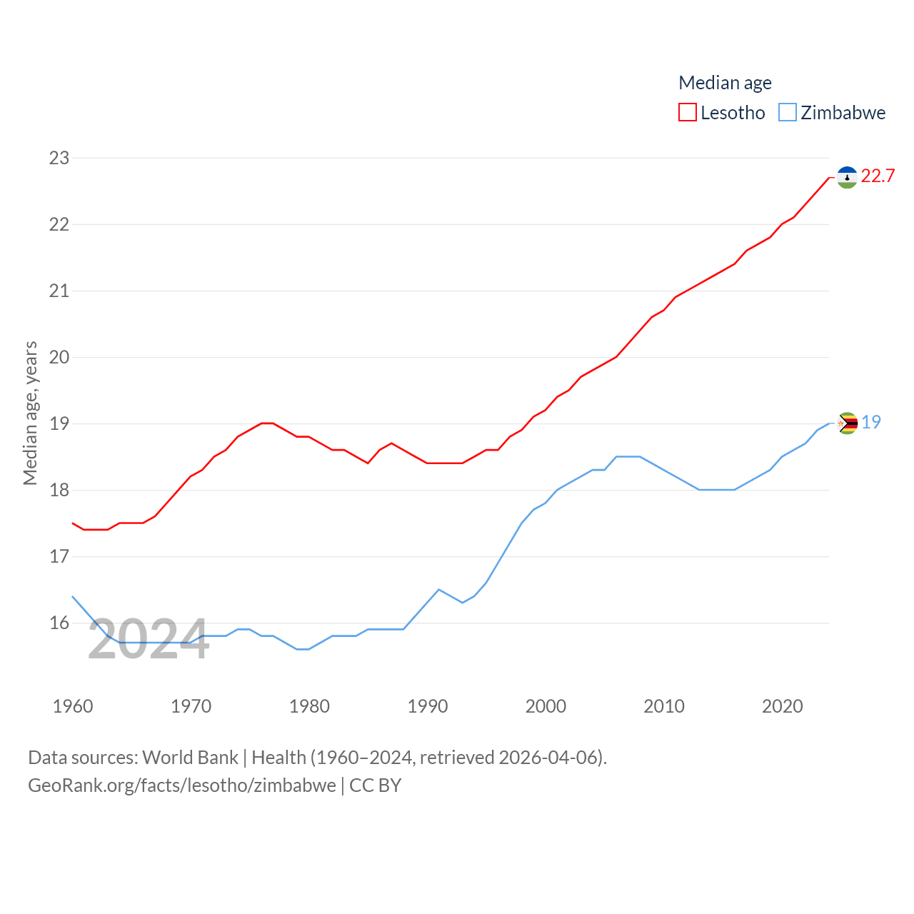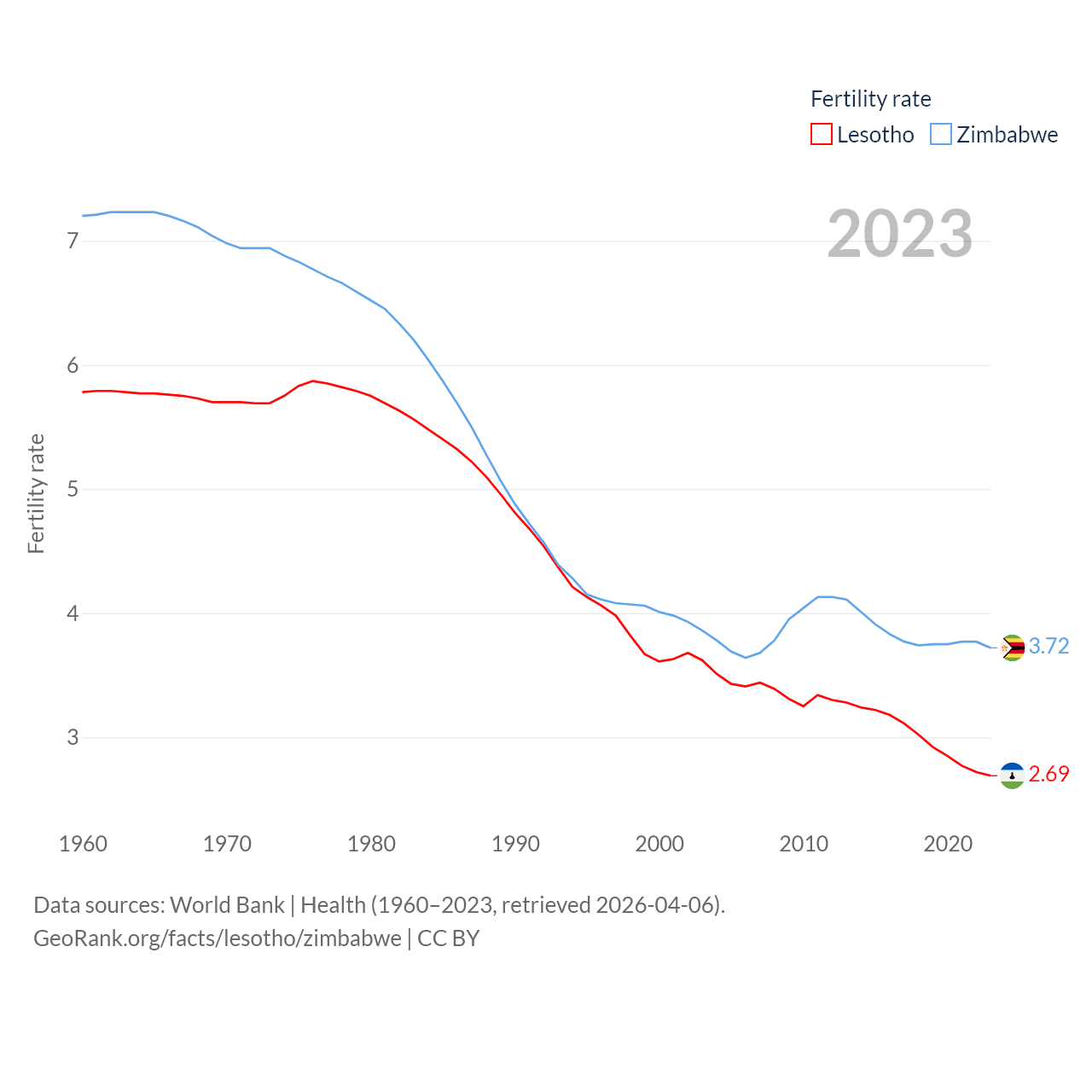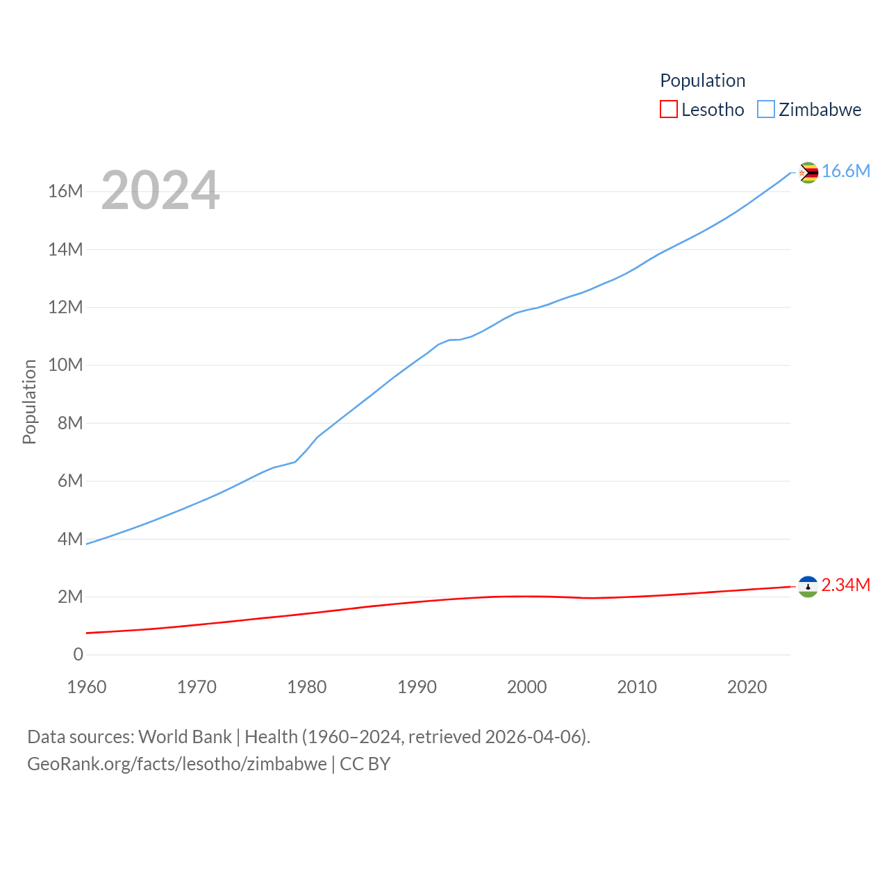 Lesotho has a population of 2.34M (ranked 145/197), compared with 16.6M in Zimbabwe (ranked 74/197). Lesotho's land area is 11,722 sq mi versus 149,364 sq mi for Zimbabwe (ranked 137th vs. 60th).