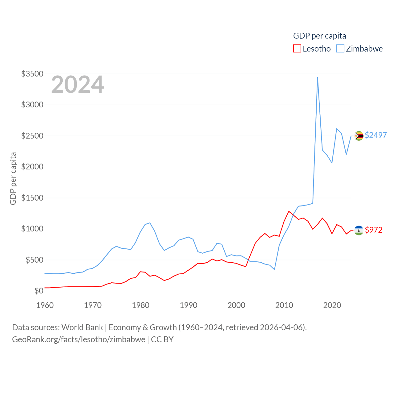 By GDP, Lesotho ranks 175/197 ($2.27B) and Zimbabwe ranks 102/197 ($41.5B). By GDP per capita, Lesotho ranks 181/197 ($972), while Zimbabwe ranks 148/197 ($2,497).