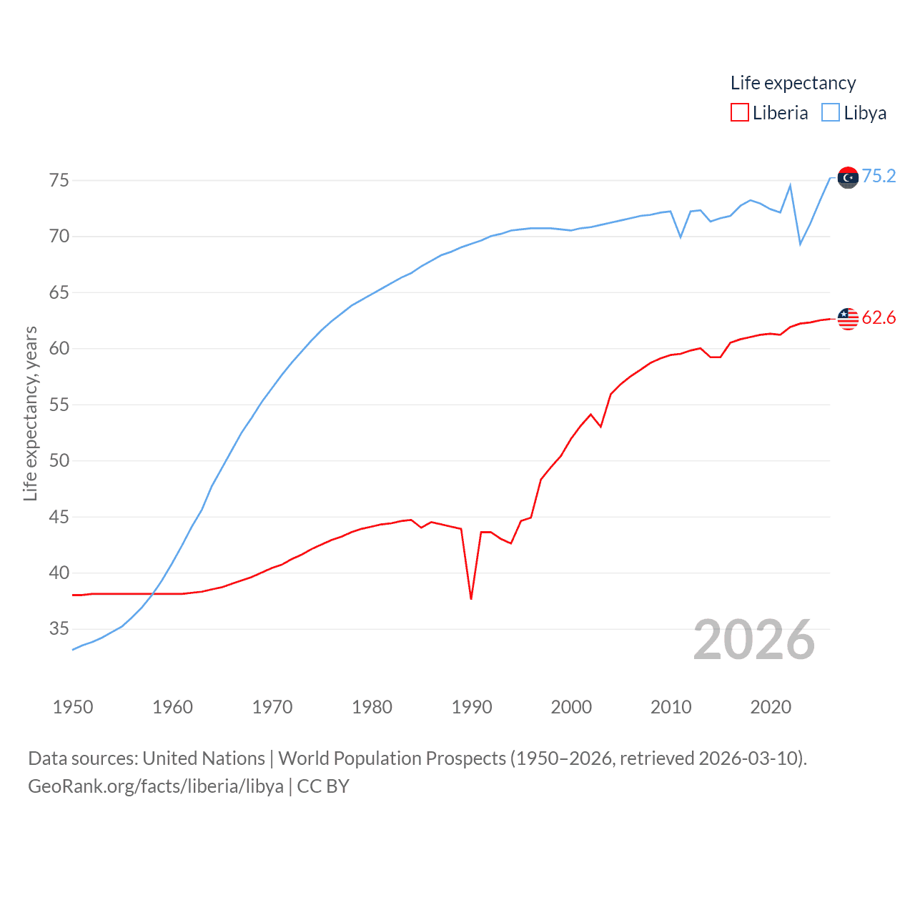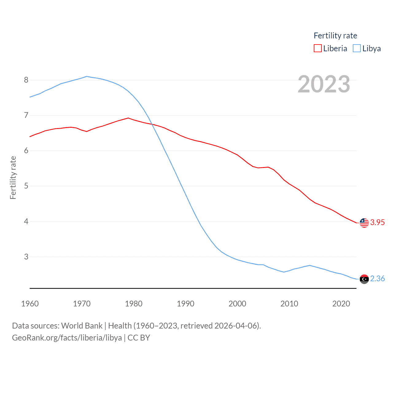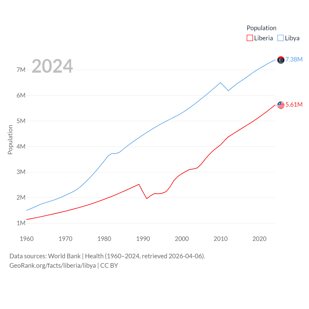 Liberia has a population of 5.61M (ranked 117/197), compared with 7.38M in Libya (ranked 105/197). Liberia's land area is 37,189 sq mi versus 679,362 sq mi for Libya (ranked 106th vs. 16th).