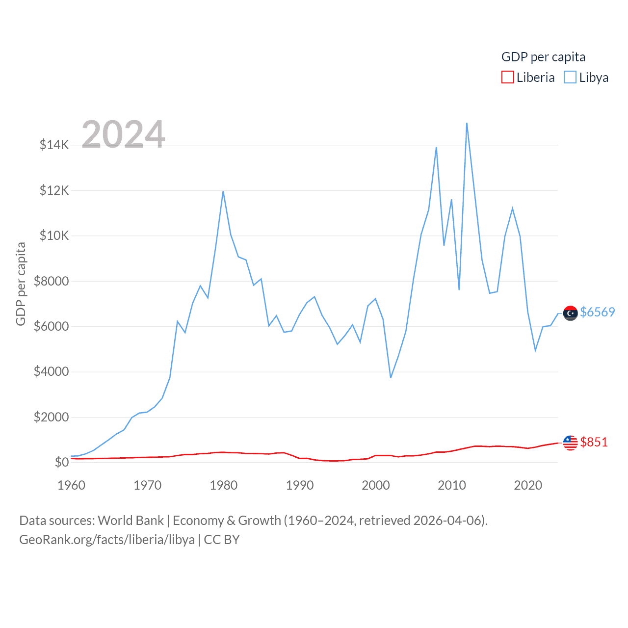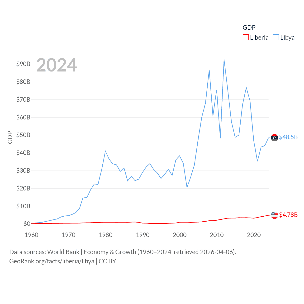 By GDP, Liberia ranks 163/197 ($4.78B) and Libya ranks 95/197 ($48.5B). By GDP per capita, Liberia ranks 184/197 ($851), while Libya ranks 107/197 ($6,569).