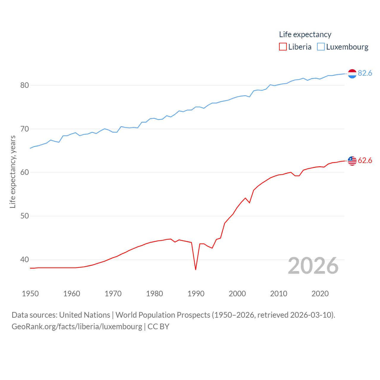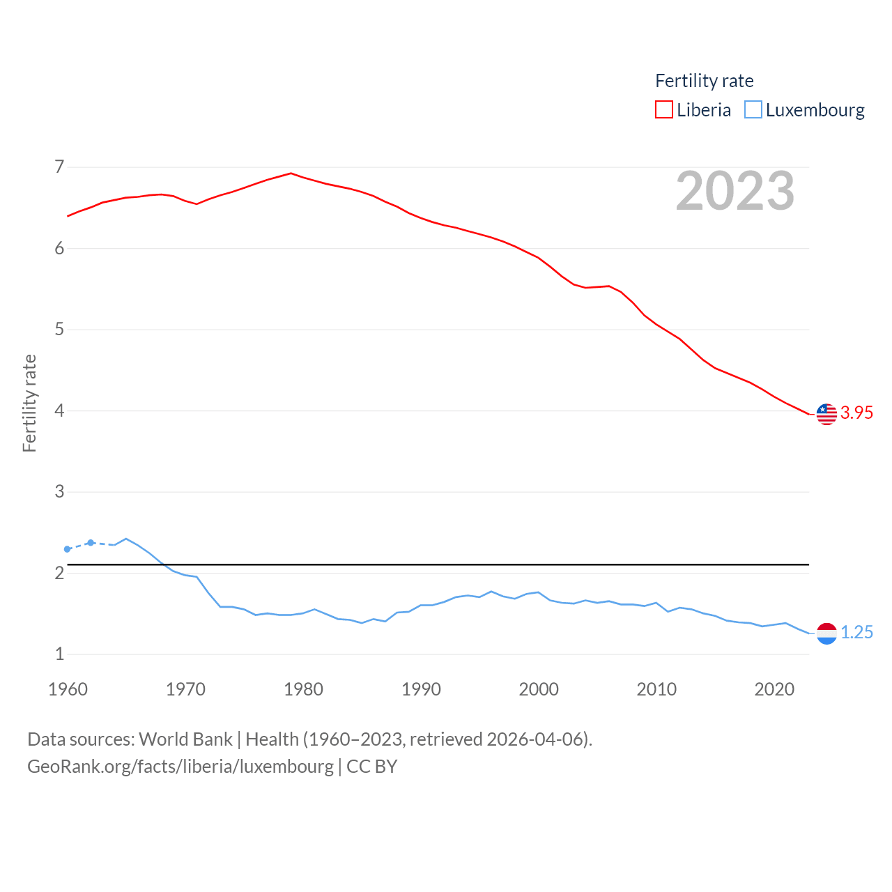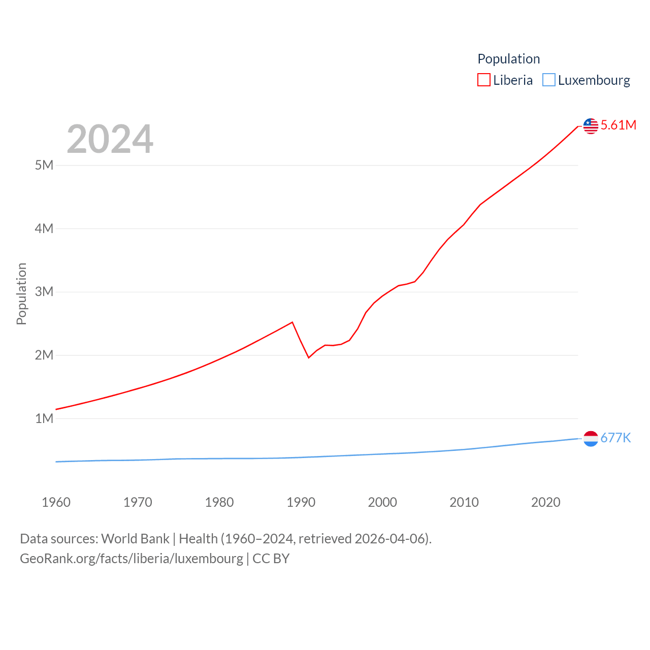 Liberia has a population of 5.61M (ranked 117/197), compared with 677K in Luxembourg (ranked 164/197). Liberia's land area is 37,189 sq mi versus 994 sq mi for Luxembourg (ranked 106th vs. 169th).