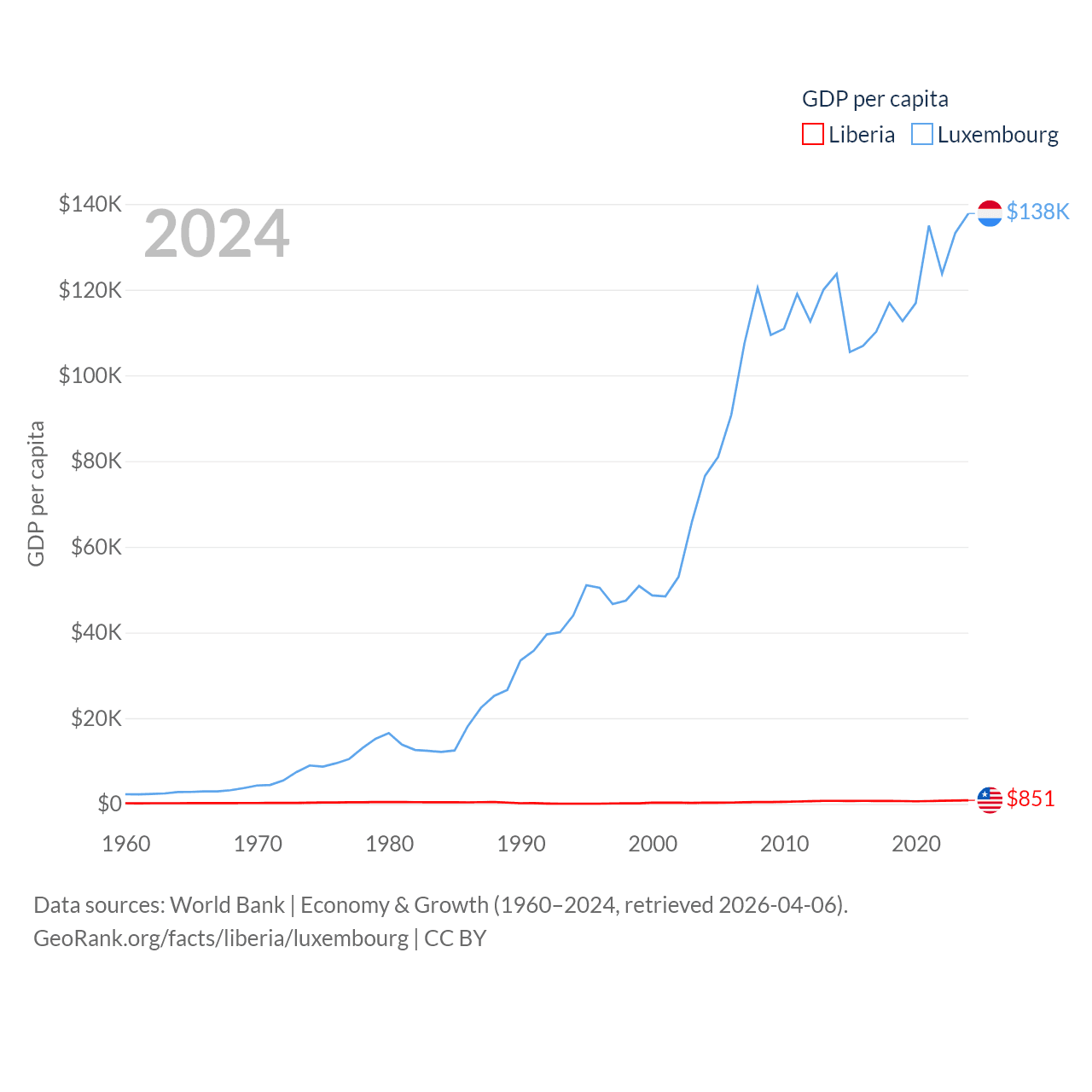 By GDP, Liberia ranks 163/197 ($4.78B) and Luxembourg ranks 74/197 ($93.3B). By GDP per capita, Liberia ranks 184/197 ($851), while Luxembourg ranks 3/197 ($137,782).