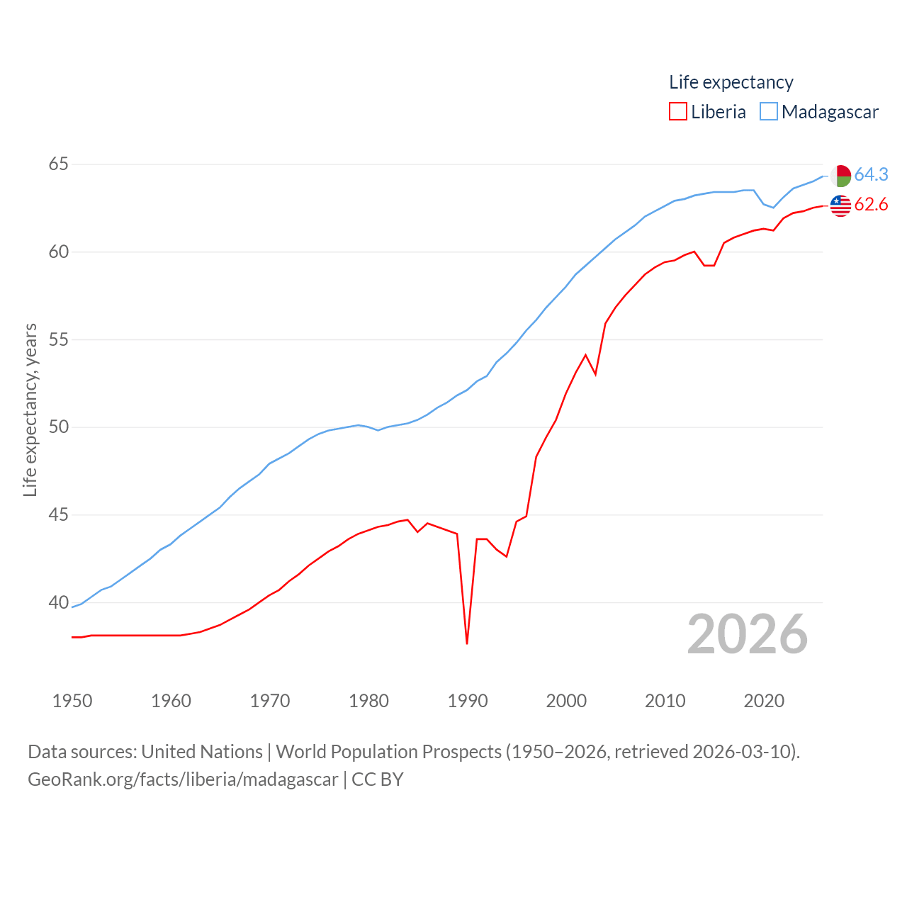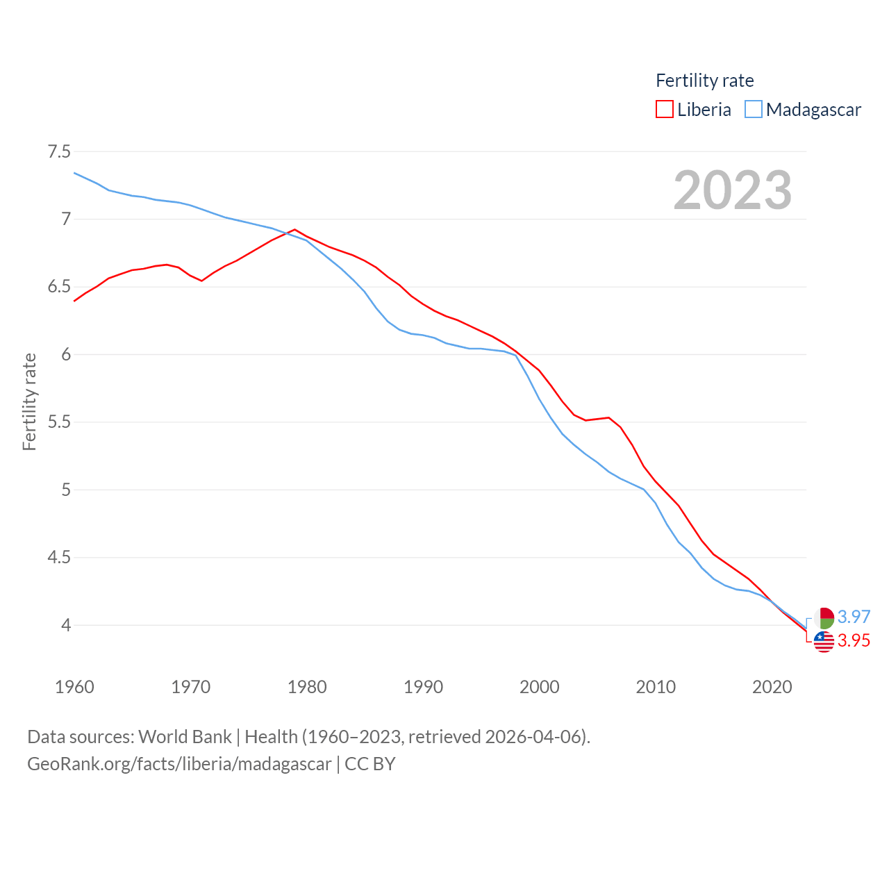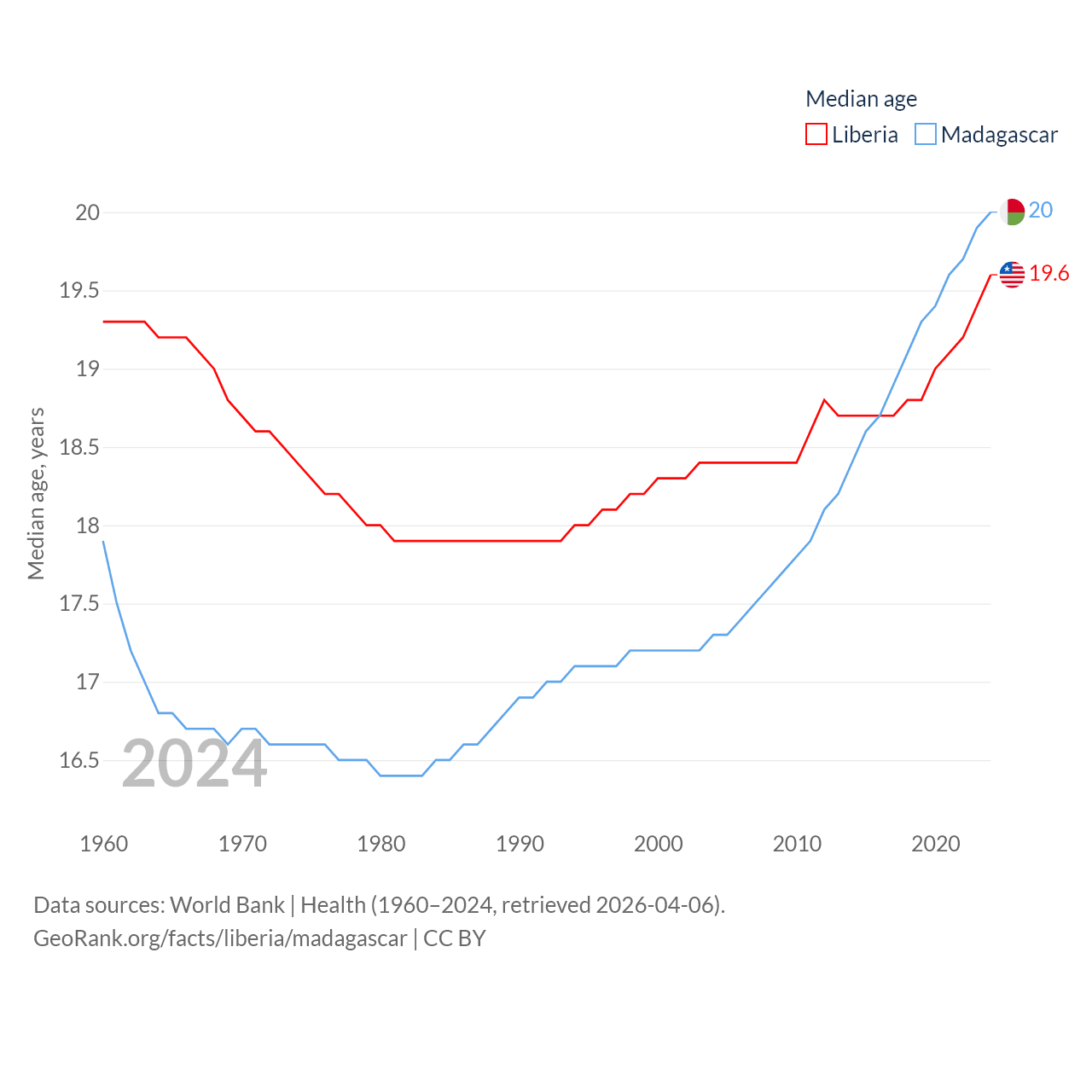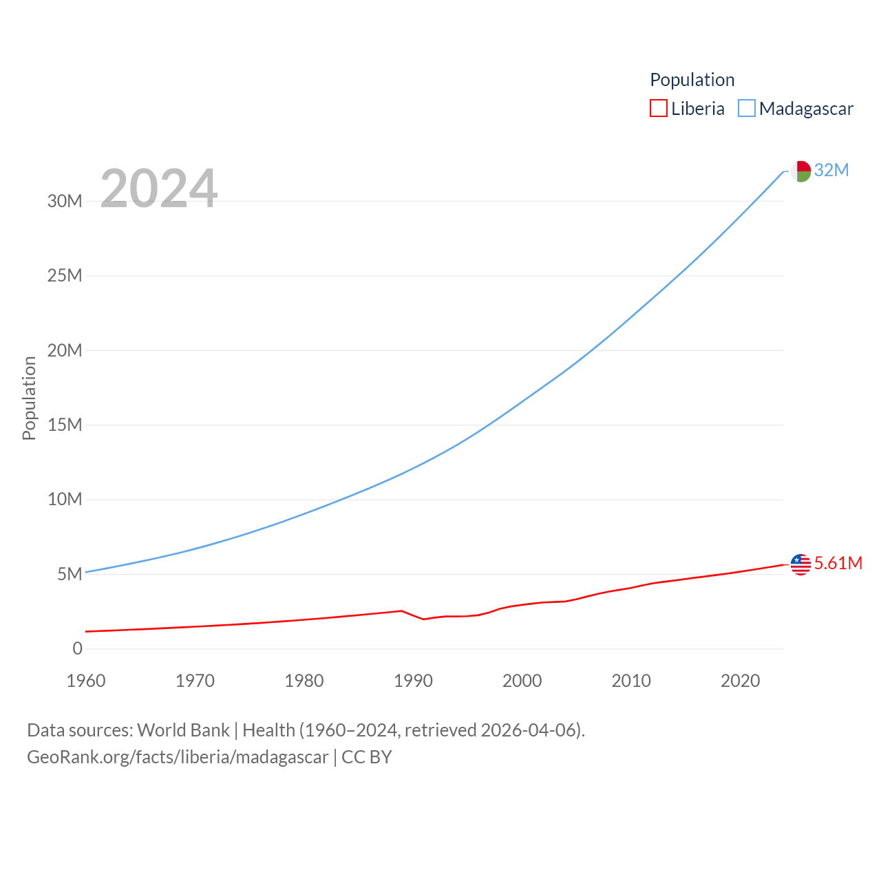 Liberia has a population of 5.61M (ranked 117/197), compared with 32M in Madagascar (ranked 49/197). Liberia's land area is 37,189 sq mi versus 224,634 sq mi for Madagascar (ranked 106th vs. 44th).